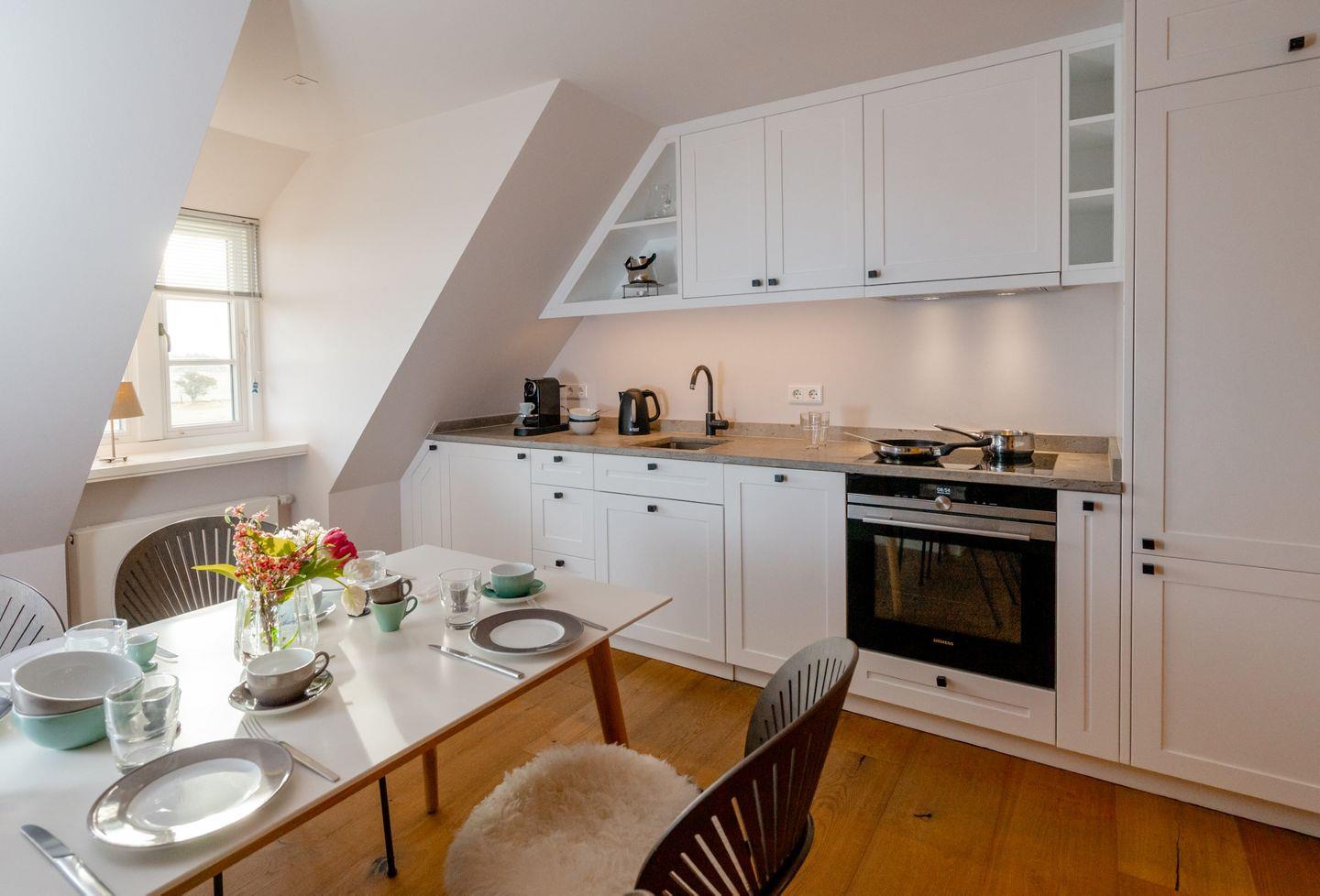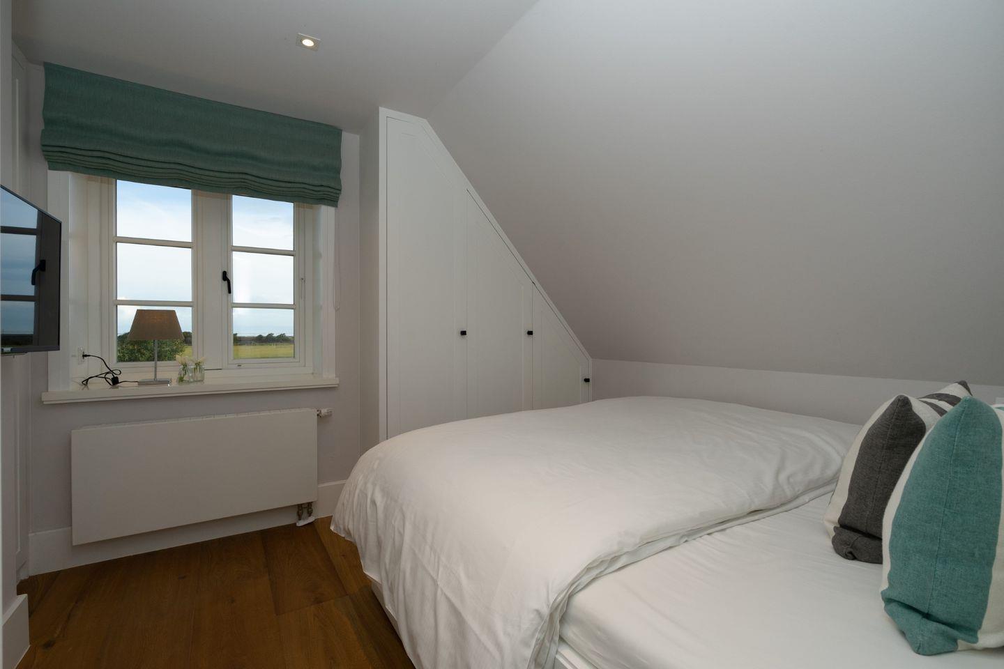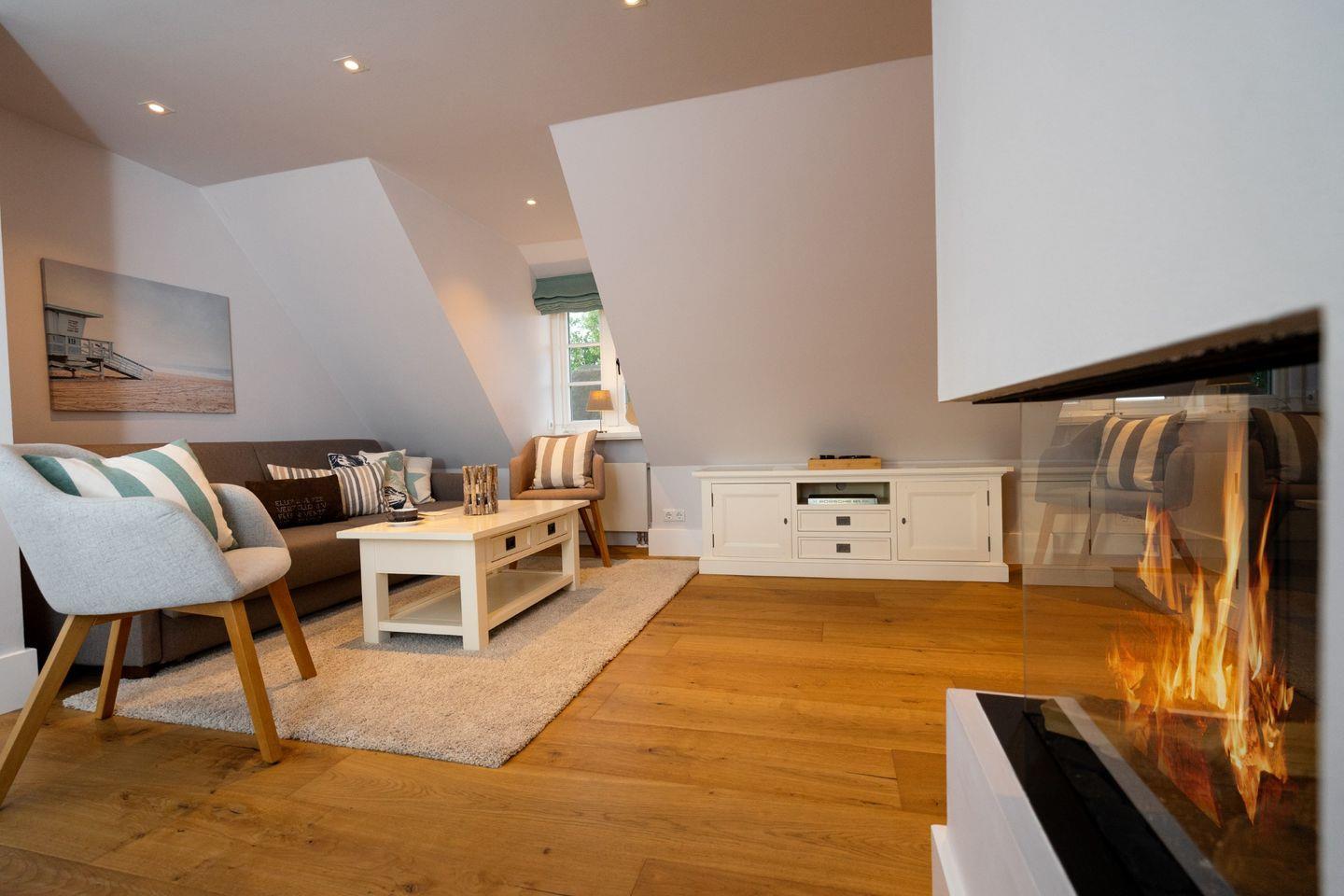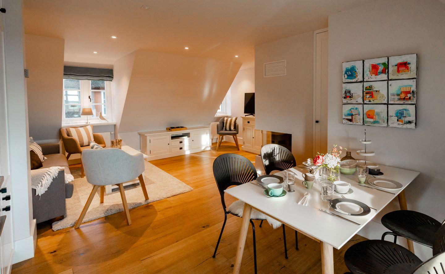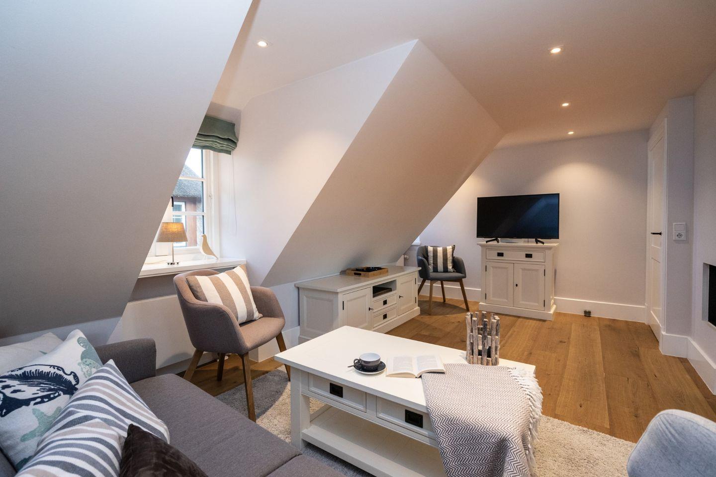 Die charmante Ferienwohnung "Pauenhuus" liegt im Obergeschoss eines historischen Reetdachhofs am Ortsrand von Archsum. Aus den Fenstern genießen Sie traumhafte Ausblicke über die Wiesen, bis aufs nah gelegene Wattenmeer. Hochwertige Materialien, wie z.B. Eichendielen und Naturstein sorgen für ein ganz besonderes Wohngefühl. Der großzügige Wohnbereich mit offener Küche und Essbereich ist mit einem Gas-Kamin ausgestattet. Zur Wohnung gehört ein geschützter Terrassenplatz in Südausrichtung mit Strandkorb und Weitblick. Maximal ein Hund auf Anfrage ist gestattet.