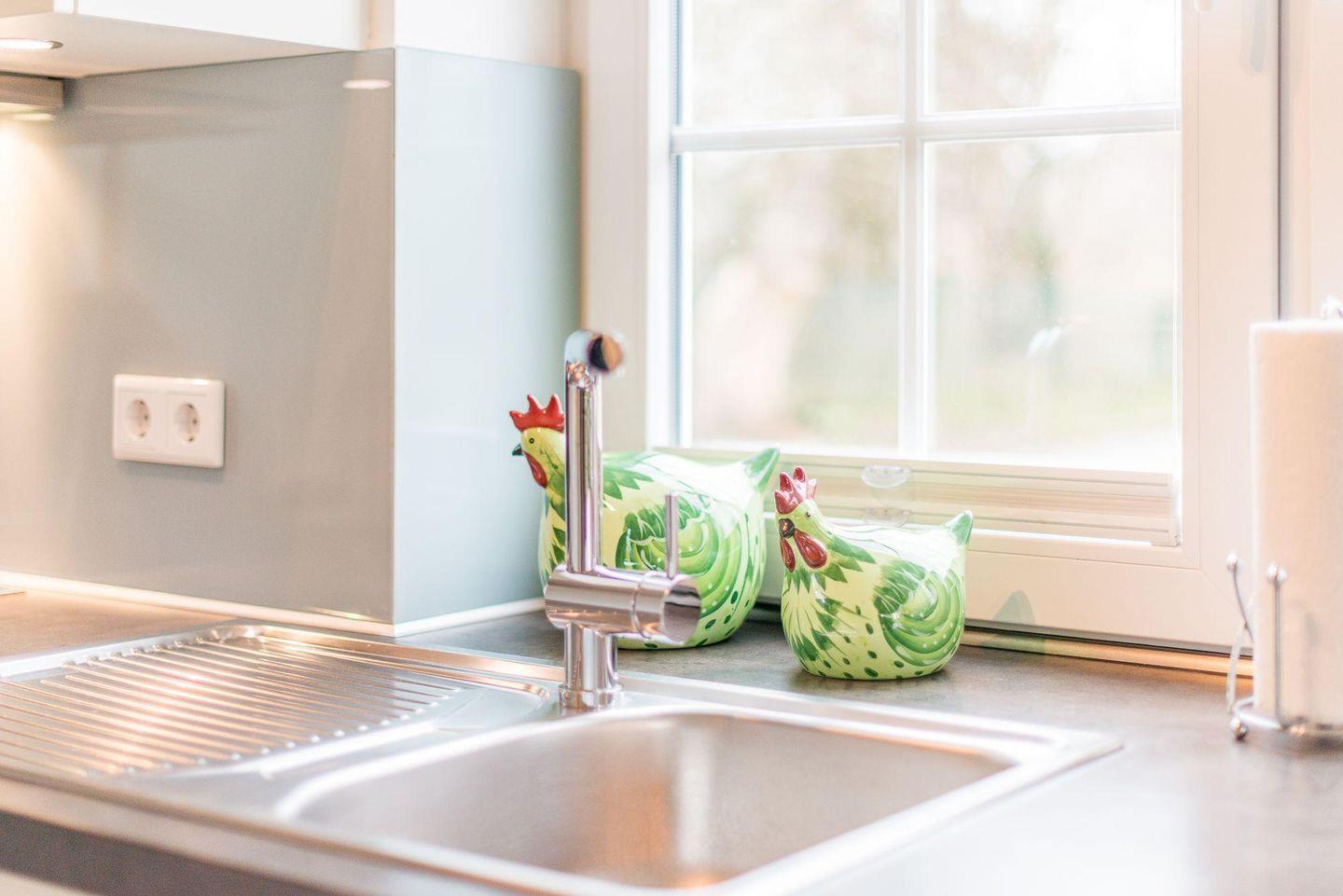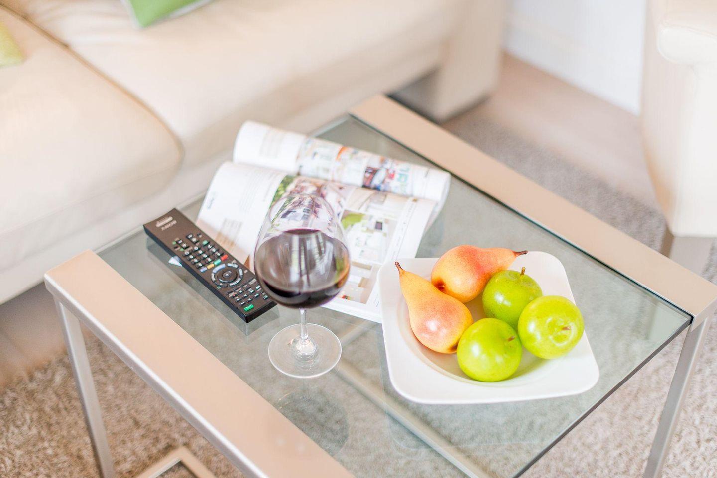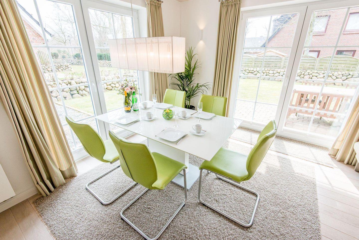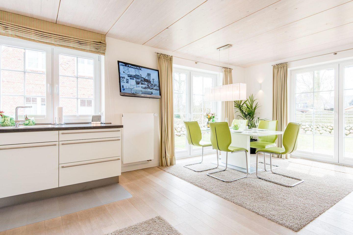 Das helle Wohnzimmer ist mit einem großen Ecksofa, einem Sessel, einem Esstisch für 5 Personen und einem TV ausgestattet. Vom Wohnzimmer haben Sie direkten Zugang zur möblierten Süd-Terrasse und zum gepflegten Garten mit Strandkorb – ideal für sonnige Nachmittage im Freien.