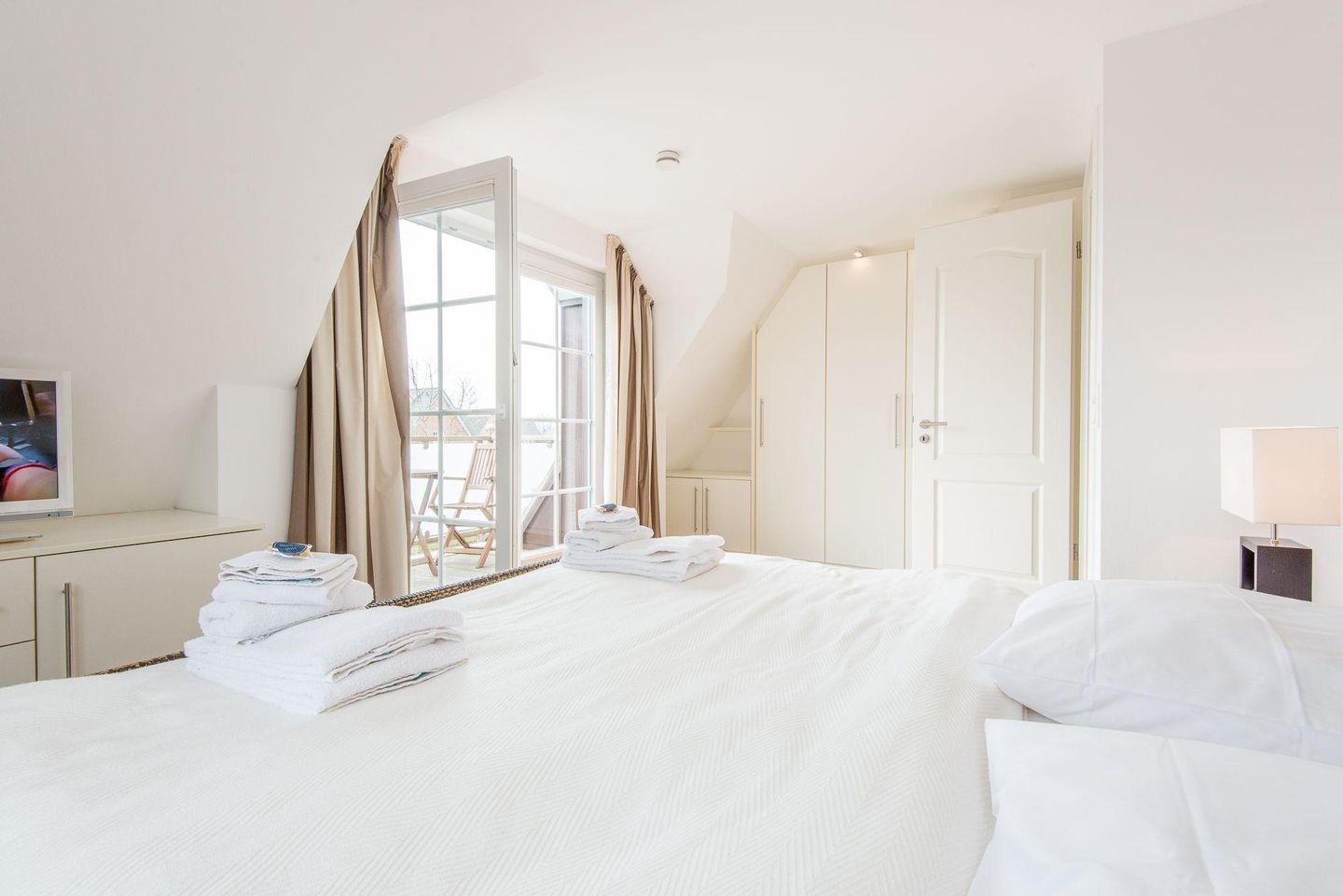 Das erste Schlafzimmer verfügt über ein Doppelbett (2x 90x200 cm), einen Einbauschrank, TV und direkten Zugang zum möblierten Balkon nach Süden. Das zweite Schlafzimmer ist mit zwei Einzelbetten (je 100x200 cm), einem Einbaueckschrank, einem Schreibtisch und einem Stuhl ausgestattet, ideal für Familien oder Freunde.