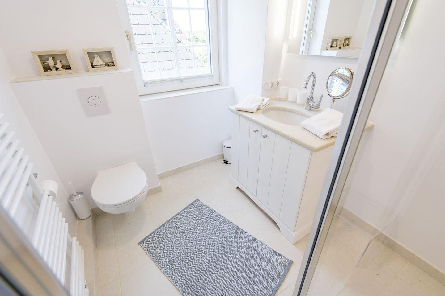 Das stilvolle Badezimmer ist mit Natursteinfliesen gestaltet und verfügt über eine bodengleiche Dusche, WC und Tageslicht. Ein Ort zum Frischmachen und Entspannen – perfekt, um den Tag angenehm zu beginnen oder entspannt ausklingen zu lassen.