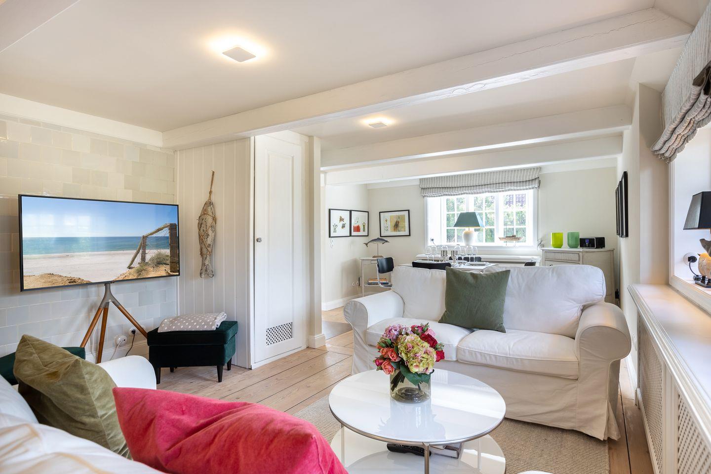 EG: Wohnraum mit TV und Kachelofen, Essbereich, offene Küche mit Microwelle-Backofen-Kombi, Geschirrspüler, Induktionsherd, Nespresso-Maschine, SodaStream, Duschbad, Terrasse mit Gartenmöbeln und Strandkorb (April-Oktober).