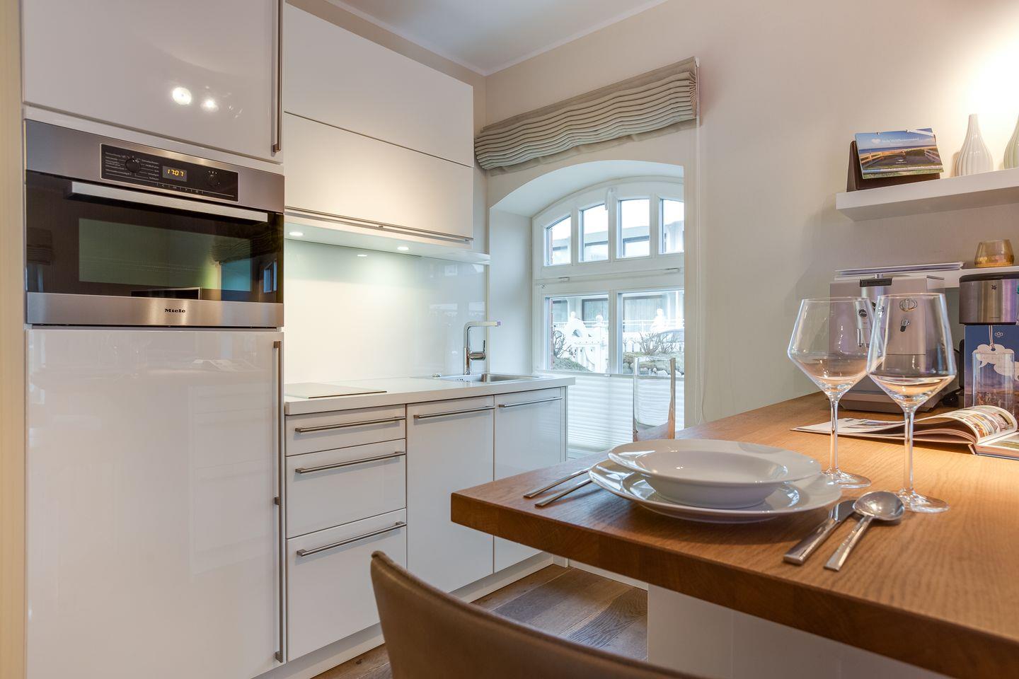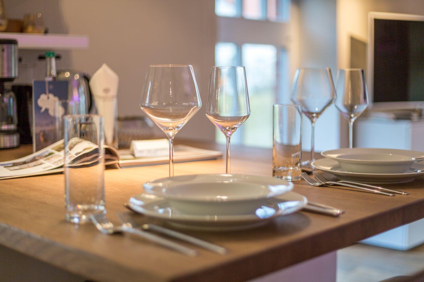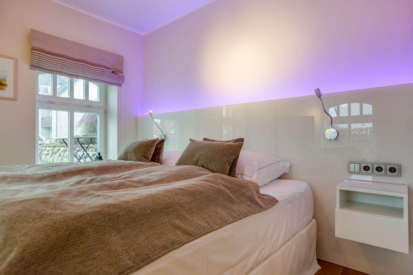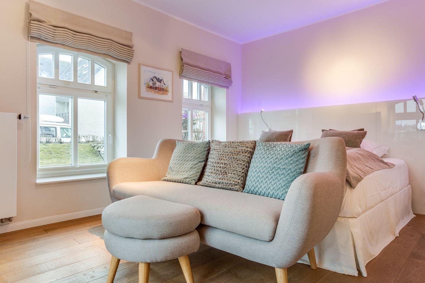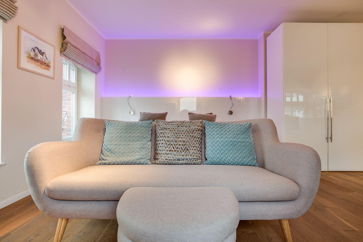Details wie alleine drei (!) Lichtangebote Ihres kuscheligen Bettes (für die Nacht: Fußbodenorientierungslicht unter beiden Nachttischen; zum Lesen: flexibel ausrichtbare LED-Spots; zum Chillen und Genießen: ambientes, changierendes LED-Licht im Kopfteil Ihres Bettes integriert), der eigens angefertigte Küchentresen und gleichzeitig kommunikatives Herz Ihres Domizils oder Ihr XXL-Samsung Flat-TV schaffen für Sie eine neue, frische Formel des Sylt-Urlaubens: