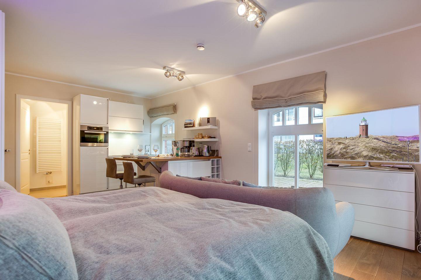 Mit sehr viel Liebe zum Detail ausgestattetes, kombiniertes Wohn-/Schlafzimmer mit XXL-Samsung Flat-TV, WLAN 50VDSL, Loewe-Hifianlage und T-Home Entertain. iPod-Dock, Apple-TV und DVD/Blu-Ray-Player. Großzügiges Boxspring-Bett (1,80x2,00m-Matratzen durchgehend) der 5-Sterne-Hotelkette "Westin". Offene Design-Küchenzeile mit Küchentresen, der gleichzeitig als Ihr kommunikatives Zentrum und Essecke dient. Geschirrspüler, JURA Kaffeevollautomat, Induktionsherd sowie Backofen mit kombinierter Mikrowelle. Schönes Wohlfühlbad mit großzügiger Dusche, Waschtisch und WC. Umlaufende Süd-Ost Terrasse mit Gartenmöbeln und Strandkorb (ca. von April-Oktober) sowie kleinem, seitlichen Blick zu den Westerländer Dünen.