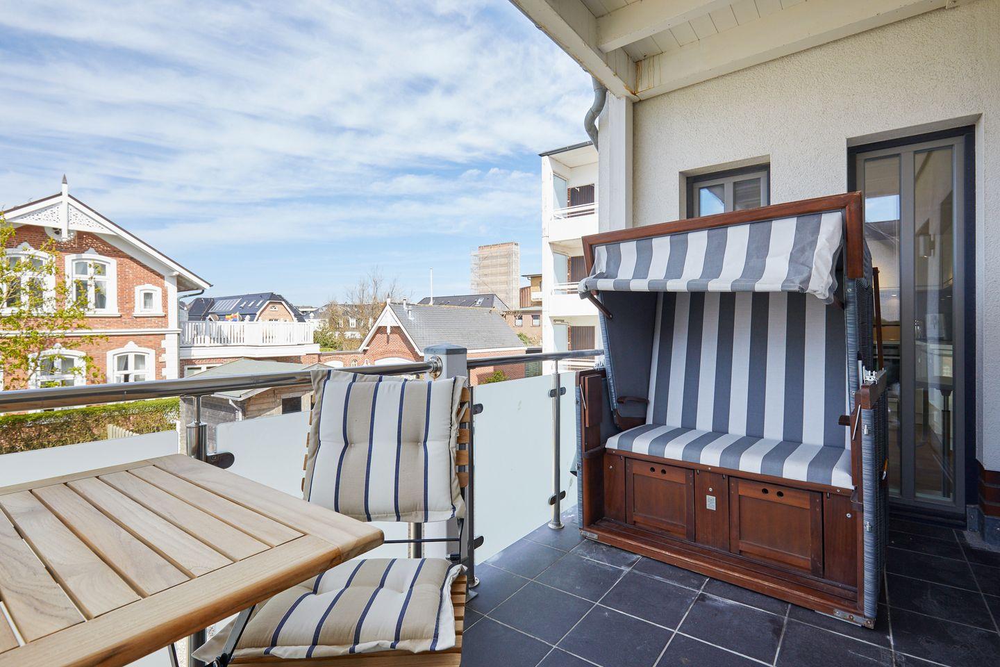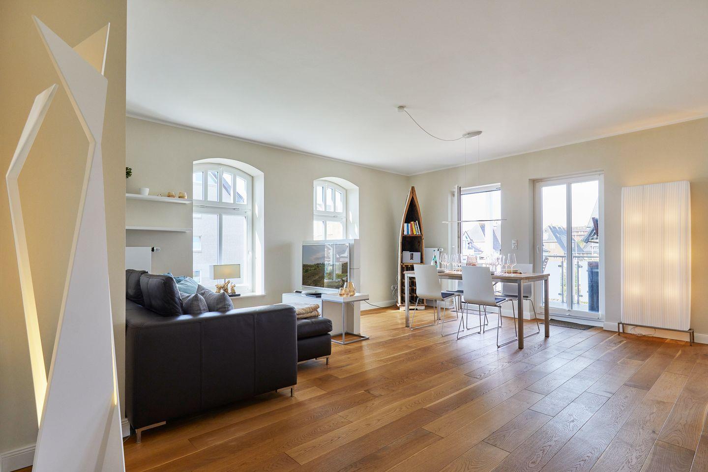 Sehr schön und hochwertig designter, sehr großzügiger Wohn-Essbereich, optisch durch ein TV-Board geschickt voneinander getrennt. Annehmlichkeiten wie eine Bose-Soundbox, VDSL50 und T-Home Entertain bleiben Ihnen hier ebenfalls nicht verwehrt. Viele Fensterflächen schaffen eine lichtdurchflutete Wohlfühlatmosphäre. Design-Mobiliar und -Accessoires in der gesamten Ferienwohnung. Sonniger Süd-Westbalkon in (für Sylter Verhältnisse :-)) windgeschützter Loggia-Ausprägung. Wertiges Gartenmobiliar und selbst auf einen Strandkorb müssen Sie auf Ihrem Balkon nicht verzichten. Sehr schöne Blickrichtung bis zu den imposanten Westerländer Dünen.