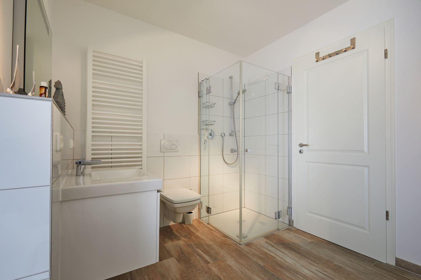 Auch die Raumaufteilung überzeugt und zeugt von kundiger Planerhand. So erreichen Sie Ihr großes Design-Bad, übrigens mit Wanne und Dusche, sowohl en-Suite aus Ihrem Schlafzimmer, als auch direkt aus dem Dielenbereich zum ersten Händewaschen. Die Luxus-Küche mit Bistrotisch zum ersten Morgencappucino, der Ihnen von Ihrem Jura-Kaffeeautomaten zubereitet wird, wurde optisch geschickt vom Wohn- und Essbereich getrennt, befindet sich aber dennoch im Gesamtraum und trägt so mit zu diesem wunderschön luftigen und großzügigen Raumgefühl bei.