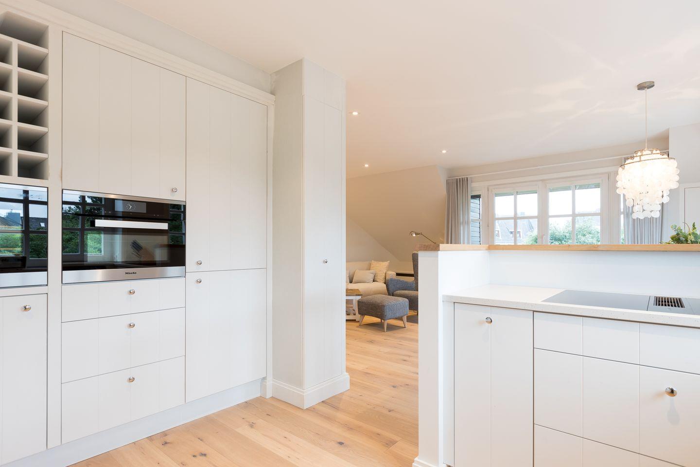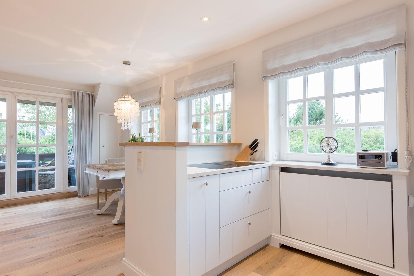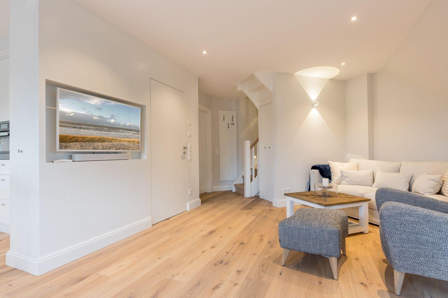 Wohnbereich mit Flatscreen-TV und Sonos-Anlage; offener Ess- und Küchenbereich mit Mikrowellen-Backofen-Kombination, Induktionsherd, Geschirrspülmaschine, Weinkühlschrank, Nespresso-Maschine und Eiswürfelbereiter; Duschbad