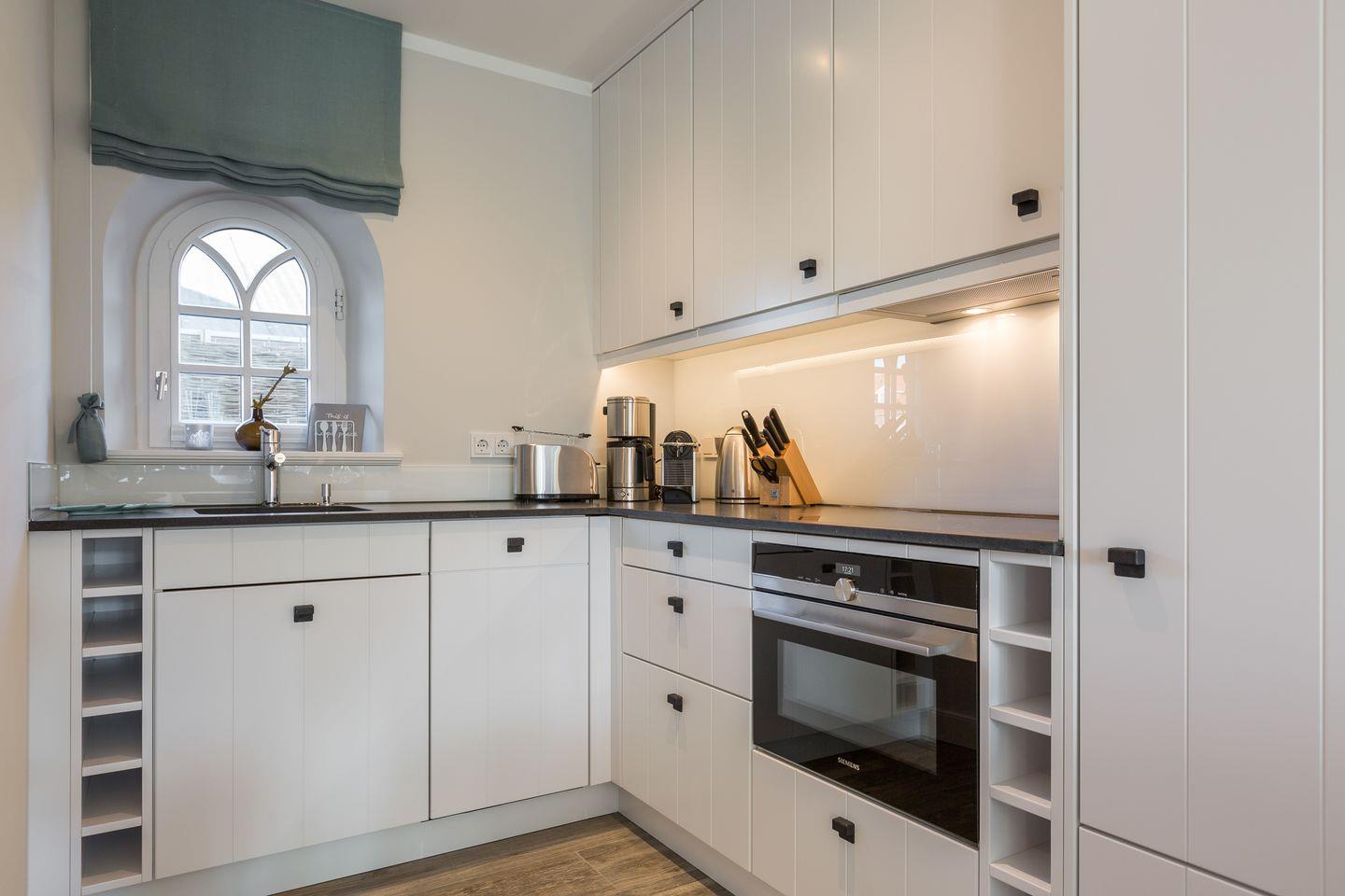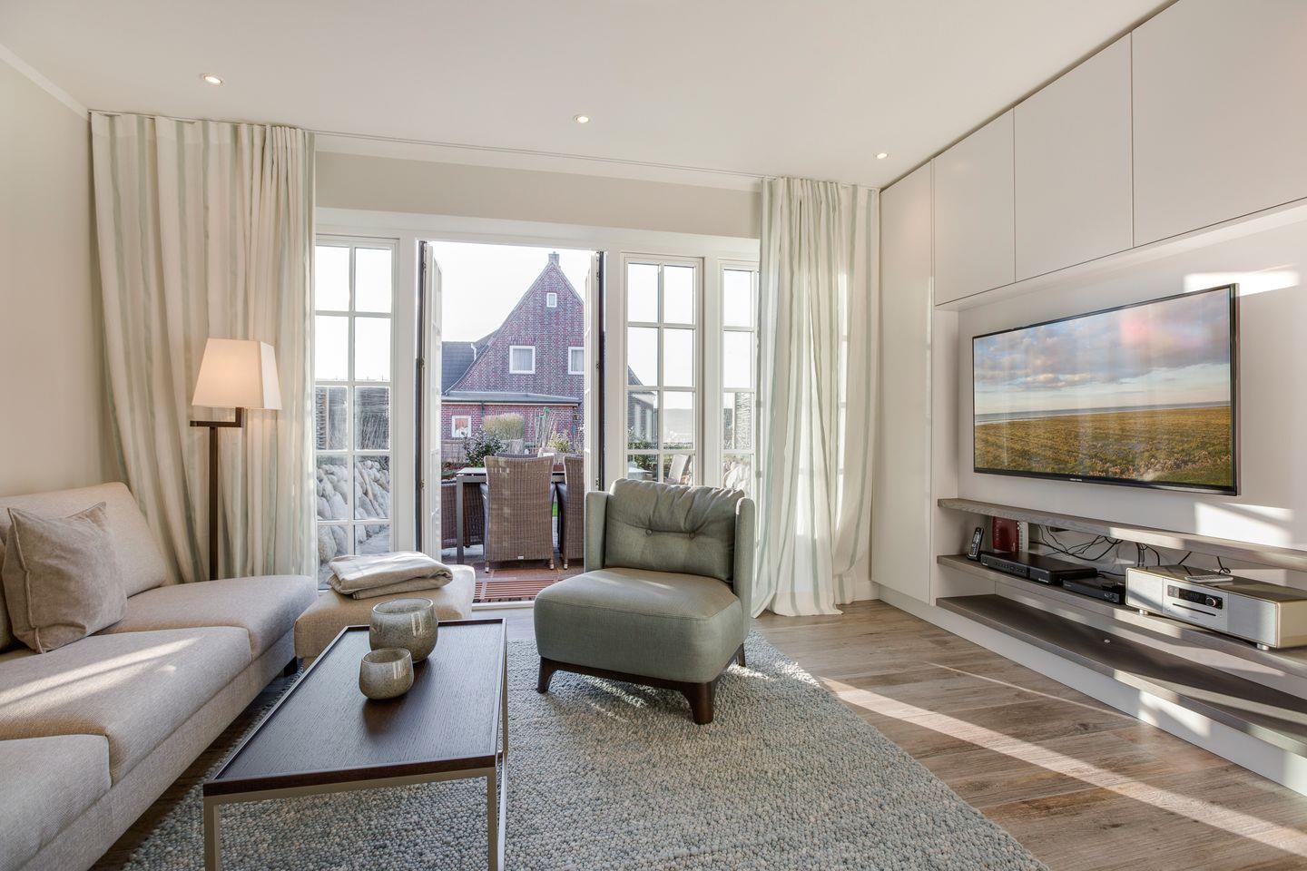 EG: Wohn- und Esszimmer mit Gaskamin, Flatscreen-TV, Blu-Ray-Player, WLAN, Sonoro Hifi-Anlage, integrierte Küchenzeile mit Induktionsherd, Geschirrspüler, komb. Mikrowelle/Backofen, Gäste-WC, Westterrasse mit Gartenmöbeln und Strandkorb.