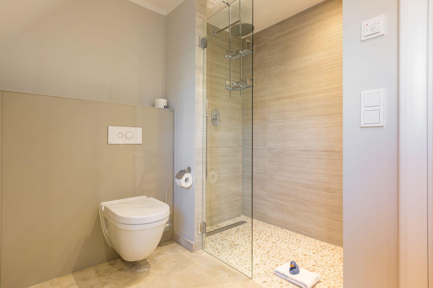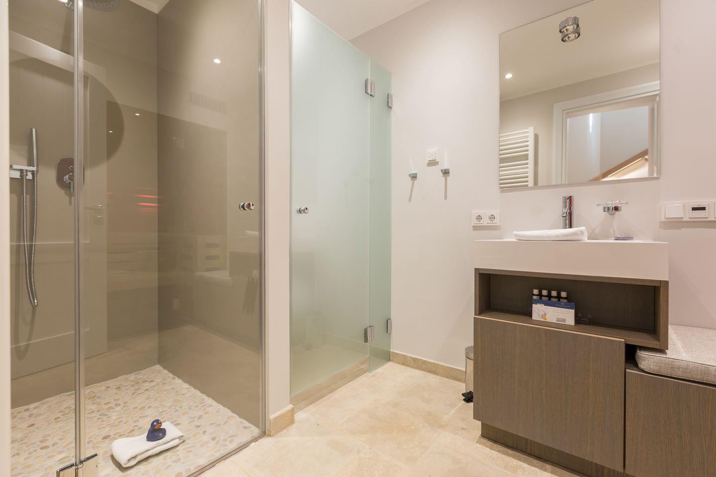 OG: 1 Schlafraum mit Doppelbett (180x200cm) und Ankleide, Flatscreen-TV, großes Bad mit Doppelwaschtisch, WC und einer großen Dusche mit Rainshower