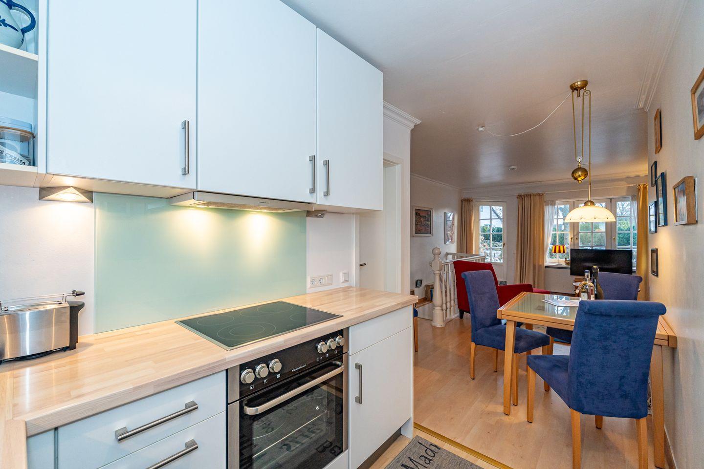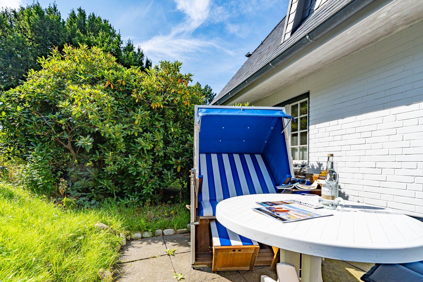 Die gemütliche Ferienwohnung "Hüs Monika" liegt im Herzen von Keitum und erstreckt sich über 2 Ebenen. Im Erdgeschoss erwartet Sie eine offene, moderne Küche mit Geschirrspüler, Mikrowelle, Toaster und Senseo Kaffeemaschine. Der liebevoll eingerichtet Wohn- und Essbereich verfügt über Kabel-TV, Radio und DVD Player. Vom Wohnbereich haben Sie Zutritt zur Terrasse mit Gartenmöbeln und typischen Sylter Strandkorb (nur saisonal) . Ebenfalls ist das Badezimmer mit Dusche und Fön auch auf dieser Ebene. Das Schlafzimmer befindet sich im Untergeschoss der Ferienwohnung (Souterrain).