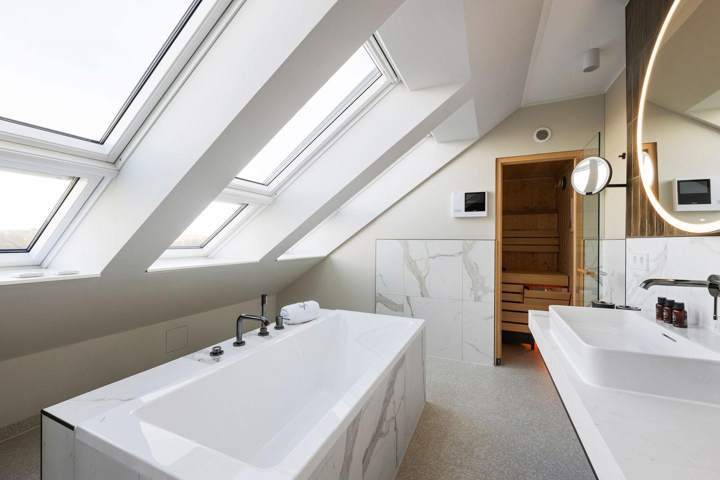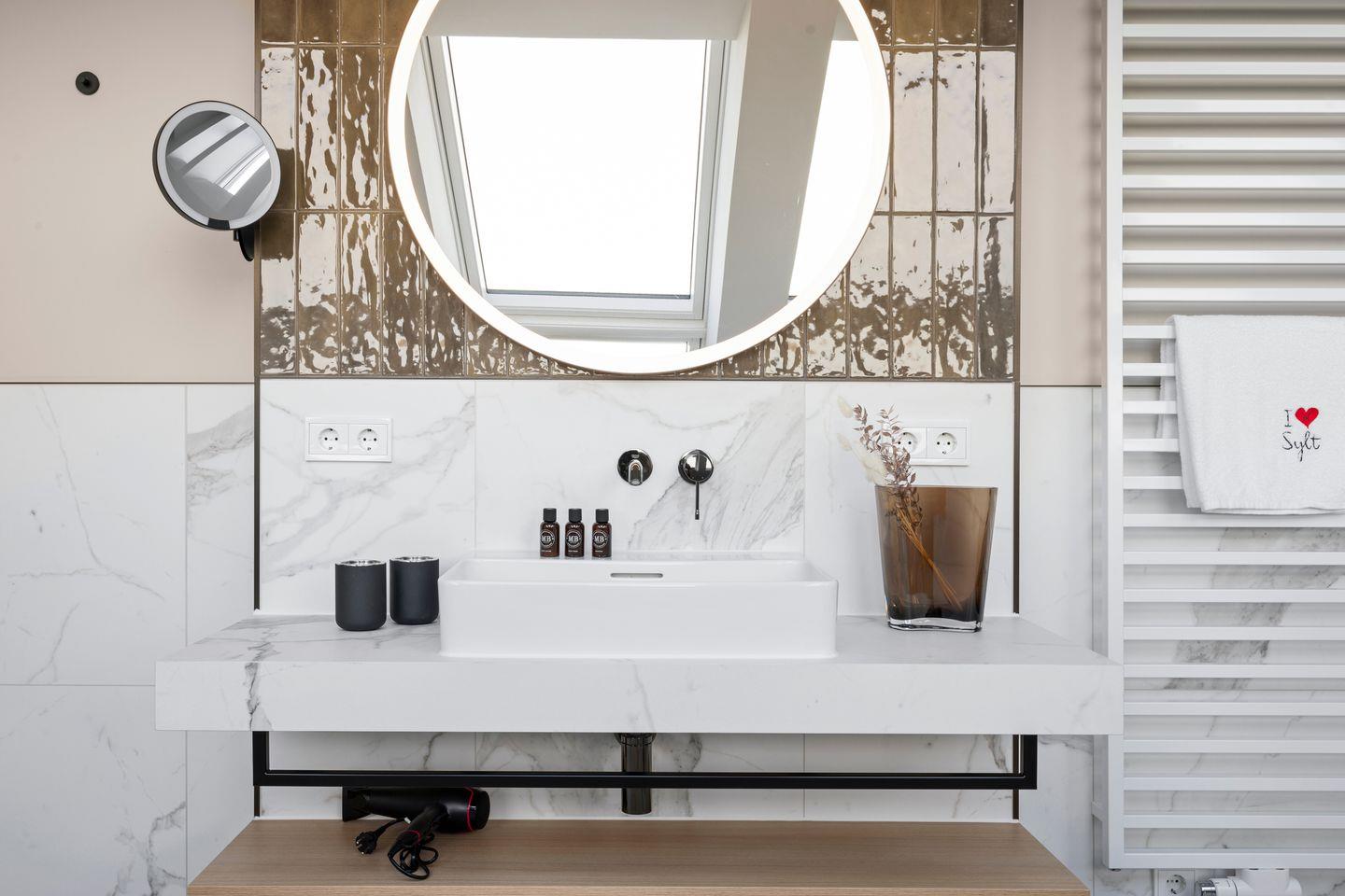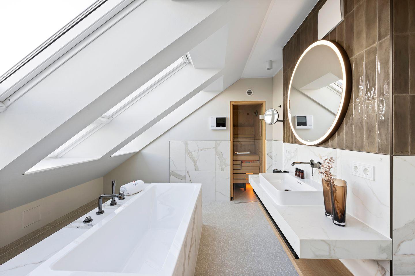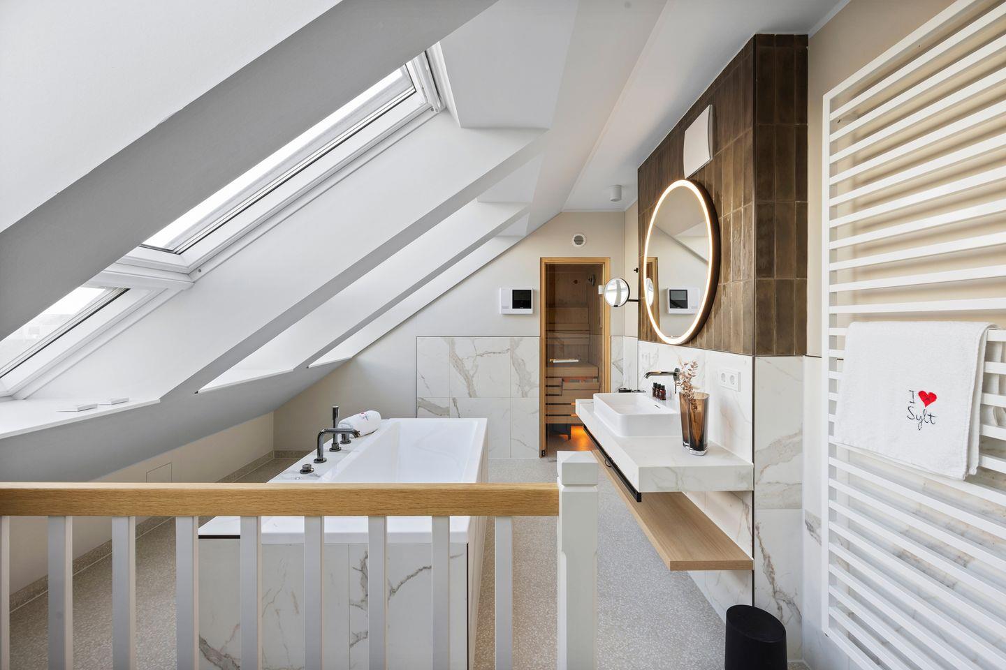 Das großzügige Badezimmer auf der Galerie begeistert mit echtem Wellness-Charakter. Eine freistehende Badewanne, eine ebenerdige Regendusche und die private KLAFS-Sauna laden dazu ein, nach einem langen Strandspaziergang zu entspannen und neue Energie zu tanken. Elektrisch zu öffnende Oberlichter schenken Tageslicht, während die vollständige Verdunklung erholsame Ruhe ermöglicht. Handtuchwärmer und Föhn runden den Komfort ab.