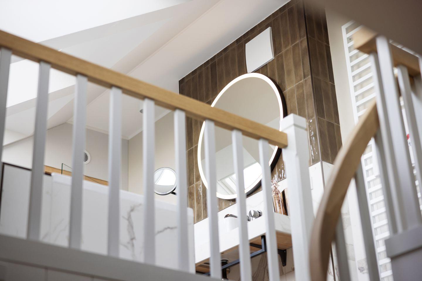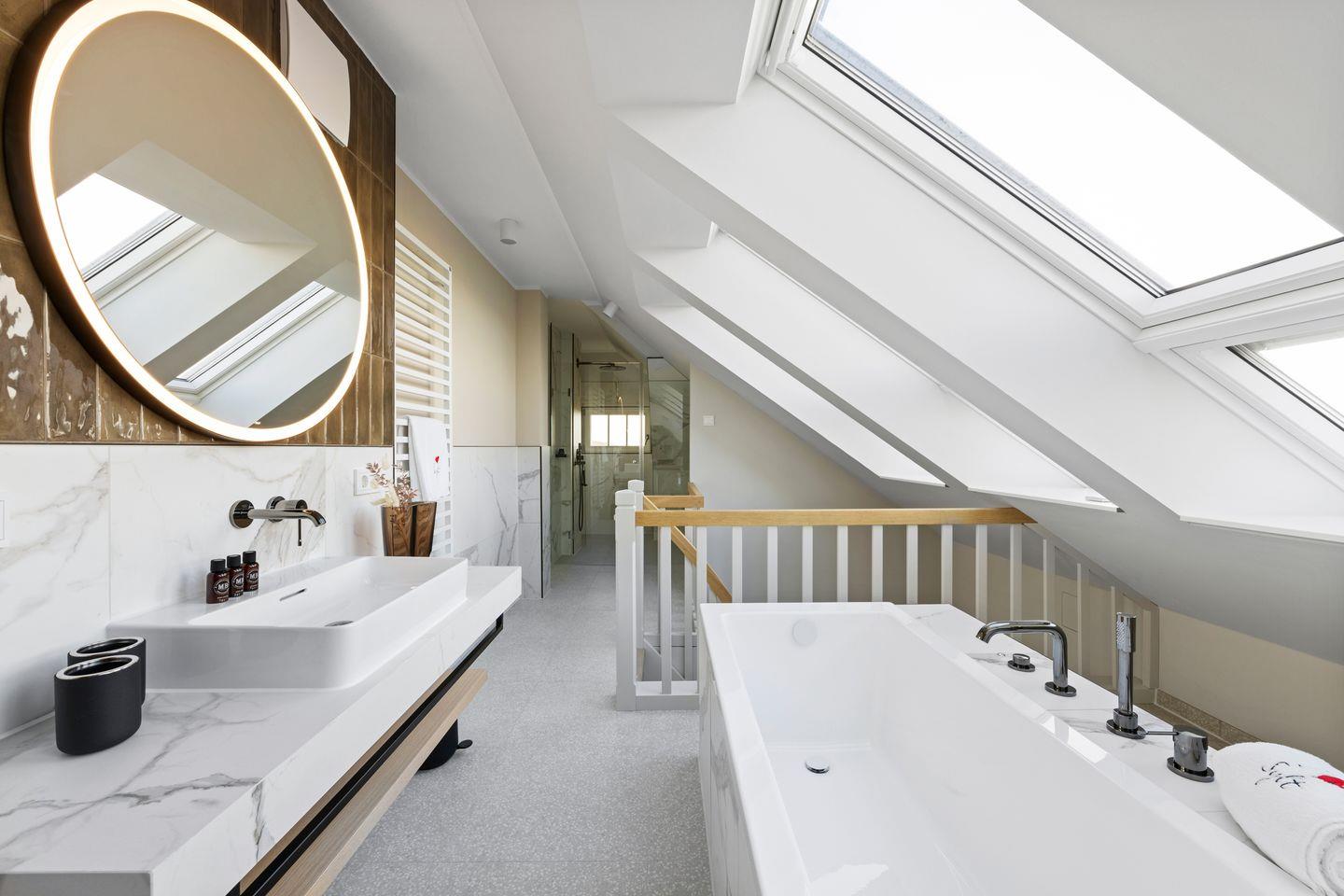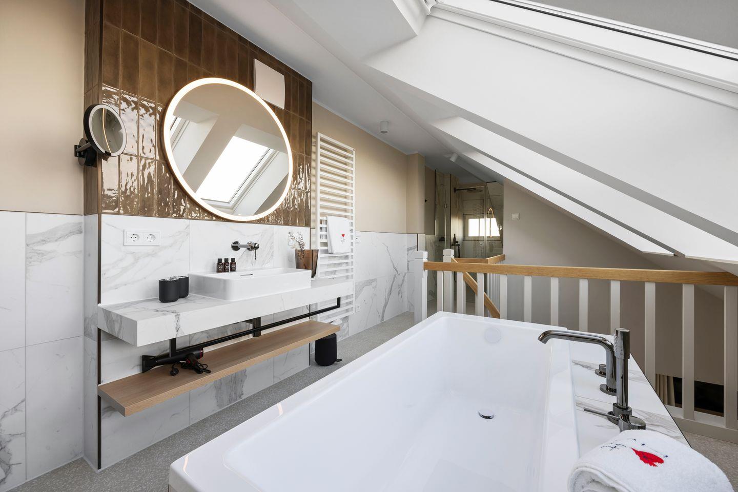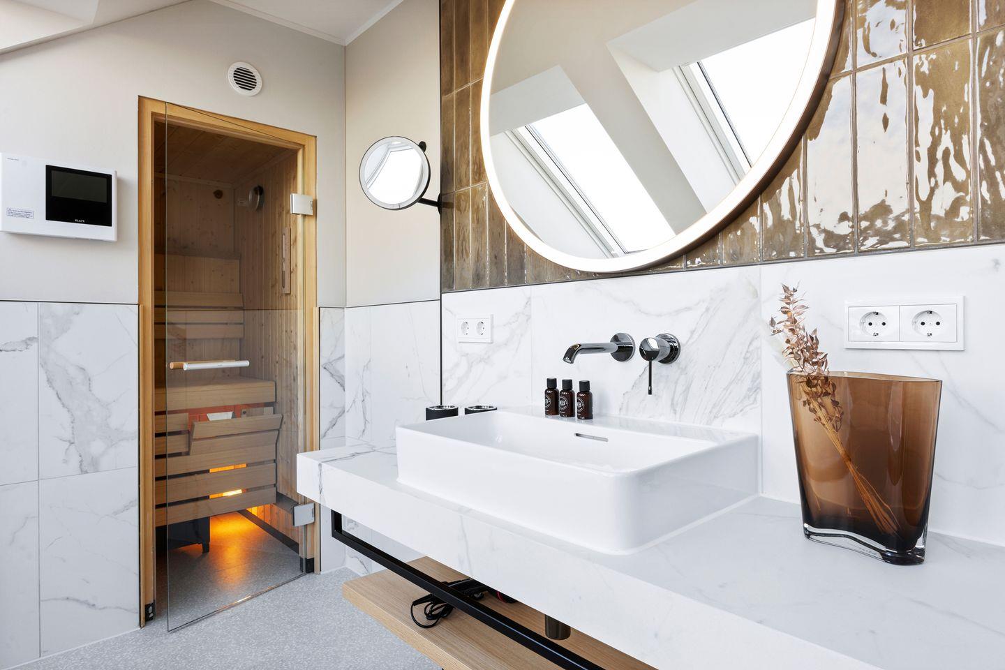 Das großzügige Badezimmer auf der Galerie begeistert mit echtem Wellness-Charakter. Eine freistehende Badewanne, eine ebenerdige Regendusche und die private KLAFS-Sauna laden dazu ein, nach einem langen Strandspaziergang zu entspannen und neue Energie zu tanken. Elektrisch zu öffnende Oberlichter schenken Tageslicht, während die vollständige Verdunklung erholsame Ruhe ermöglicht. Handtuchwärmer und Föhn runden den Komfort ab.