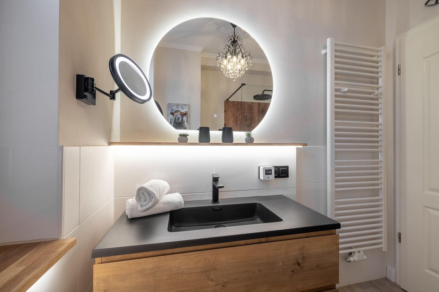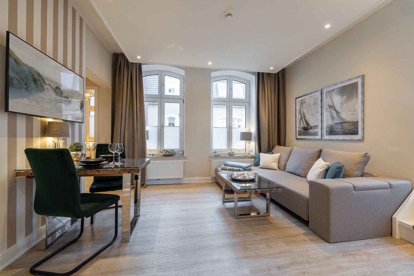 Gemütlicher Wohnbereich mit TV, JBL-Lautsprecher und Essplatz, offene Küche mit Mikrowelle, Induktionskochfeld, Umluft-Backofen, Geschirrspüler, hochwertigem Messerblock und Kaffeemaschine. Der großzügige Balkon ist mit Gartenmöbeln und einem Strandkorb (nutzbar von April bis Oktober) ausgestattet und lädt zum Entspannen ein. Das Schlafzimmer verfügt über ein Doppelbett (2x100x200cm), einen beleuchteten Kleiderschrank und einen zusätzlichen TV. Das modern ausgeleuchtete Badezimmer bietet eine Walk-In-Dusche, einen Anti-Fog-Spiegel und ein WC.