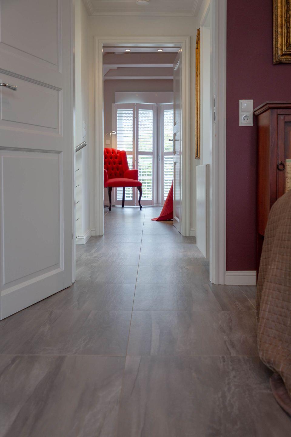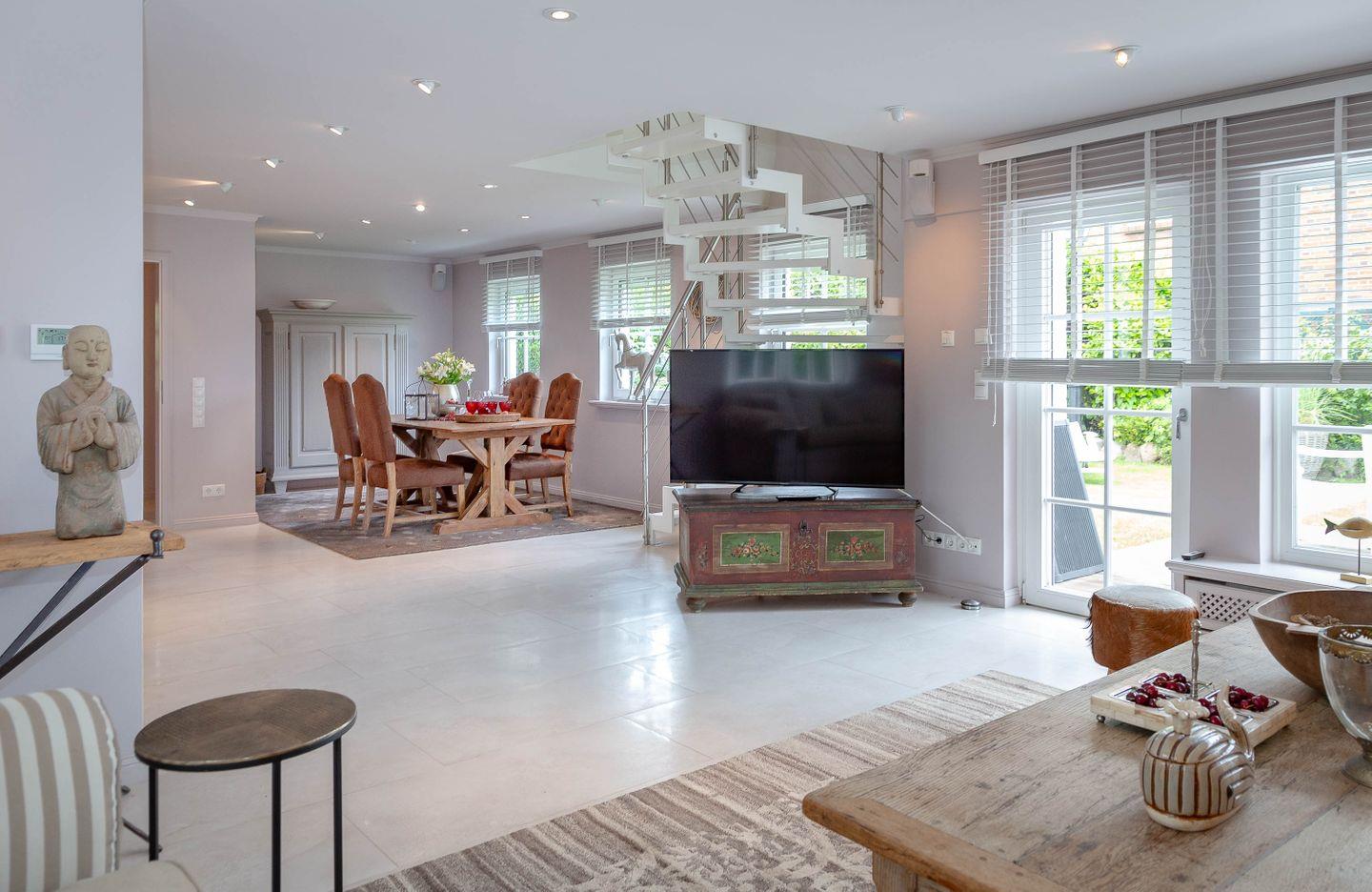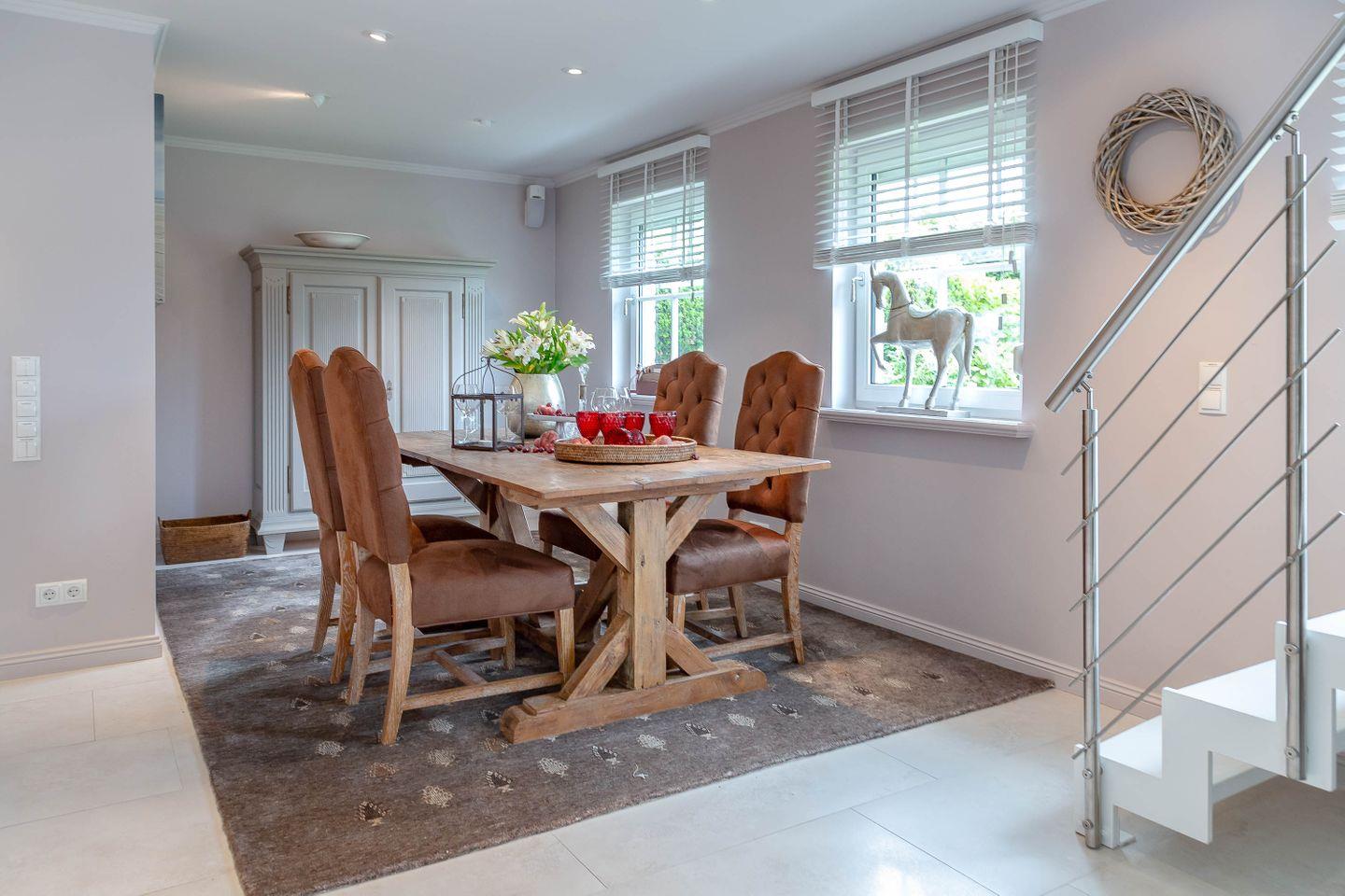 Die Einrichtung überzeugt mit ihren hochwertigen Tischlereinbauten und den stilvollen Details. Ob in weichen Polstern , am großen Esstisch oder auf der Terrasse: Es bieten sich viele Möglichkeiten gemeinsam zu entspannen und zu genießen. Zu jeder Jahreszeit.