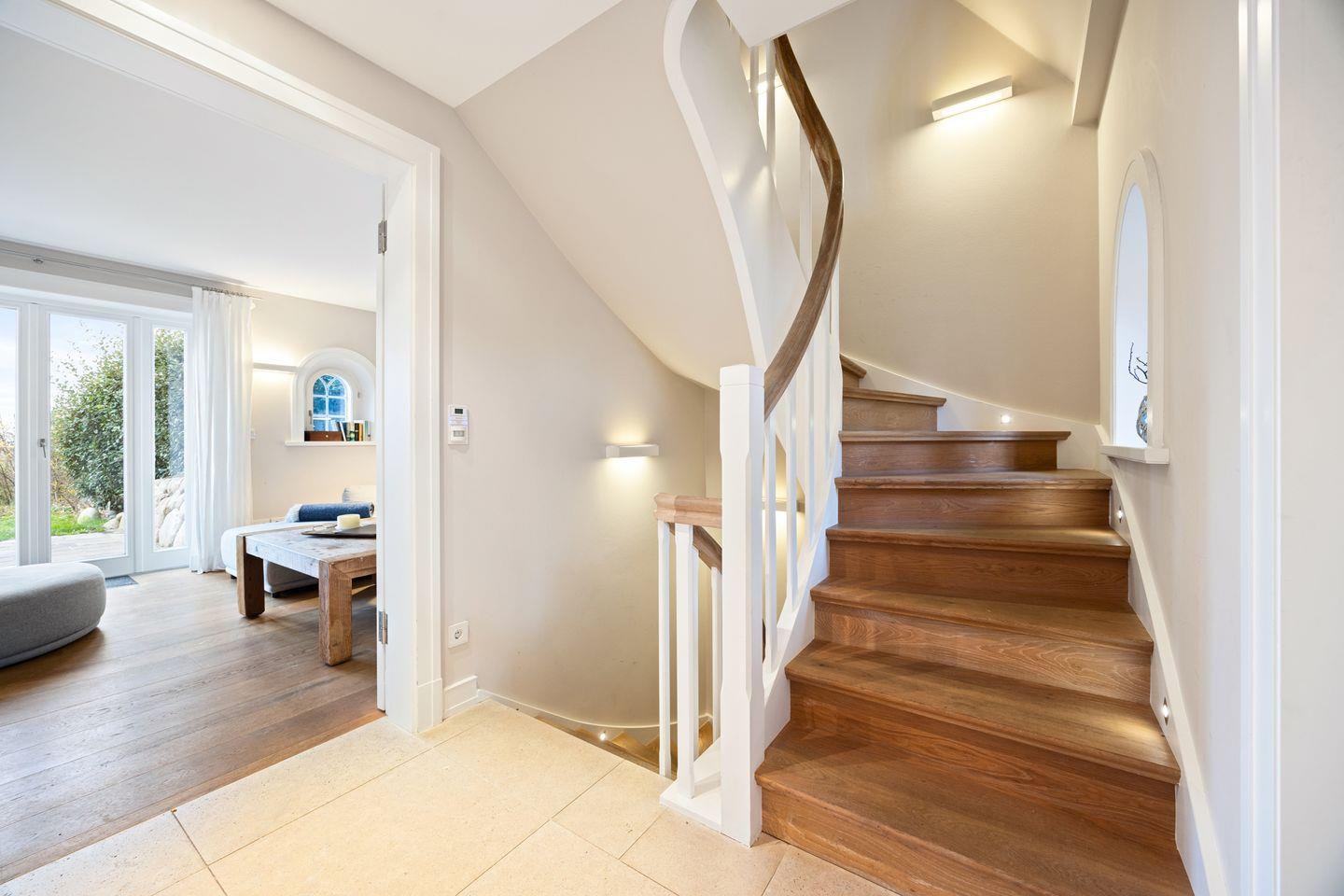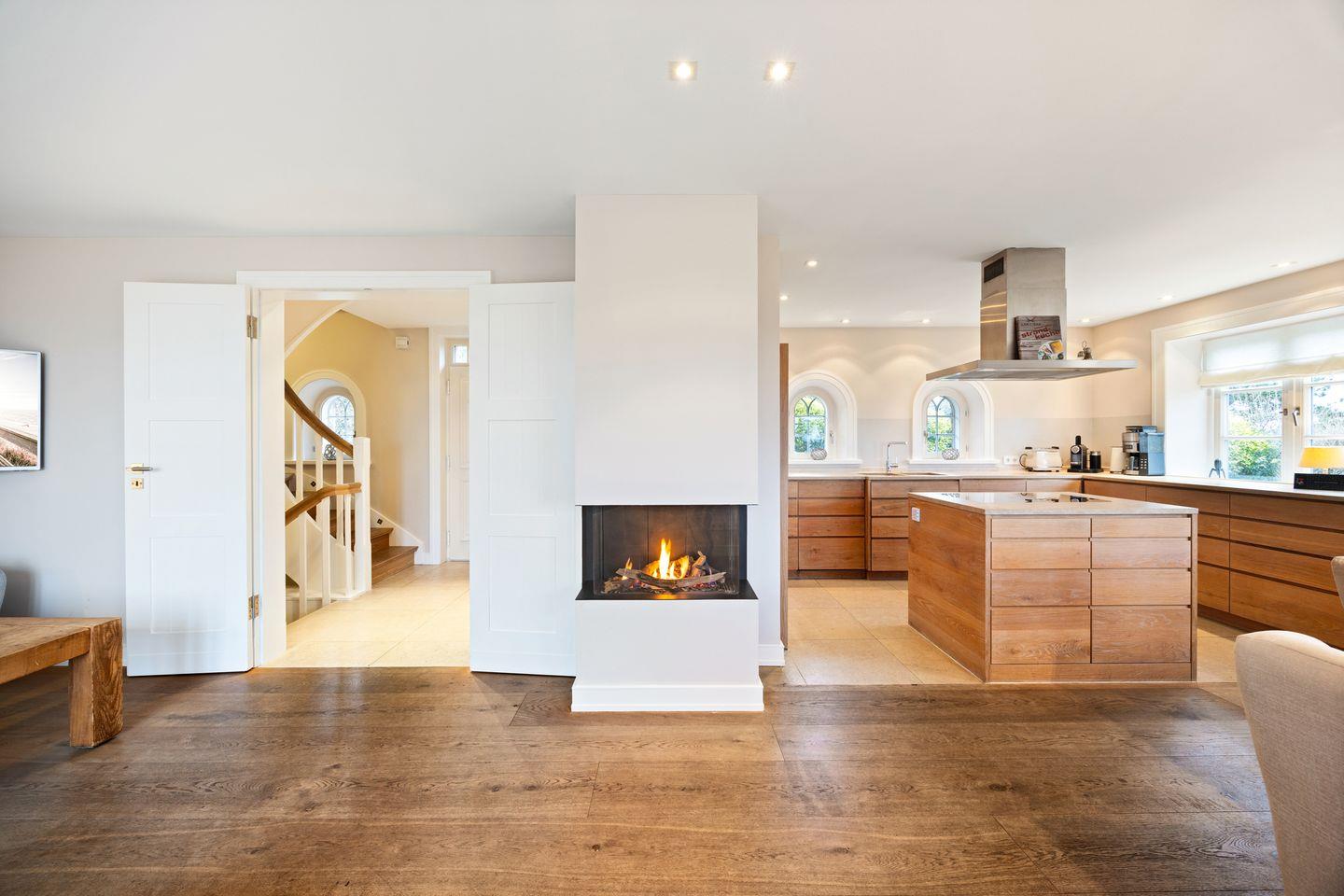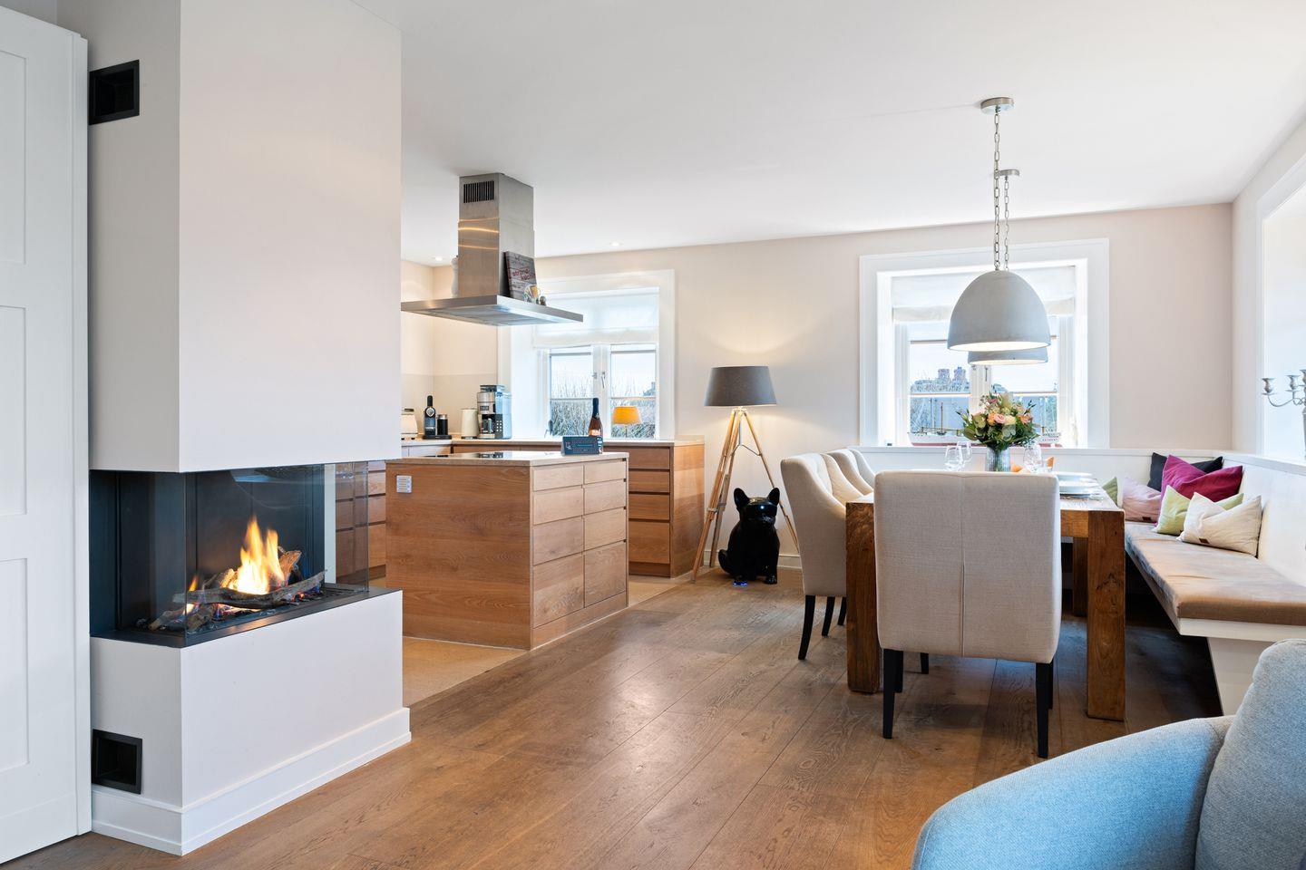 Im lichtdurchfluteten Wohnbereich erwartet Sie ein großzügiges Ambiente mit einem gemütlichen Gas-Kamin, der für behagliche Stunden sorgt. Der offene Essbereich ist stilvoll integriert und lädt zu geselligen Mahlzeiten ein. Durch die bodentiefen Fenster gelangen Sie direkt auf die Terrasse mit fantastischem Ausblick über das Wattenmeer.