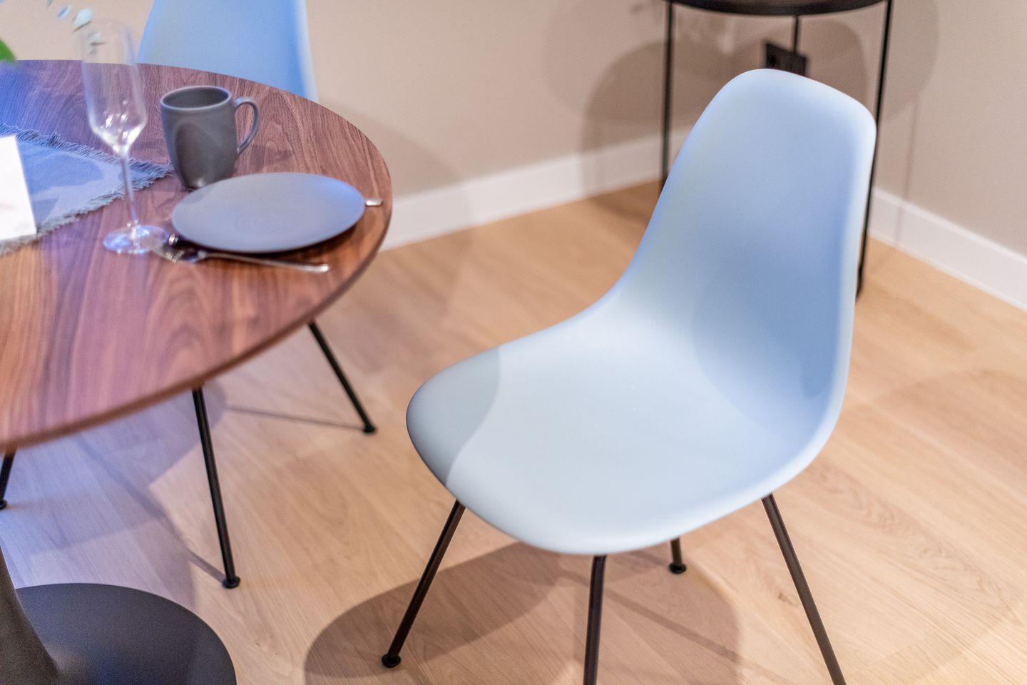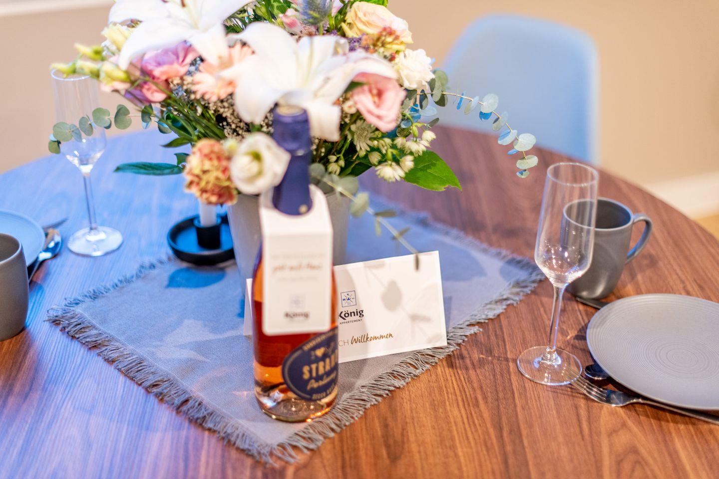 Der offene Wohn- und Essbereich ist das Herzstück der Wohnung. Hier finden Sie eine gemütliche Sitzecke mit einem komfortablen Boxspring-Schlafsofa, das auch als Schlafmöglichkeit für Kinder dient. Ein gemütlicher Esstisch lädt zu gemeinsamen Mahlzeiten und entspannten Abenden ein.