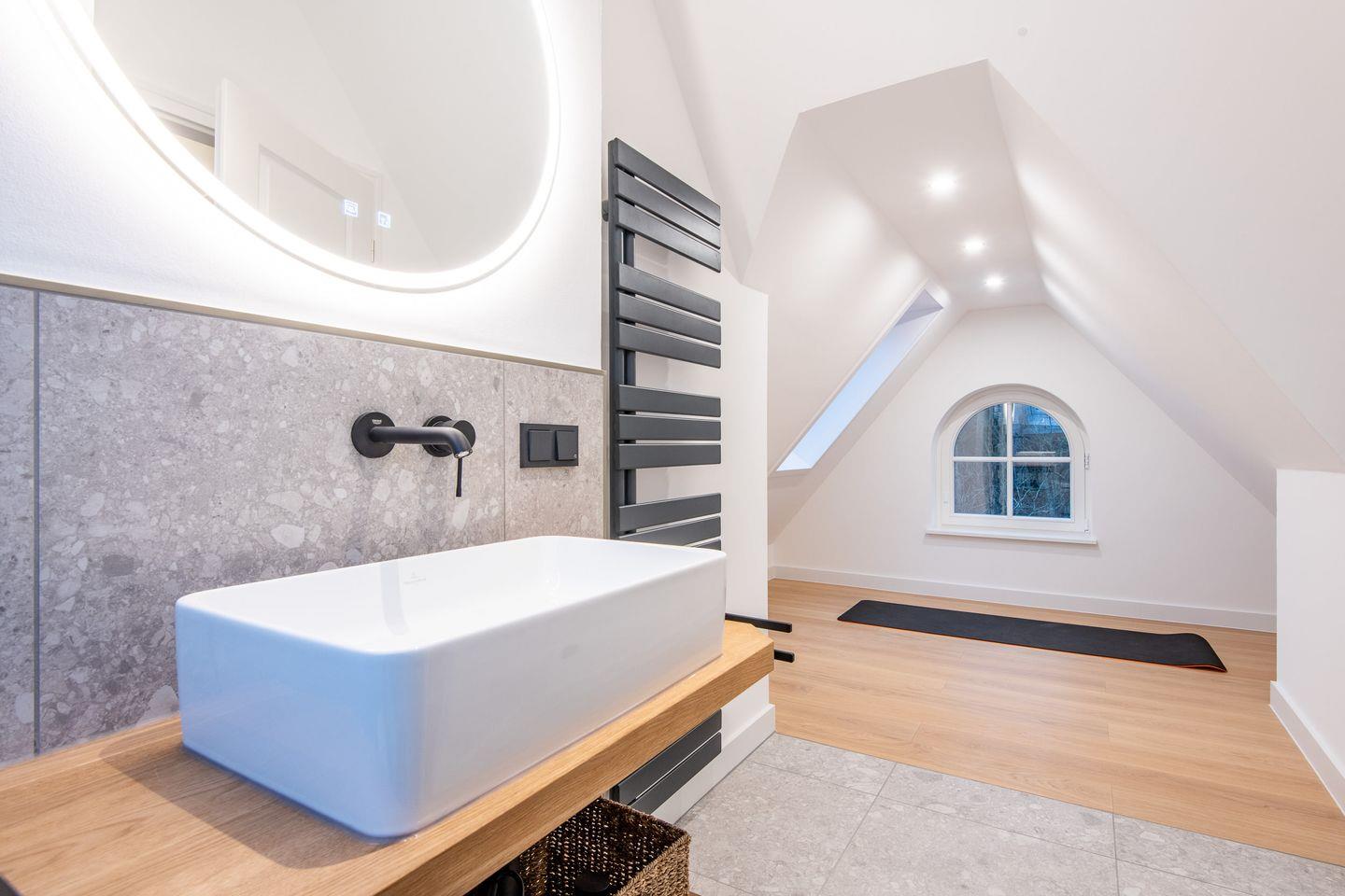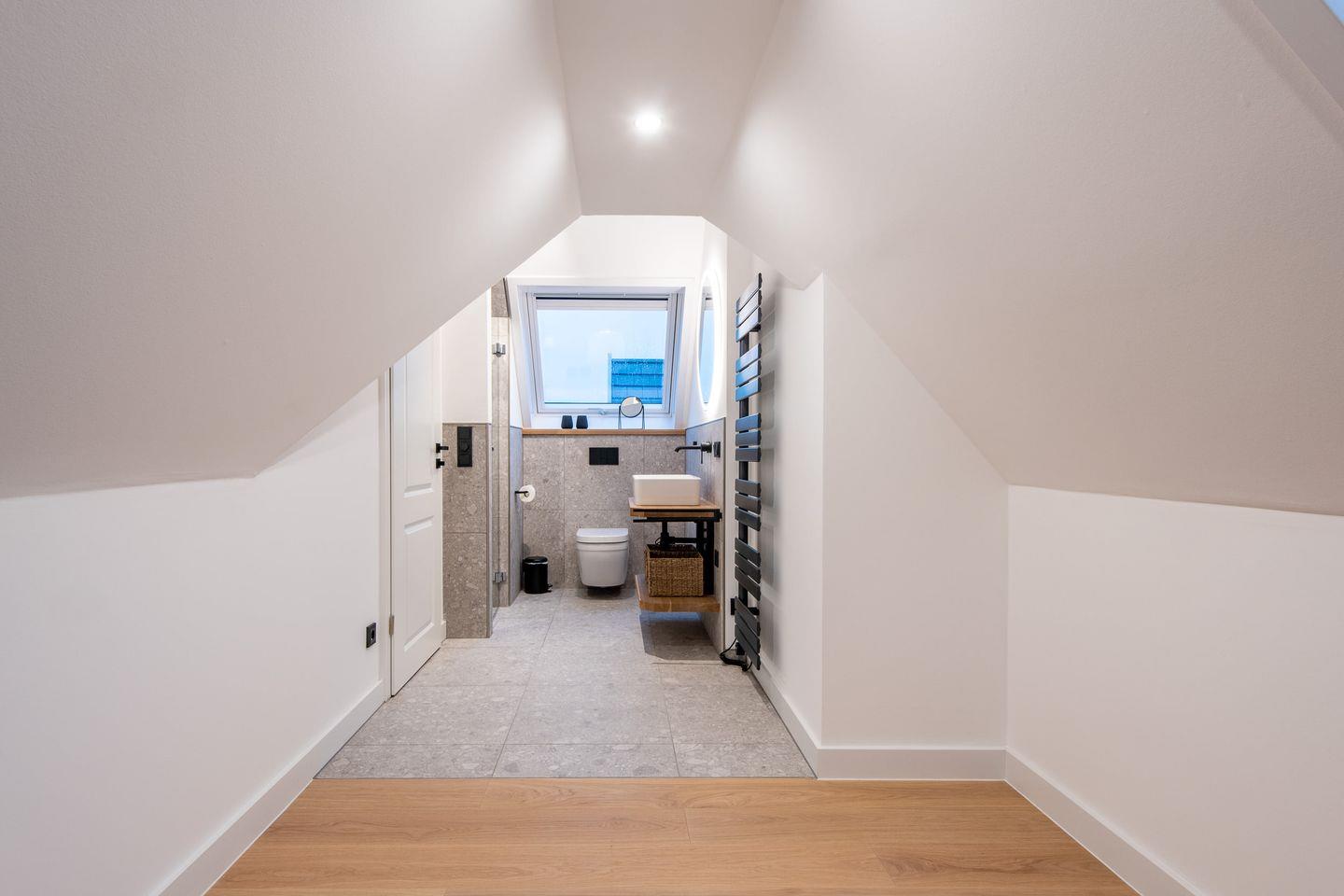 Die Ferienwohnung bietet Ihnen Zugang zu einem gemeinschaftlichen Wellness- und Fitnessbereich. Entspannen Sie in der Sauna, nutzen Sie den Fitnessraum oder die gemeinschaftlichen Wasch- und Trocknergeräte – alles wurde mit Ihrem Komfort im Blick gestaltet. Das Badezimmer mit moderner Dusche und ein zusätzliches Gäste-WC sorgen für zusätzliche Annehmlichkeiten.