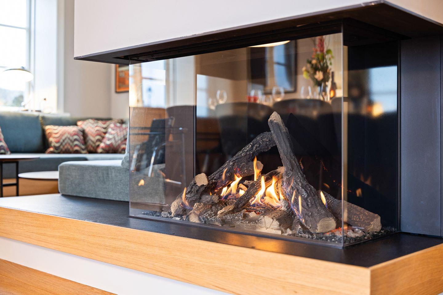 Der offene Wohn- und Essbereich lädt mit seiner gemütlichen Einrichtung zum Verweilen ein. Eine charmante Leseecke bietet den perfekten Platz, um mit einem guten Buch zur Ruhe zu kommen. Der stilvolle Gaskamin sorgt für eine behagliche Atmosphäre, besonders an kühleren Abenden. Bodentiefe Fenster lassen viel Tageslicht herein und bieten einen traumhaften Blick auf die Natur.