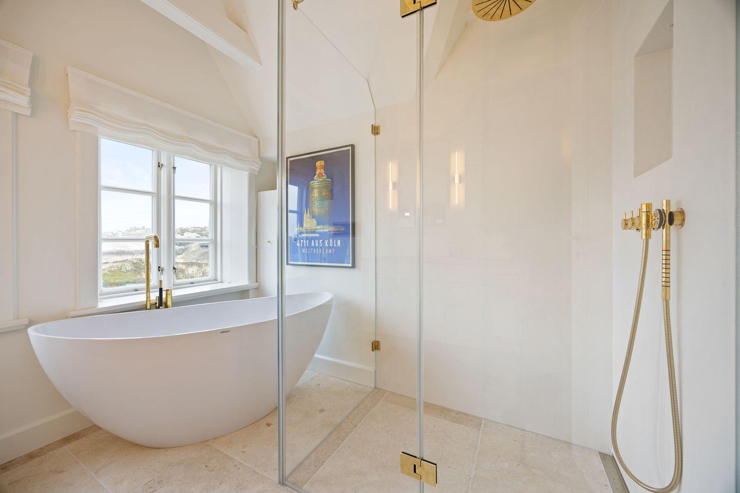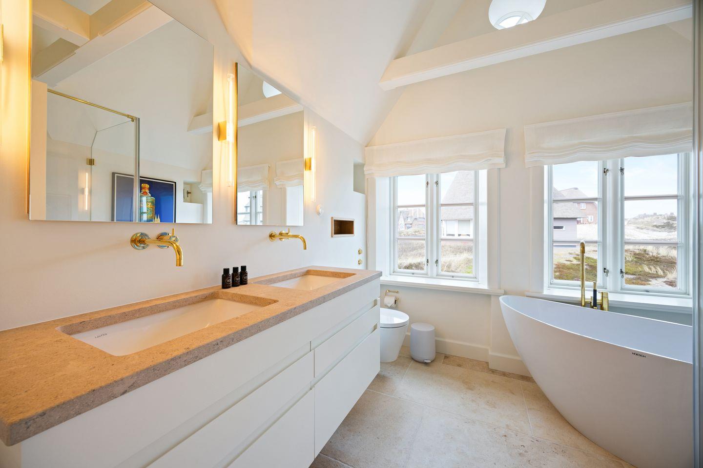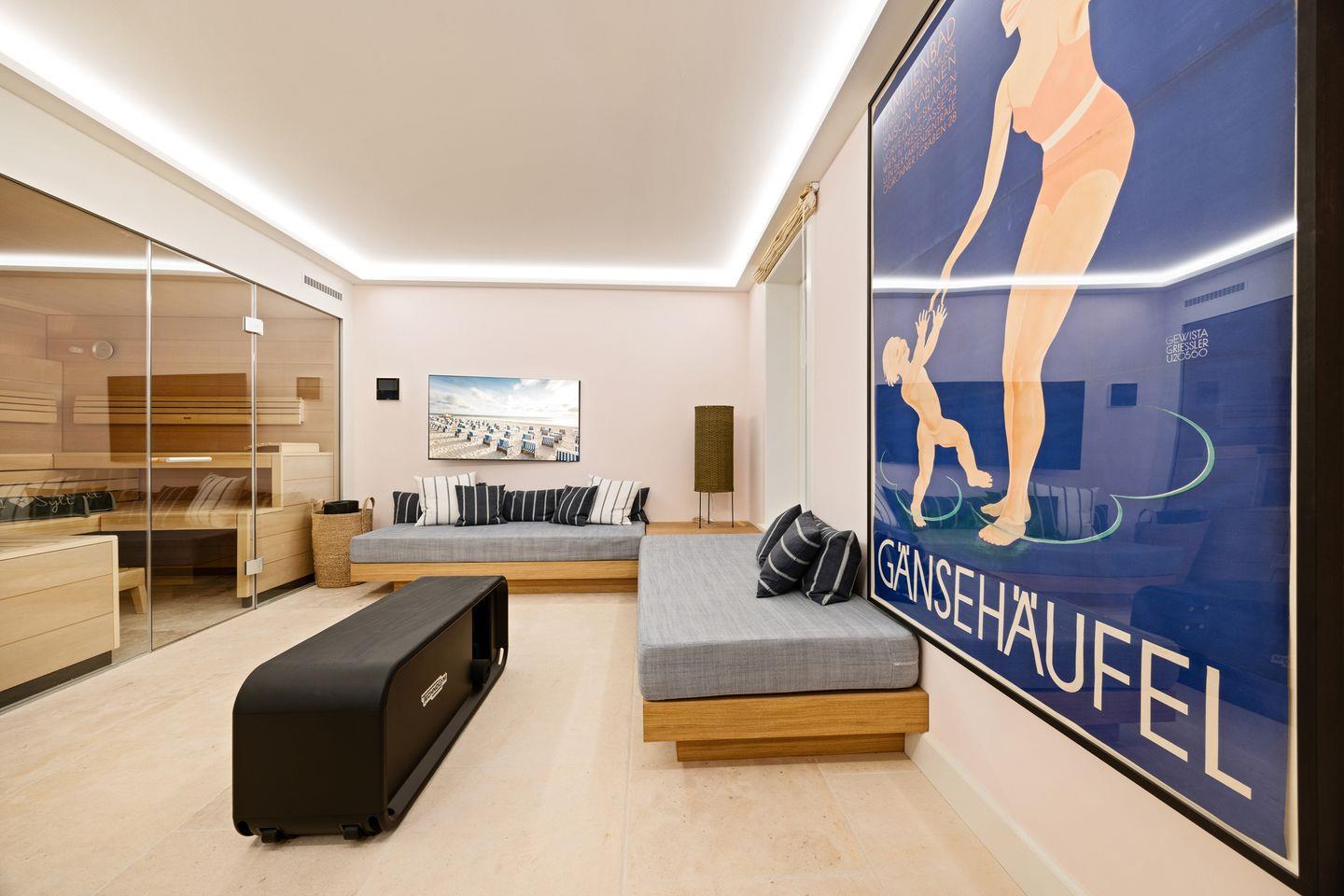 In den vier modernen Badezimmern mit hochwertigen Armaturen erwarten Sie bodengleiche Regenduschen, die ein barrierefreies Duschvergnügen garantieren. Ein separates Gäste-WC bietet zusätzlichen Komfort. Ein besonderes Highlight des Hauses ist der private Wellnessbereich mit Sauna, Regendusche und Ruhebereich. Hier können Sie nach einem erlebnisreichen Tag am Strand entspannen und neue Energie tanken.