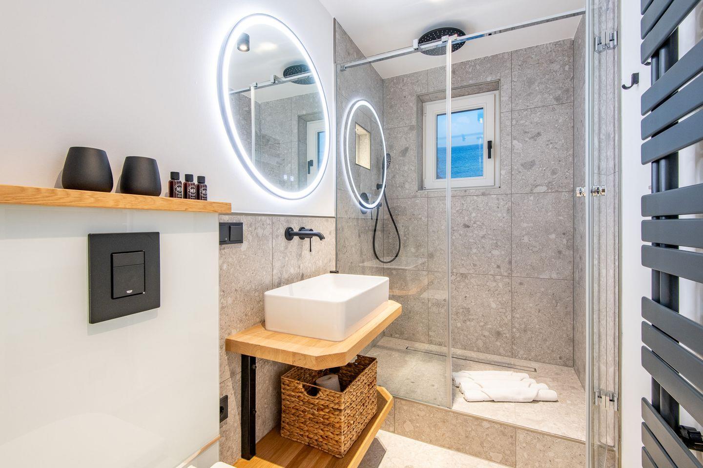 Das moderne Badezimmer ist einer großzügigen Dusche ausgestattet. Ein zusätzliches Gäste-WC sorgt für noch mehr Komfort. Highlight ist der gemeinschaftlich nutzbare Wellnessbereich mit Sauna und Fitnessgeräten, der Ihnen pure Entspannung bietet.