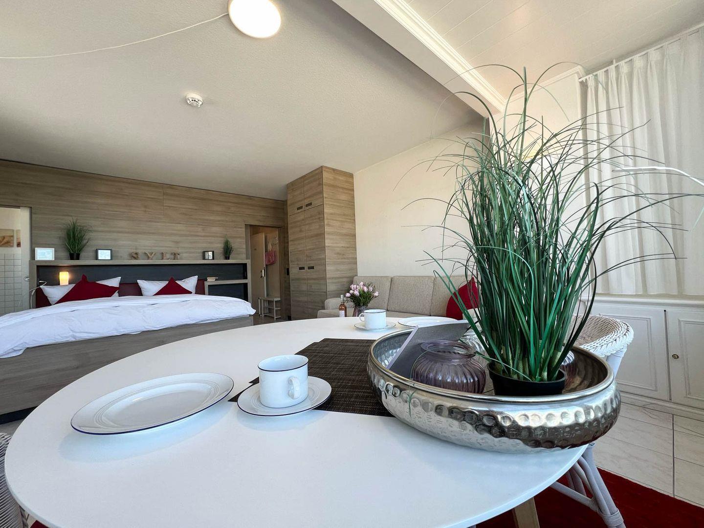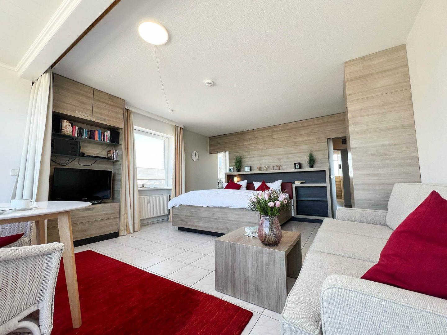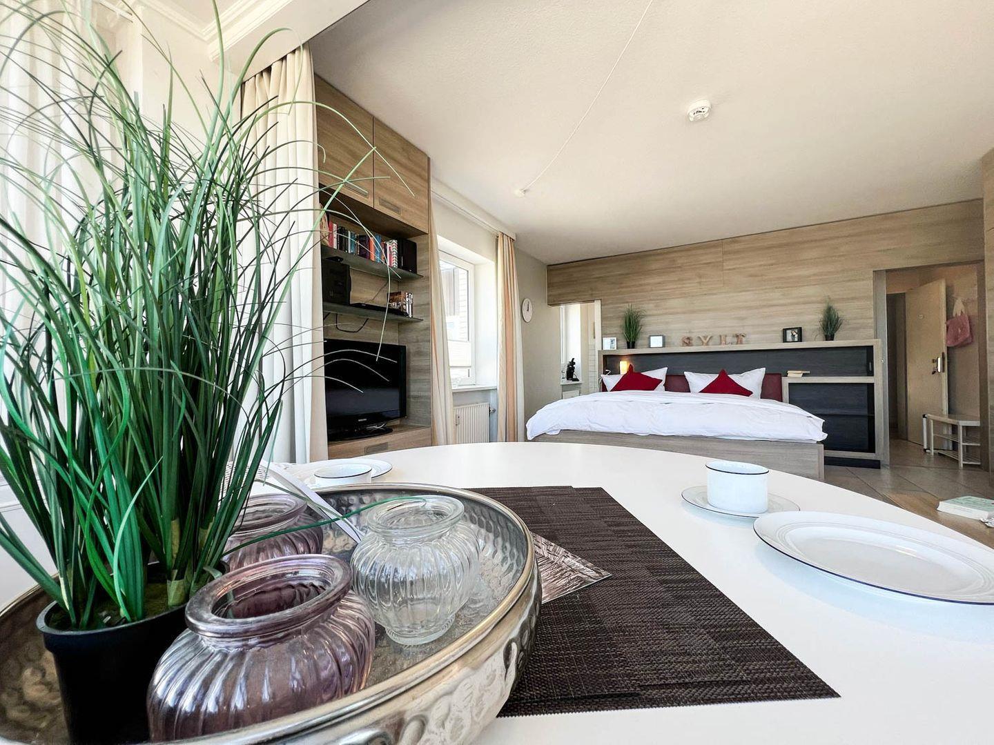 Helle großzügige 1-Zimmer-Ferienwohnung sehr strandnah im Zentrum von Westerland für bis zu 2 Personen. Die Ferienwohnung ca. 34qm befindet sich im 3. Stock ( moderner Aufzug vorhanden ) und verfügt über ein großen lichtdurchfluteten Wohn- und Schlafraum mit feststehenden Doppelbett 180x200cm (Einzelmatratzen ), gemütliche Couch, Esstischgruppe, großen Flachbild LED TV, DVD Player, Musikanlage mit Blick auf die Dünen. Die gut ausgestattete Küche hat ein 2 Platten Ceranfeld, Geschirrspüler, Mikrowelle, Kaffeemaschine, Wasserkocher und Toaster etc. Das moderne Duschbad besitzt eine Dusche mit extraflachem Einstieg, einen Waschtisch, Handtuchtrockner, Fön und WC. Die Entfernung zum Strand beträgt nur ca. 150m und zur Fussgängerzone sind es ca. 200m. Die Wohnung liegt direkt am Meerwasserschwimmbad „Sylter Welle“ und Syltness-Center. In der Wohnung steht Ihnen ein kostenloser Internetzugang WLan zur Verfügung.