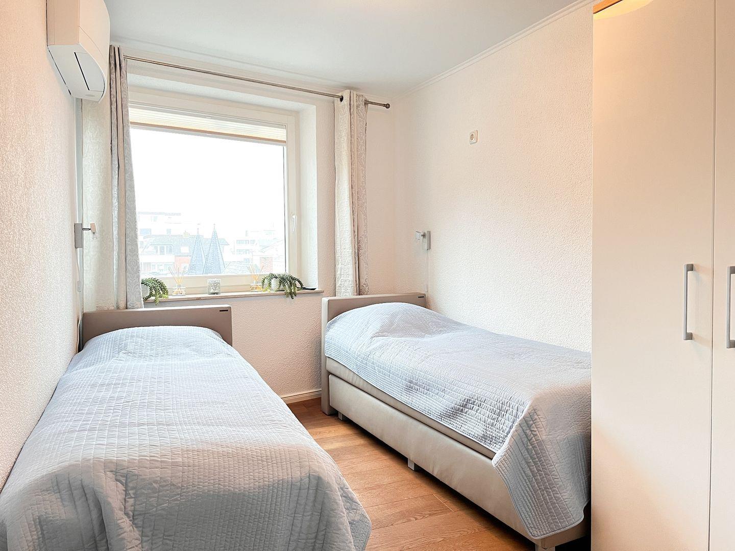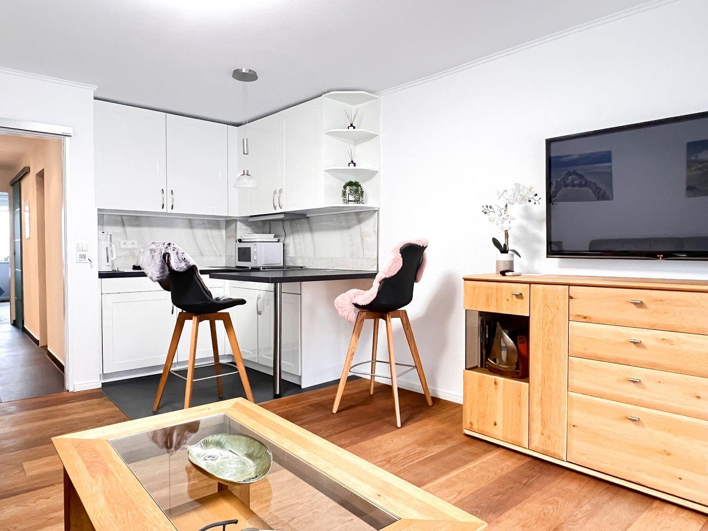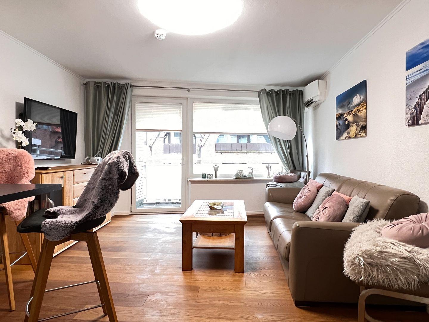 Genießen Sie den weiten Blick auf die Nordsee vom eigenen Balkon und spüren Sie das maritime Flair bereits beim Frühstück. Das gemütliche Wohnzimmer mit offener, gut ausgestatteter Küchenzeile lädt zum entspannten Verweilen ein, während das separate Schlafzimmer mit zwei komfortablen Einzel-Boxspringbetten und TV für erholsame Nächte sorgt.