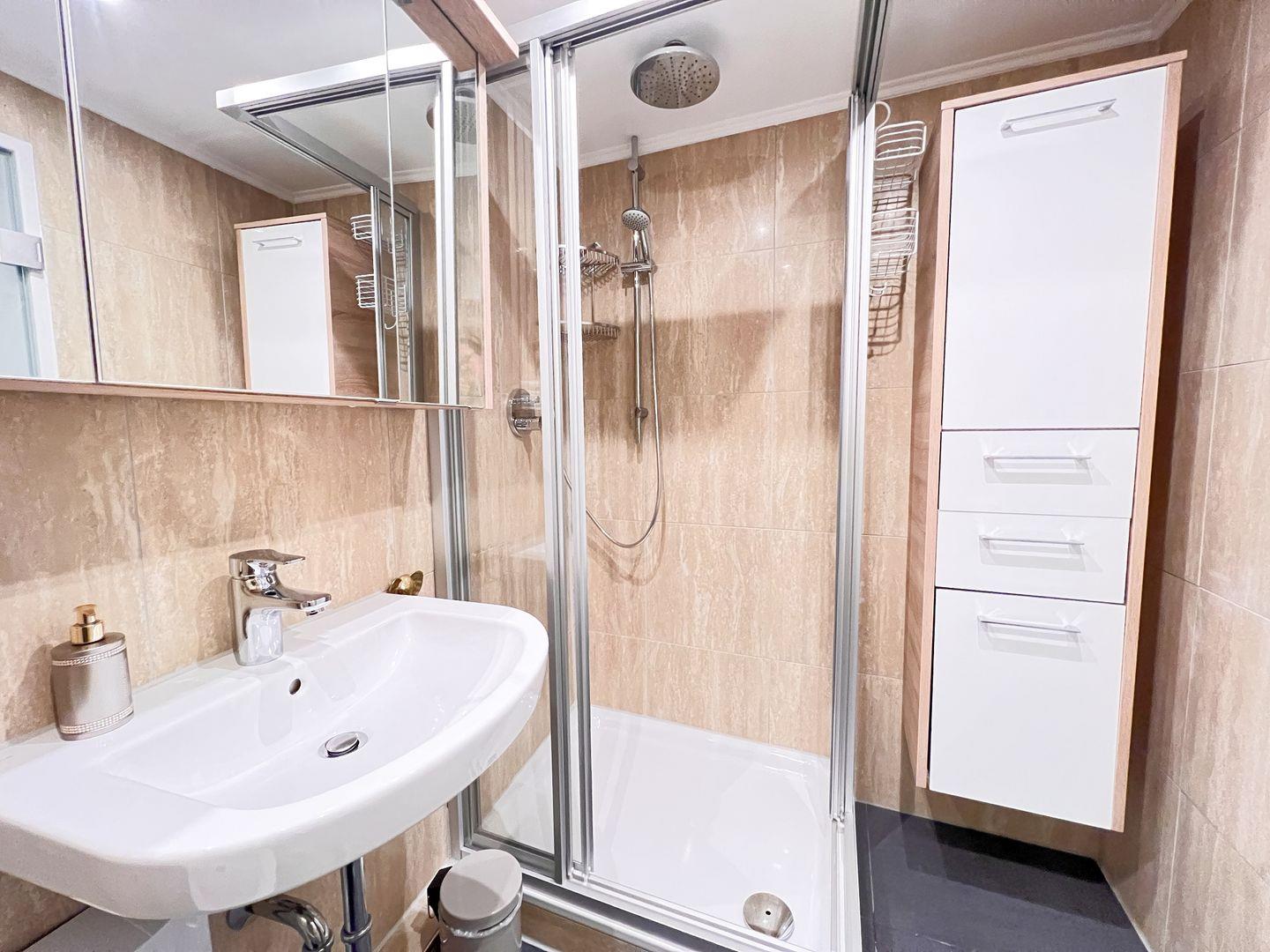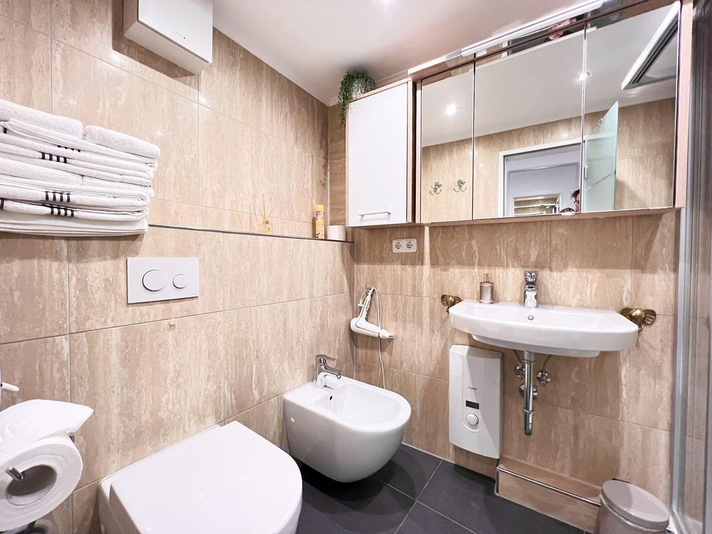 Ein modernisiertes Badezimmer mit Dusche und Bidet rundet das Wohlfühlpaket ab. Besonders praktisch: Der Fahrstuhl im Treppenhaus erleichtert Ihnen den Zugang zur Wohnung.