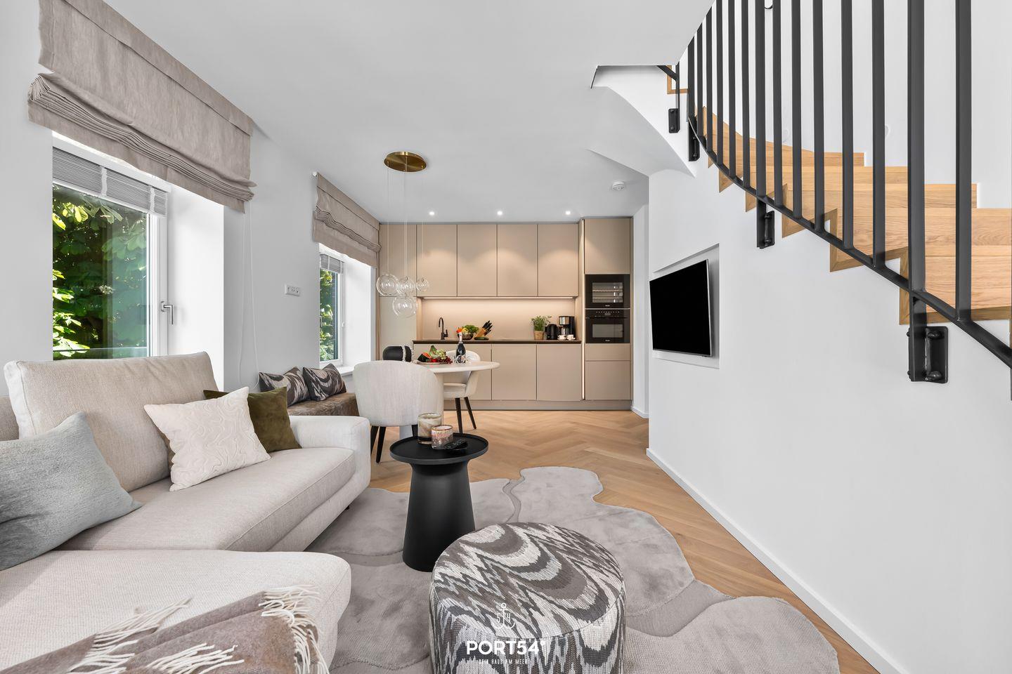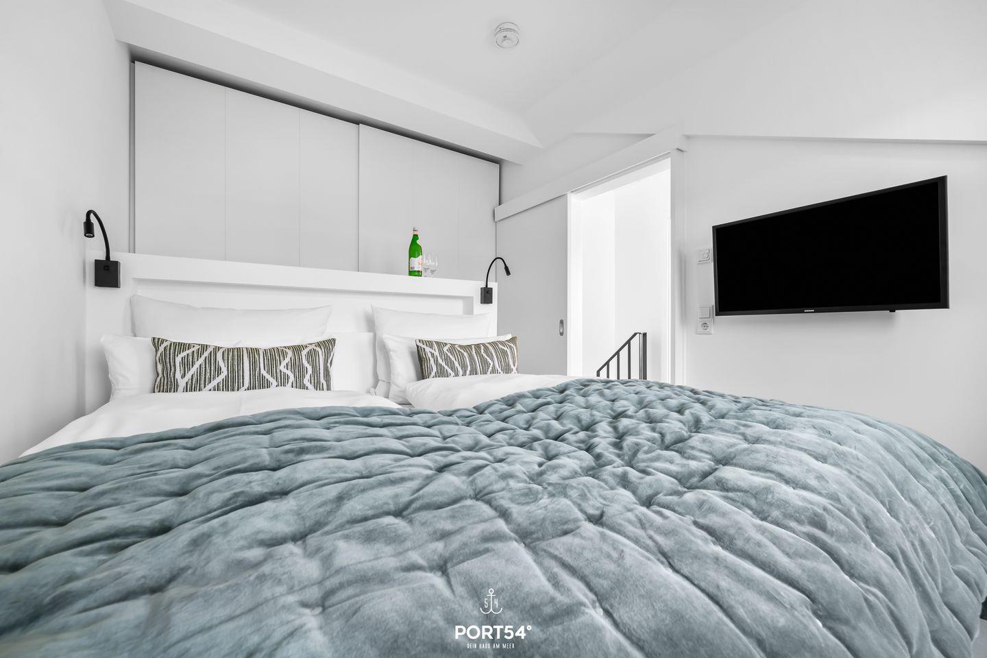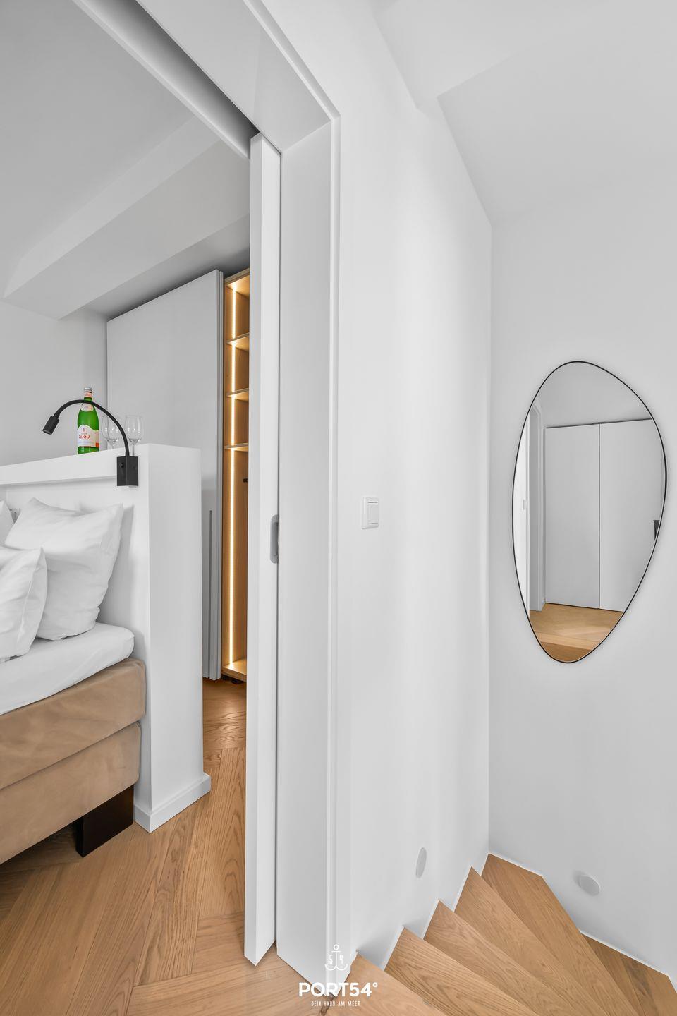 Das Luxus 2-Zimmer Maisonette Apartment bietet Platz für bis zu 2 Personen im ersten und zweiten Obergeschoss. Es erwartet dich ein offener Wohnbereich mit einem gemütlichen Sofa und großem Flachbild-TV, die voll ausgestattete Küche sowie ein Schlafzimmer mit großem Doppelboxspringbett und Flachbild-TV. Außerdem das exklusive Bad mit großer Regendusche, Waschbecken, Föhn und WC.