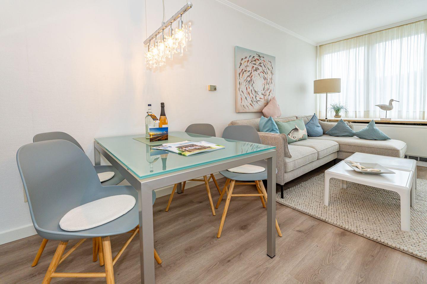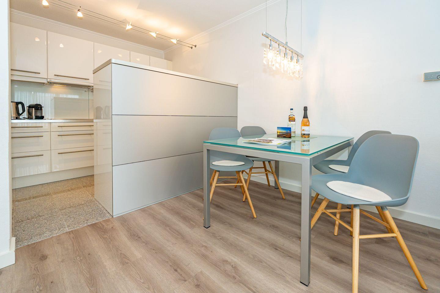 Diese Ferienwohnung bietet Platz für bis zu 2 Personen und befindet sich im ersten Stock eines ruhigen Gebäudes in der Deckerstraße, nur 700 Meter vom lebendigen Stadtzentrum entfernt. Besonders hervorzuheben ist der helle und freundliche Wohnbereich, der mit einem Fernseher und einer HiFi-Anlage ausgestattet ist. Die offene Küche ist ausgestattet mit einem Geschirrspüler, Gefrierfach, Backofen, Kaffeefiltermaschine sowie eine Nespressomaschine. Das Badezimmer ist ausgestattet mit Dusche, WC und Waschtisch. Das Schlafzimmer welches mit Kleiderschrank und komfortablem Boxspring (160 cm x 200 cm) ausgestattet ist verspricht erholsame Nächte auf Sylt. Vom Wohnbereich haben Sie Zutritt zum Balkon der über zwei Stühle und einen Tisch verfügt. Ein PKW Stellplatz gehört zur Ferienwohnung. Haustiere sind nicht gestattet.