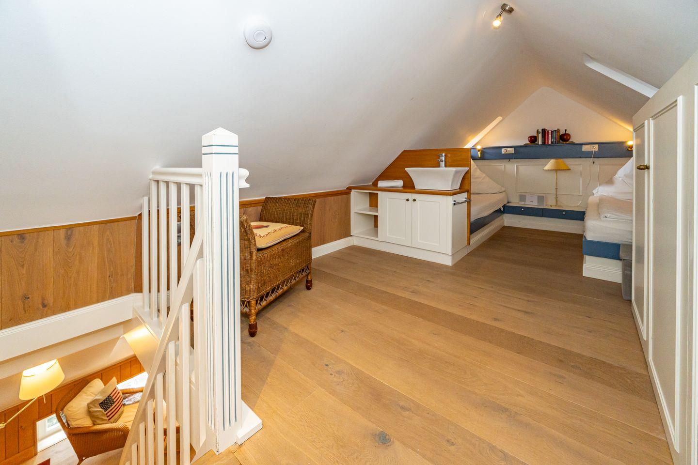 Der Küchenbereich überzeugt mit moderner Ausstattung. Hier finden Sie unter anderem einen Ceranherd, eine Mikrowelle, eine Spülmaschine, einen Kühlschrank mit Gefrierfach, sowie eine Kaffeemaschine als auch eine Espressomaschine. Der angrenzende Wohnbereich bietet ein bequemes Sofa, einen Fernseher und einen Esstisch für 4 Personen. Das Badezimmer ist mit einer bodengleichen Dusche, einem WC, einem Waschbecken, einem Spiegel und einem Haartrockner ausgestattet und bietet somit Funktionalität und Komfort. Das erste Schlafzimmer liegt auf der selben Ebene wie der Wohn- und Essbereich und verfügt über ein Doppelbett und einen Fernseher. Hier spiegelt sich der friesische Charme mit gemütlichen Dachschrägen wieder. Das zweite Schlafzimmer erreichen Sie über eine Treppe und ist offen zum Wohn- und Essbereich gestaltet, ohne Zimmertür. Hier erwarten Sie zwei Einzelbetten.