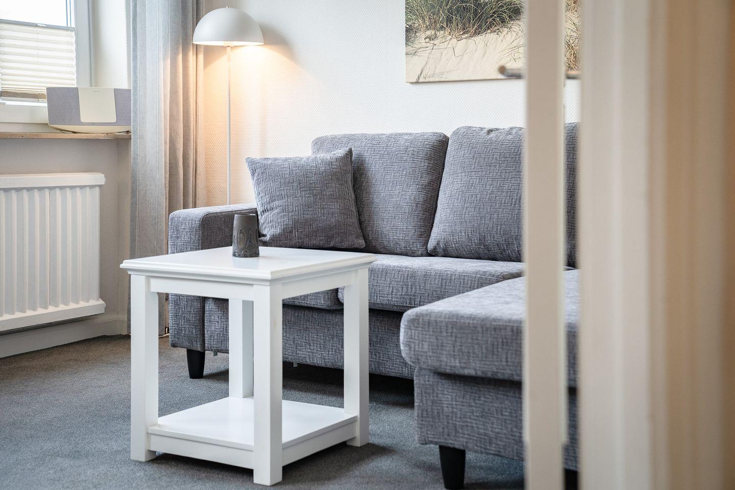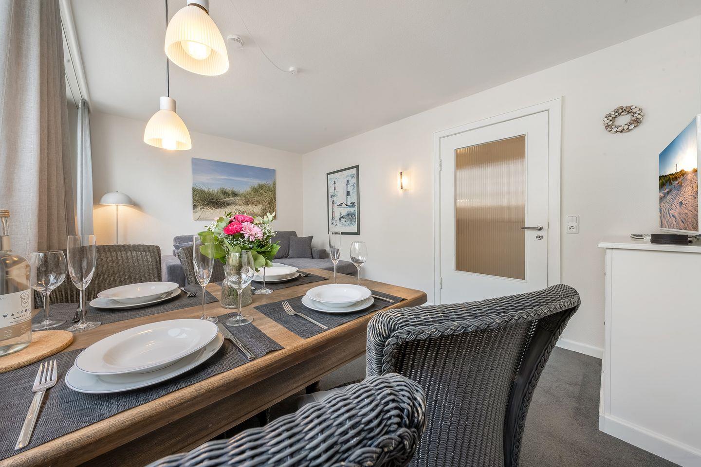 Wohn- und Essbereich: Gemütlicher und heller Wohnraum mit Esstisch für vier Personen, Sofa, Sessel, TV und einer Kommode. Durch die nach Westen ausgerichtete Fensterfront können Sie einen kleinen Blick auf die Nordsee erhaschen. Von hier gelangen Sie in das kleine Durchgangszimmer, welches als zweites Schlafzimmer dient und sich hervorragend für Kinder jeden Alters eignet.