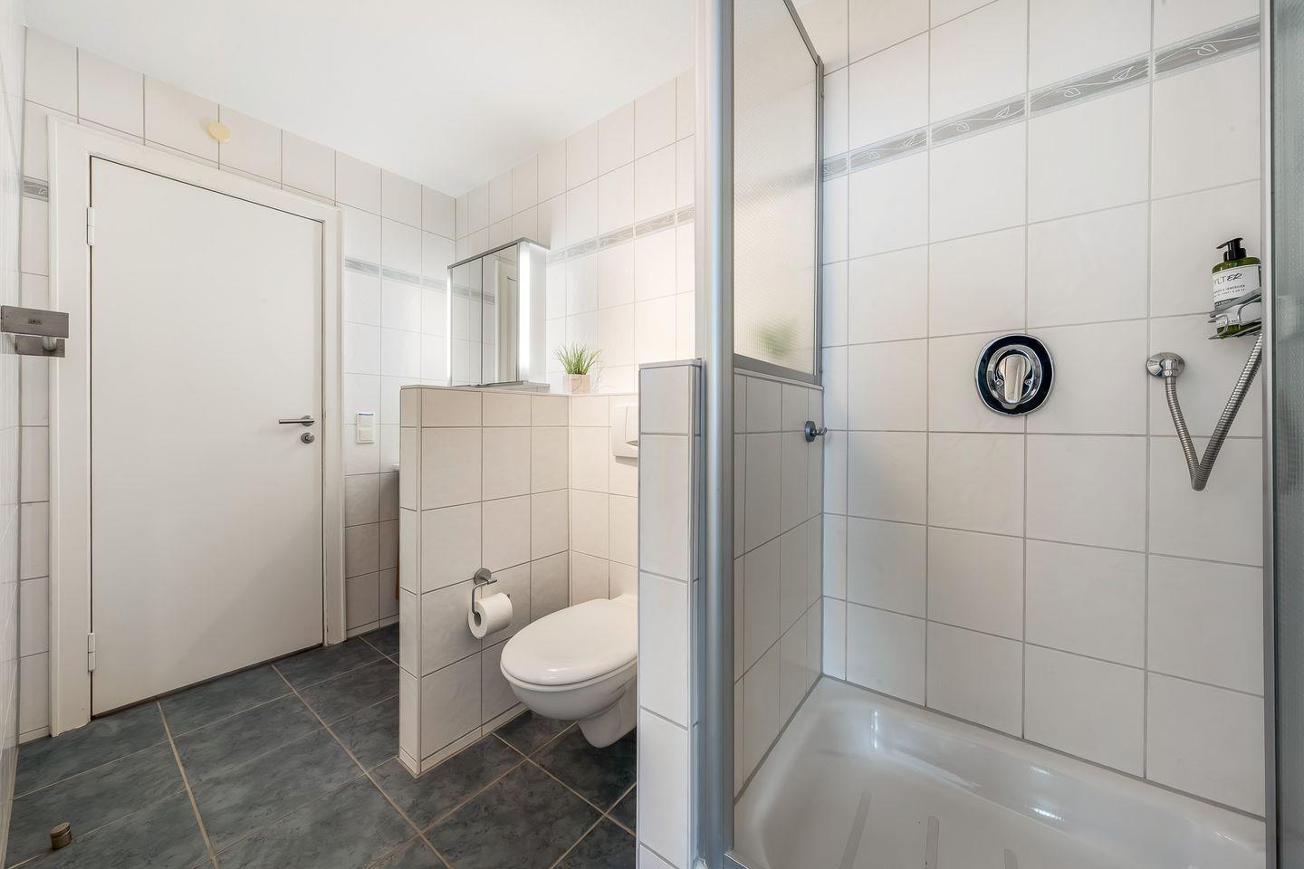 Badezimmer: Bad mit Dusche und WC.