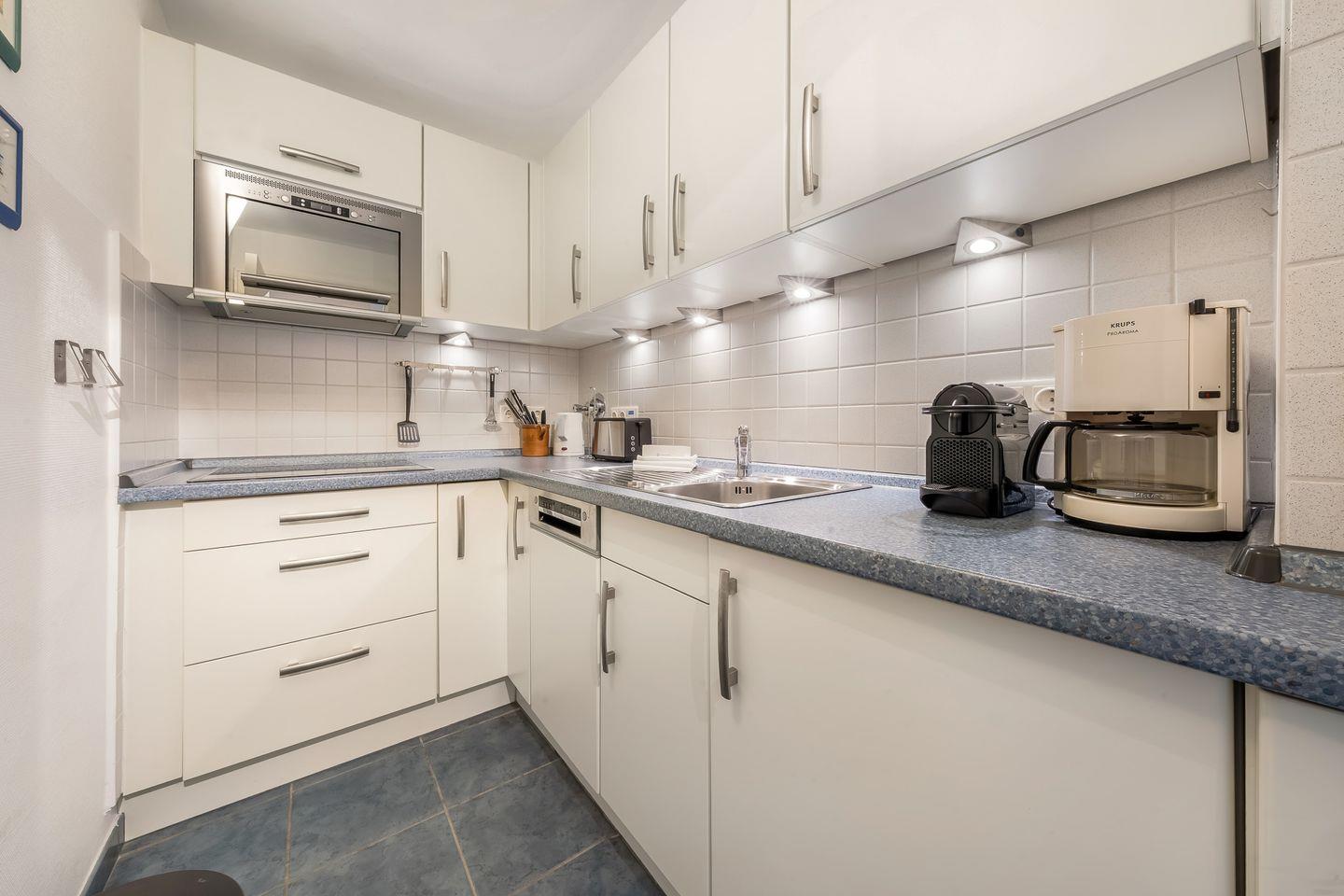 Geschlossene Küche: Gut ausgestattete Küche mit Vierplattenherd, Mikrowelle mit Backofenfunktion und Geschirrspülmaschine.