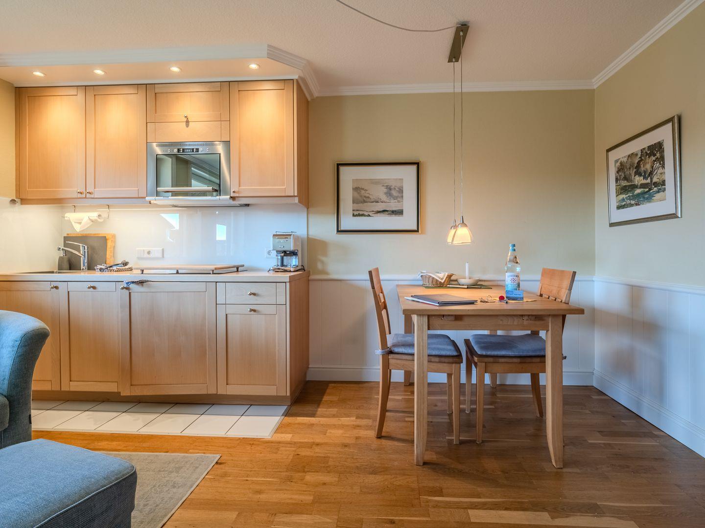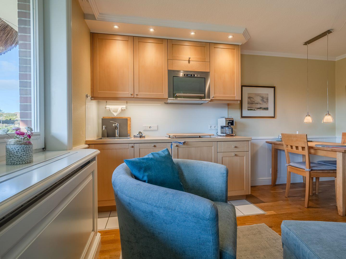 Der helle Wohnbereich lädt zum Entspannen ein – ob beim Fernsehen auf dem Smart-TV oder nach einem langen Strandspaziergang. Die moderne Küchenzeile ist komplett ausgestattet mit Spülmaschine, Mikrowelle, Kaffeemaschine, Wasserkocher und allem, was du für deine Mahlzeiten brauchst.
