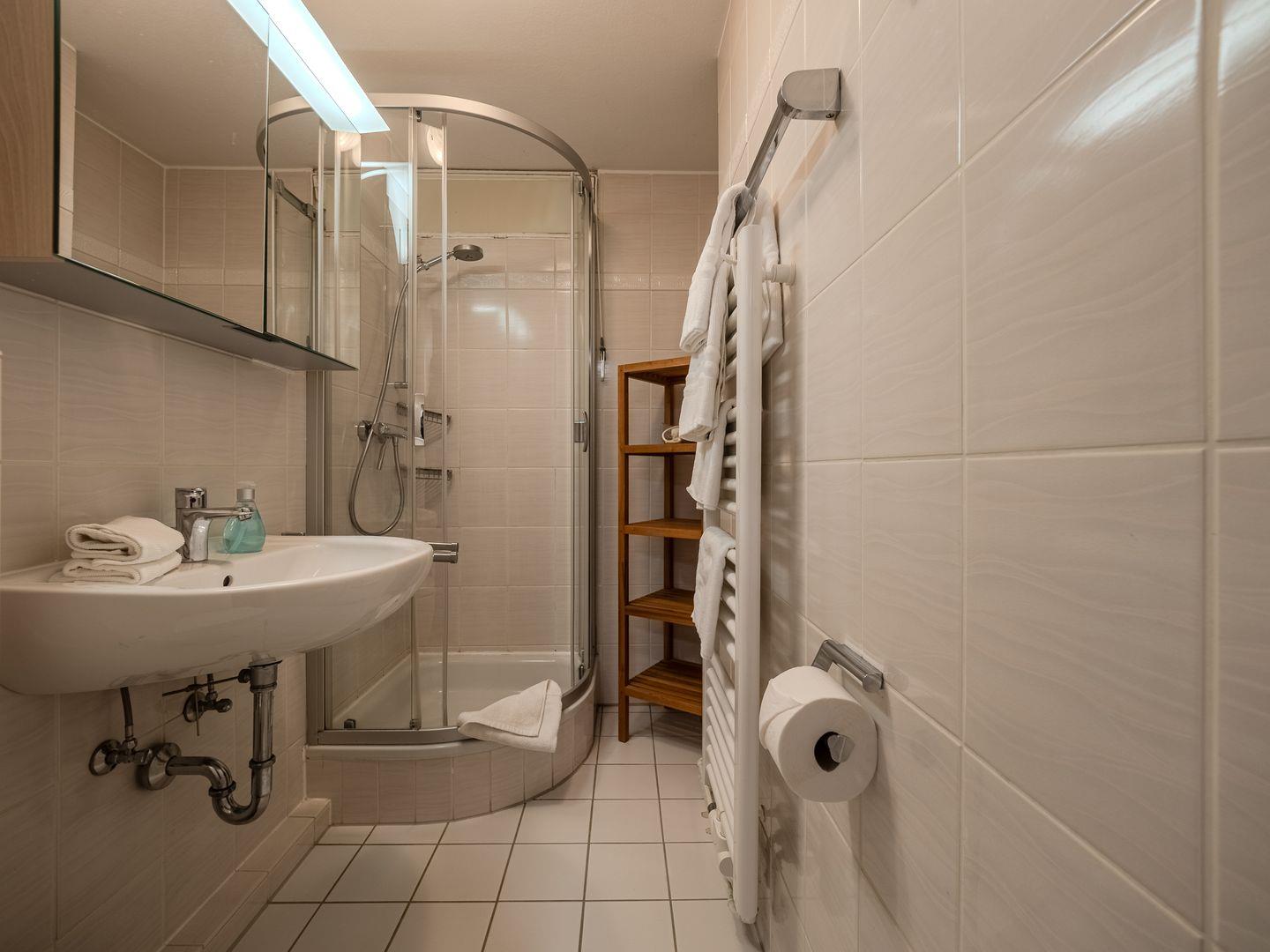 Im separaten Schlafzimmer schläfst du in einem komfortablen Doppelbett (180 × 200 cm) und startest erholt in den neuen Urlaubstag. Das moderne Badezimmer mit Dusche und WC bietet dir zusätzlichen Komfort. WLAN, Safe, Föhn, ein privater und kostenfreier Parkplatz stehen dir ebenfalls zur Verfügung.
