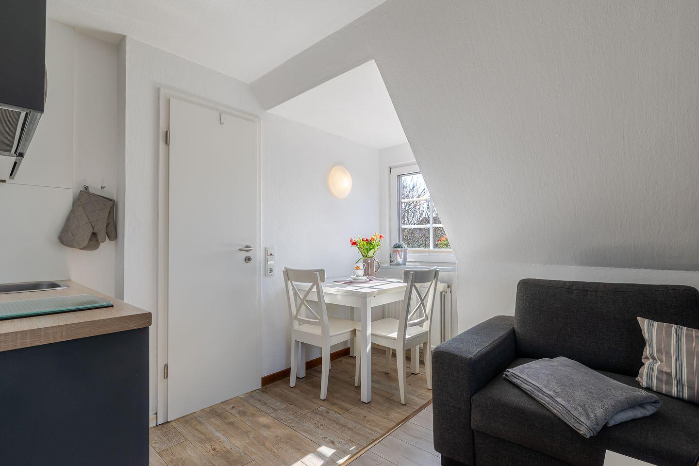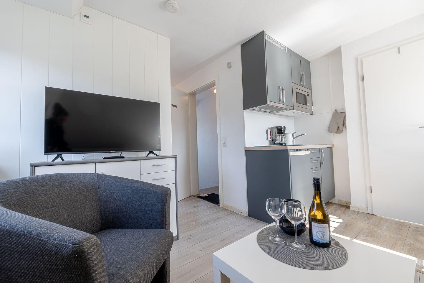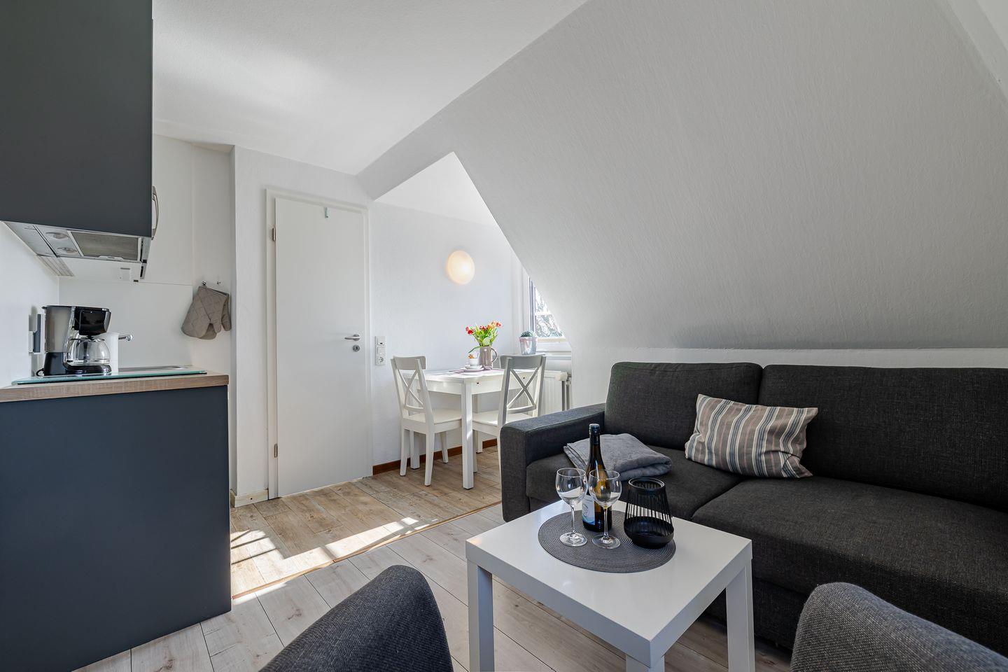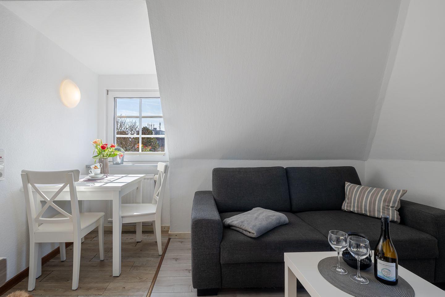 Die Wohnung Meeresbrandung liegt im ersten Obergeschoss und wirkt durch ihre offene Gestaltung besonders hell und angenehm. Ein ruhiger Platz für zwei, mit allem, was es für entspannte Tage am Meer braucht.