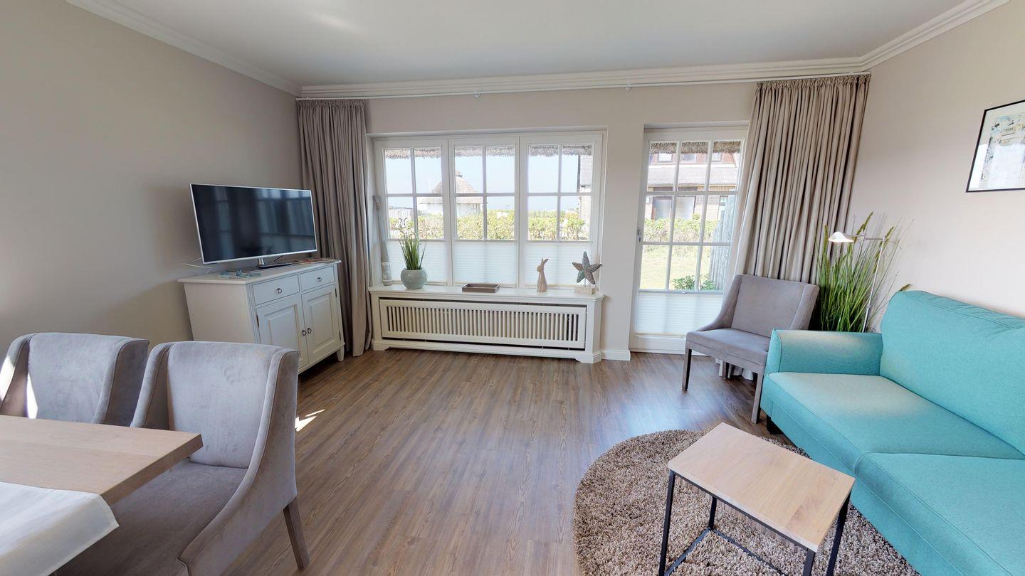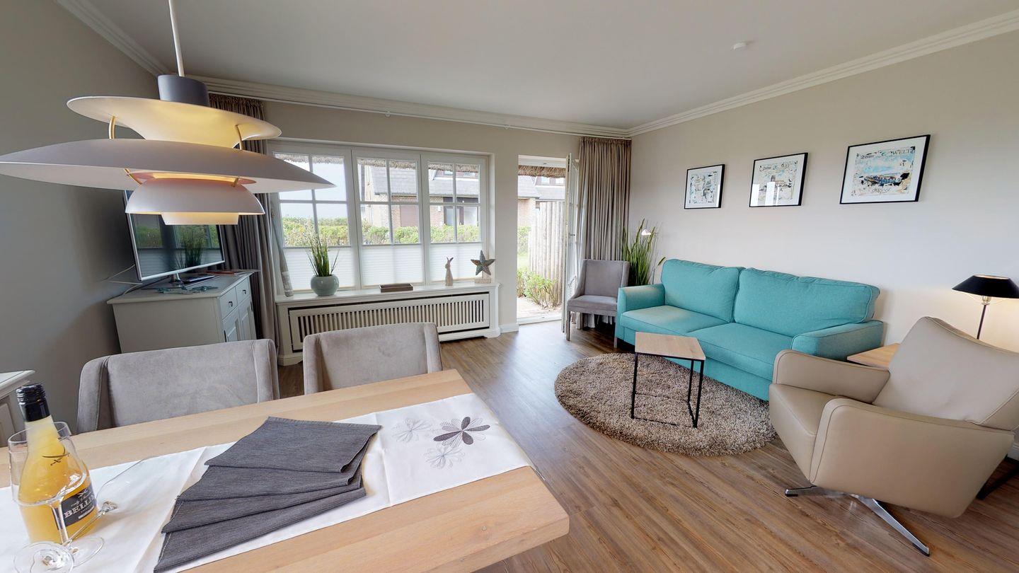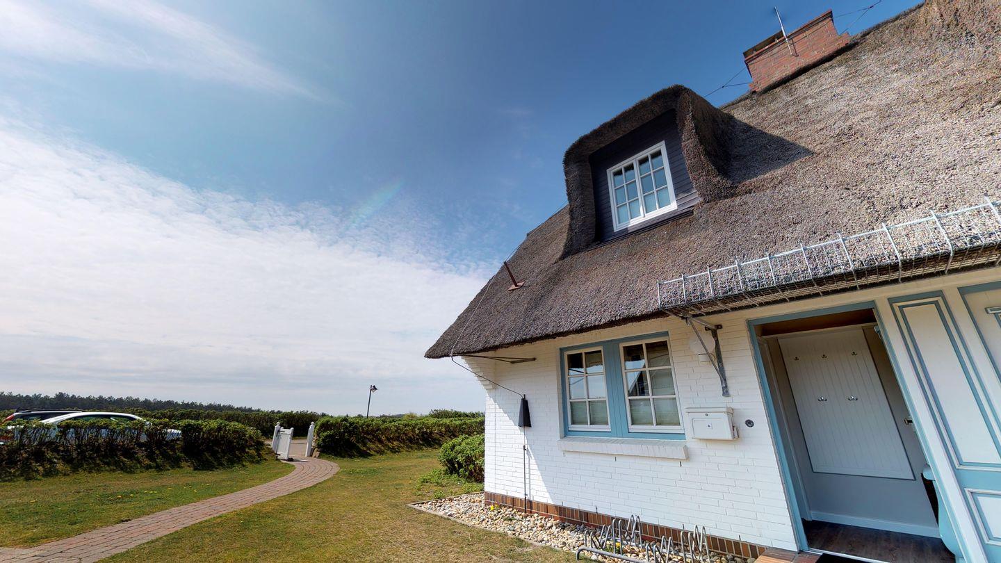 Willkommen im Reetdach-Hausteil 1 des Landhauses Arnika, Ihrem malerischen Refugium für den perfekten Sylturlaub. Hier erleben Sie eine traumhafte Aussicht auf das Meer, die Dünen und die Heidelandschaft – ein wahres Bilderbuchpanorama. Das Hausteil beeindruckt mit einer großzügigen Südwest-Eckterrasse, die mit hochwertigen Gartenmöbeln ausgestattet ist.