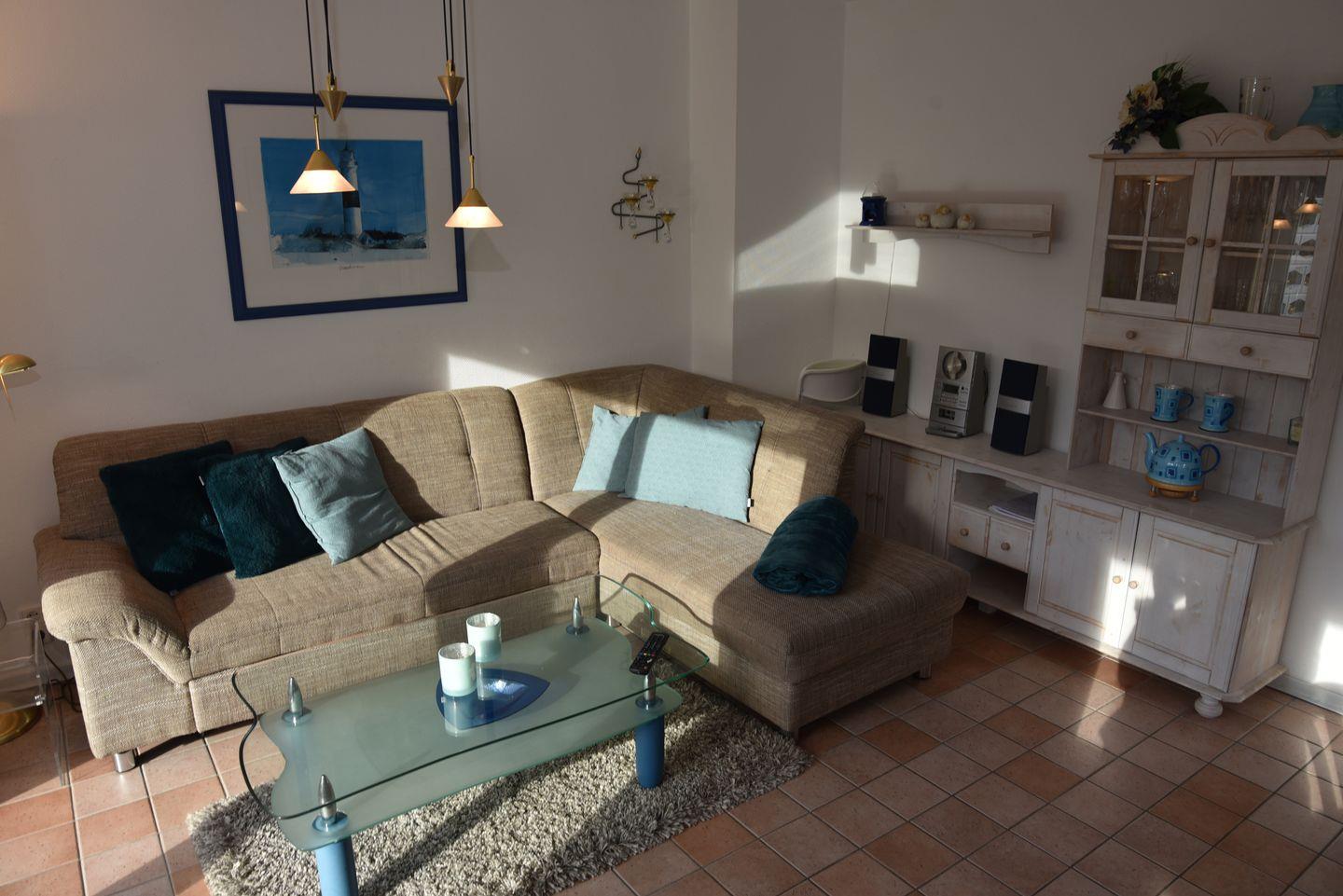Das geräumige Erdgeschoss verfügt über einen großzügigen Wohnbereich, der durch seine Größe besticht und direkten Zugang zur sonnigen Südterrasse mit Strandkorb und stilvollen Gartenmöbeln bietet. Die voll ausgestattete Küchenzeile und die gemütliche Essecke laden zu gemeinsamen Mahlzeiten ein. Ein modernes Duschbad komplettiert das Angebot im Erdgeschoss.