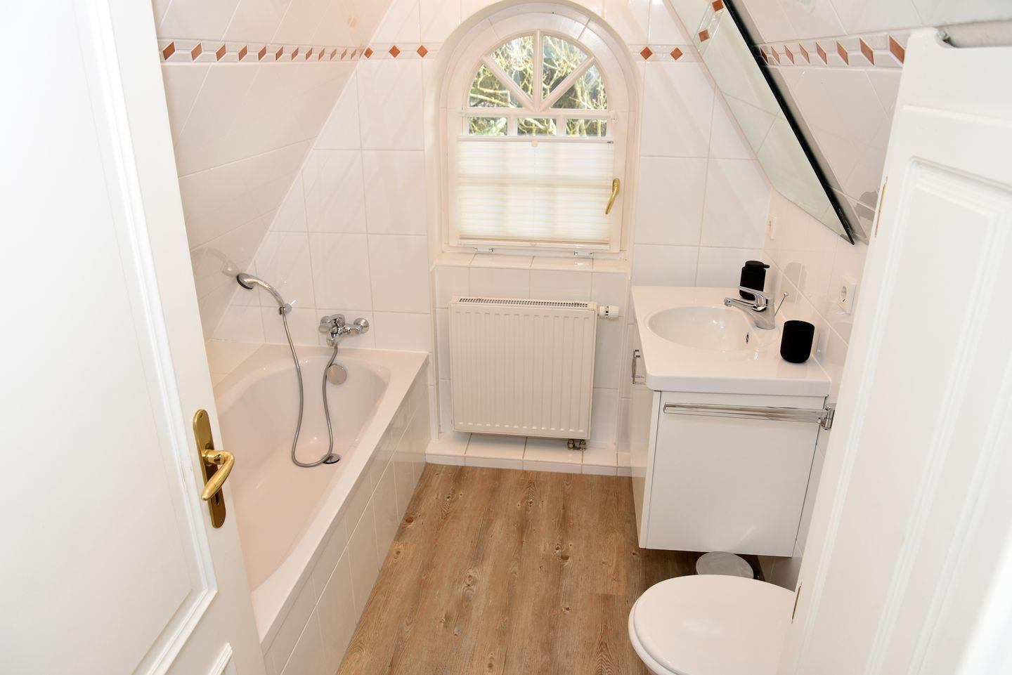Eine Waschmaschine befindet sich im Badezimmer im Obergeschoss.