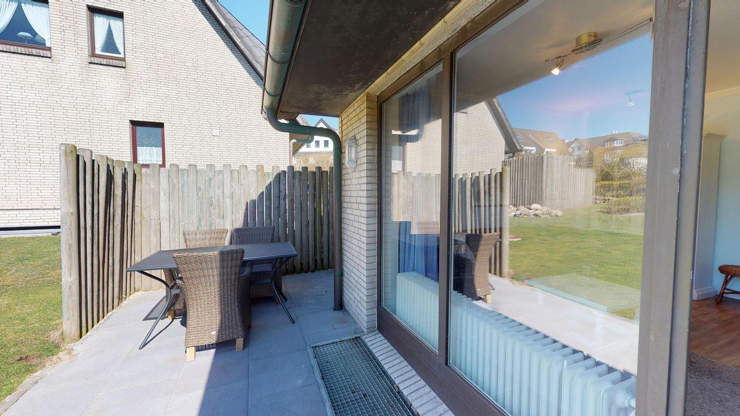 Genießen Sie die Sonne auf der Terrasse, die nach Südwesten ausgerichtet ist und mit bequemen Gartenmöbeln sowie einem Strandkorb ausgestattet ist. Hier können Sie entspannen und die frische Nordseeluft genießen.