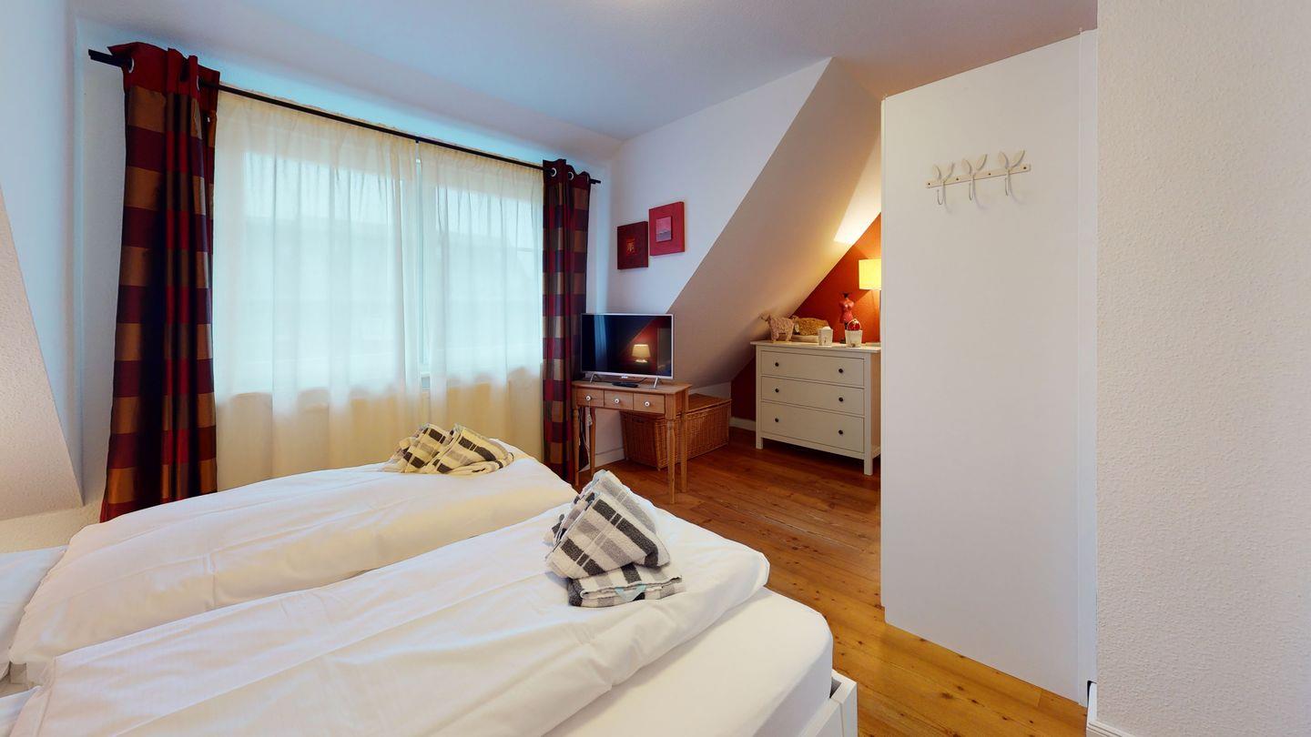 Im Obergeschoss erwarten Sie ein behaglicher Doppelschlafraum sowie zwei Schlafzimmer mit Einzelbetten und einem Balkon, perfekt für ruhige Momente im Freien. Ein weiteres Duschbad komplettiert das Angebot dieses charmanten Hausteils.