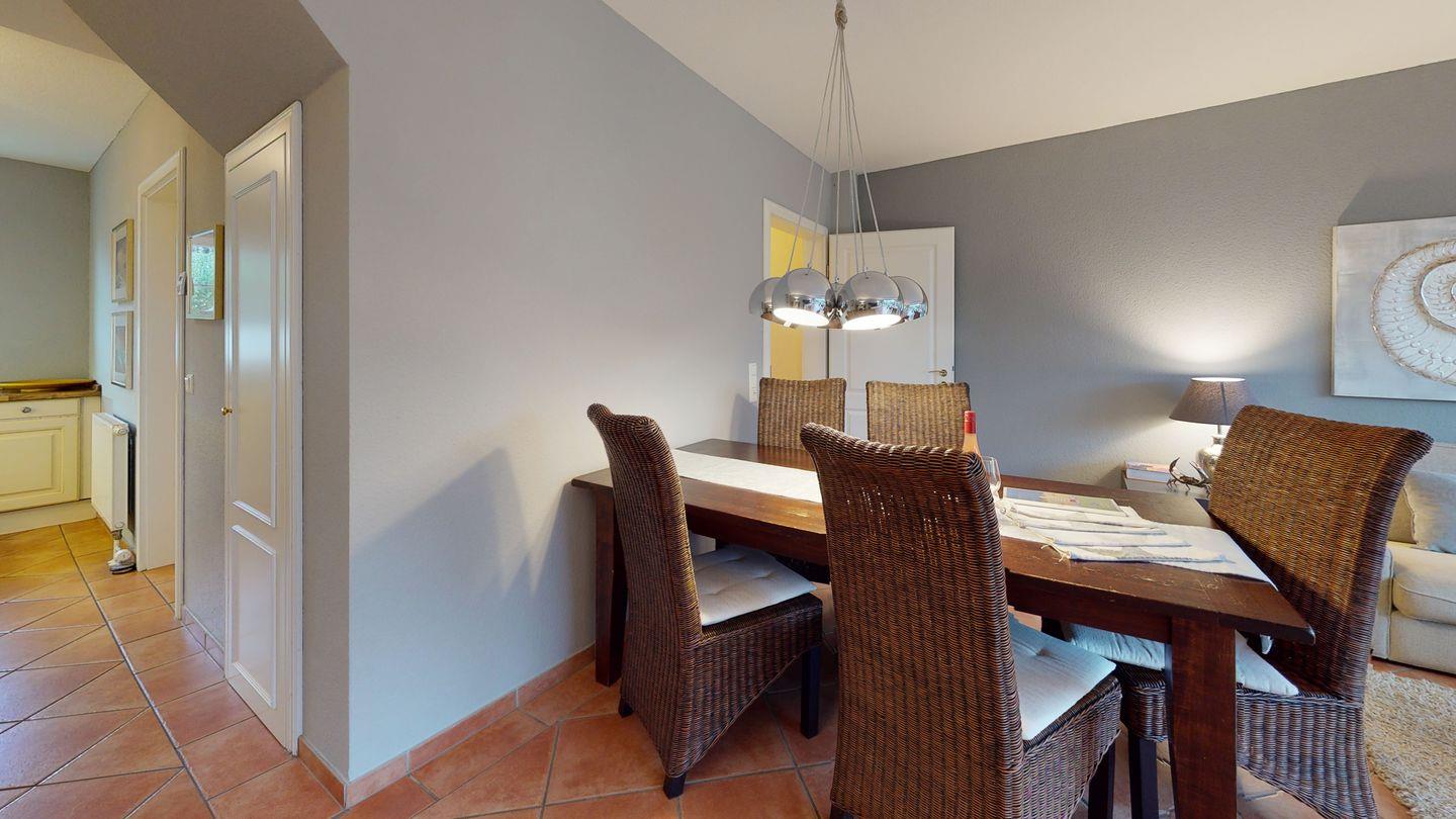 Willkommen in diesem wunderschönen Hausteil, wo Gemütlichkeit und Helligkeit Hand in Hand gehen. Das außergewöhnlich helle Wohnzimmer empfängt Sie mit zwei einladenden Sofas und einem großzügigen Esstisch, perfekt für gesellige Abende. Genießen Sie die Sonne auf der Terrasse nach Süden, ausgestattet mit einem gemütlichen Strandkorb und stilvollen Gartenmöbeln.
