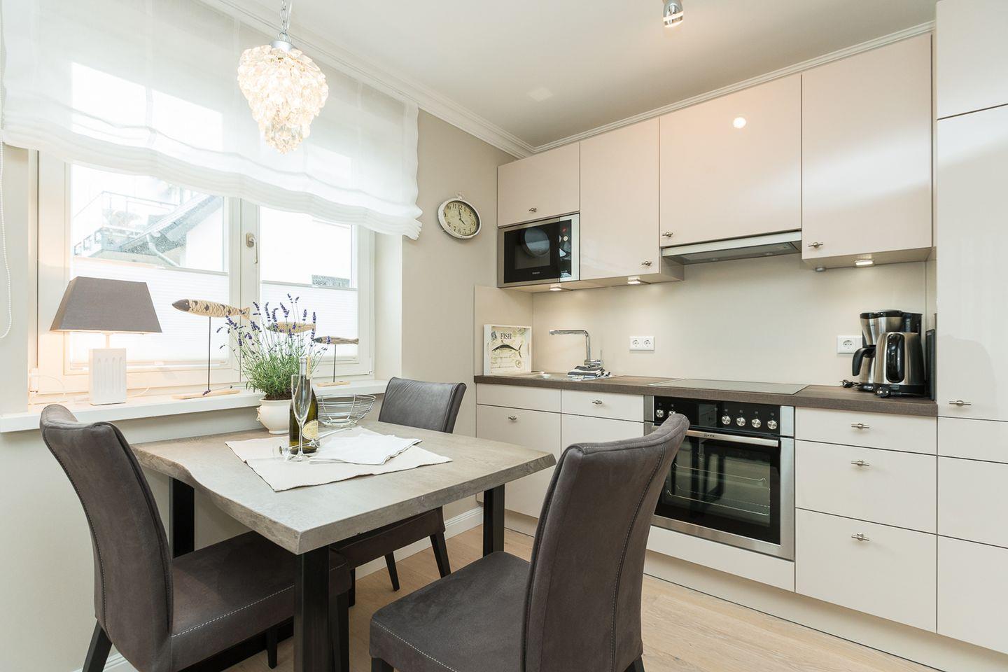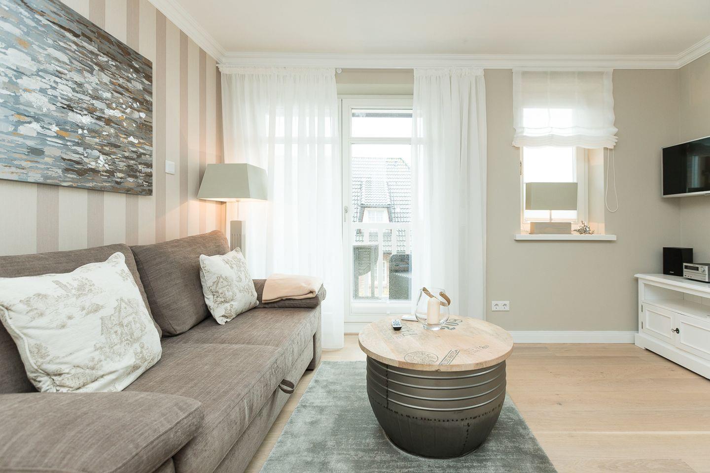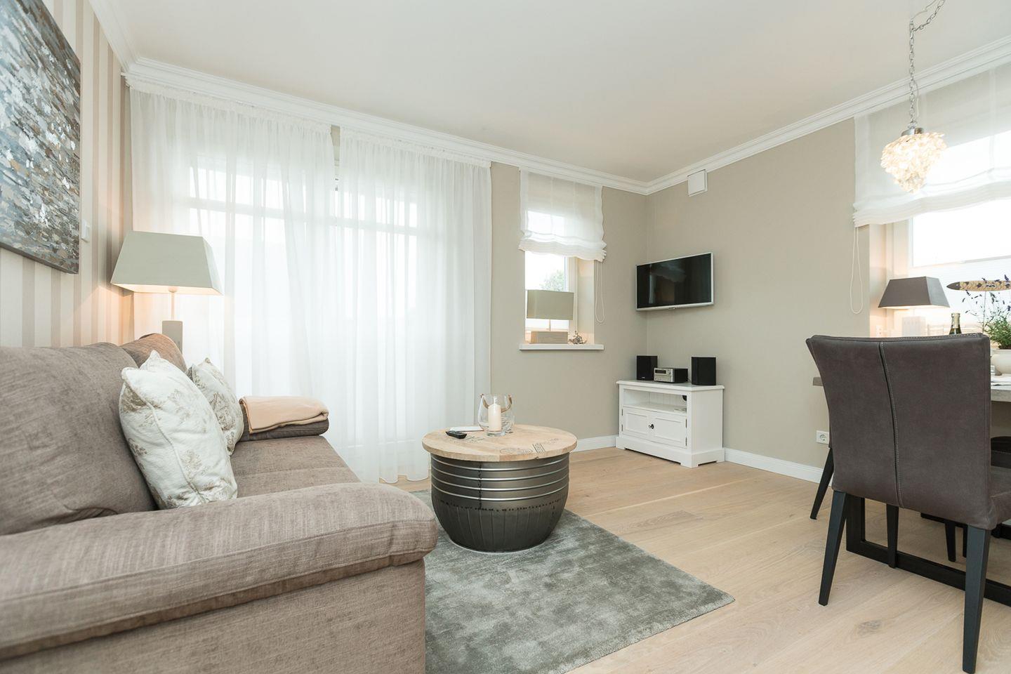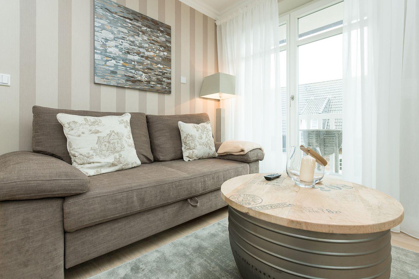Die außergewöhnlich gestaltete Obergeschoss-Endwohnung bietet auf etwa 45 qm Platz für 3 Personen. Sie verfügt über einen Doppelschlafraum, einen Einzelschlafraum und ein stilvolles Duschbad/WC, alles auf einer Ebene. Auf dem Südbalkon stehen Ihnen hochwertige Gartenmöbel zur Verfügung. Die elegante Küche fügt sich nahtlos in den Gesamtstil ein, während die Einrichtung des Wohnraums in warmen Erdtönen gehalten ist. Die Bäder sind modern im neuesten Design ausgestattet.