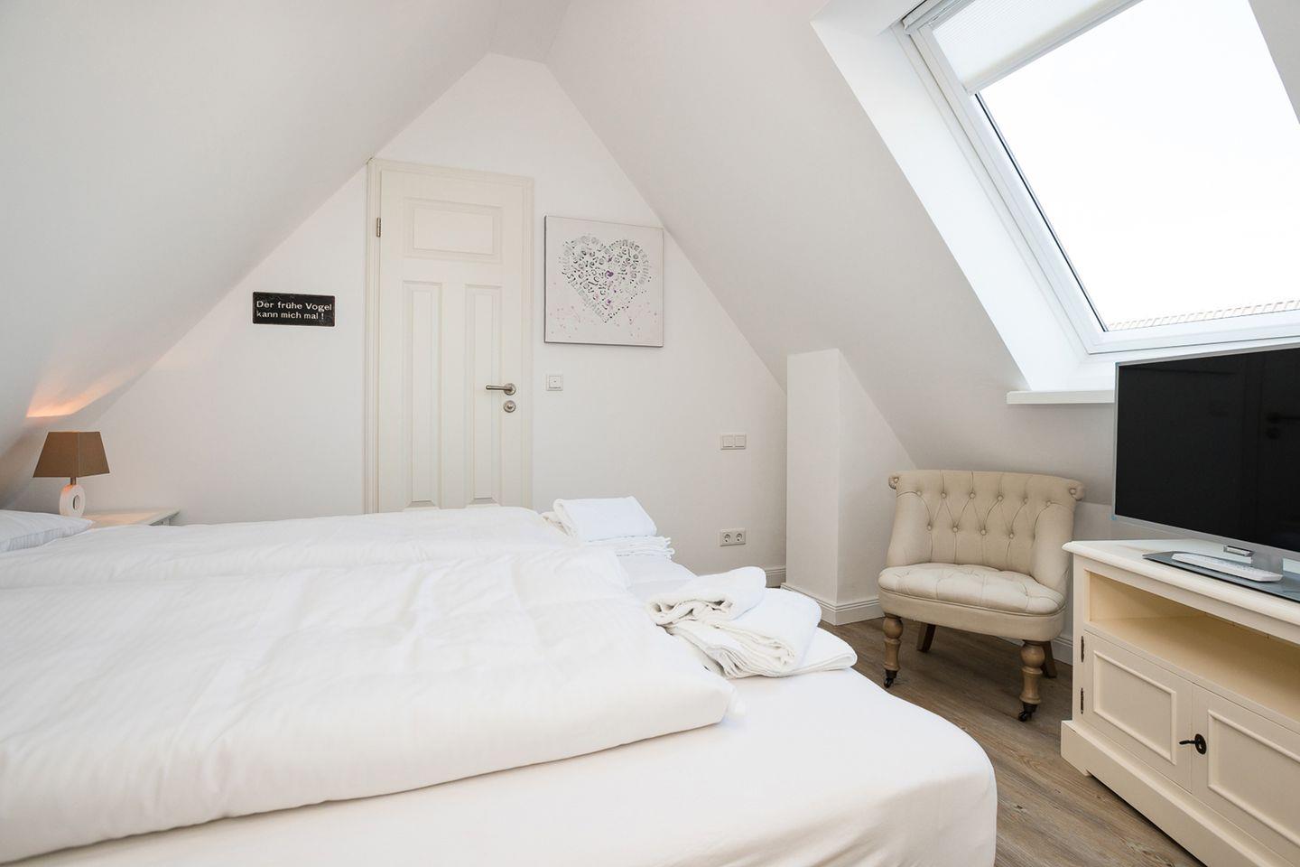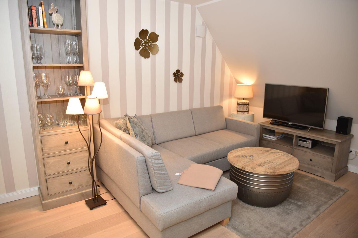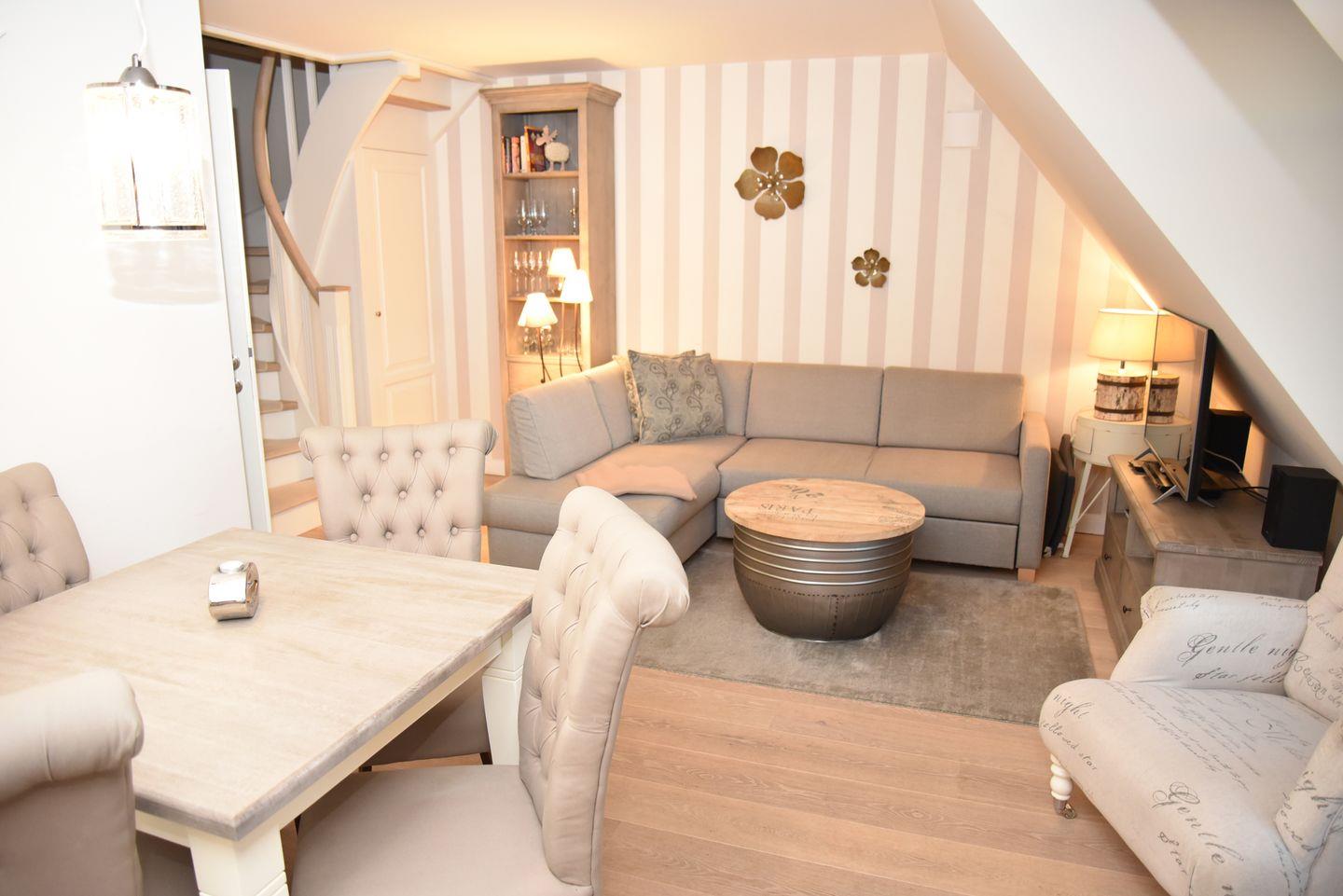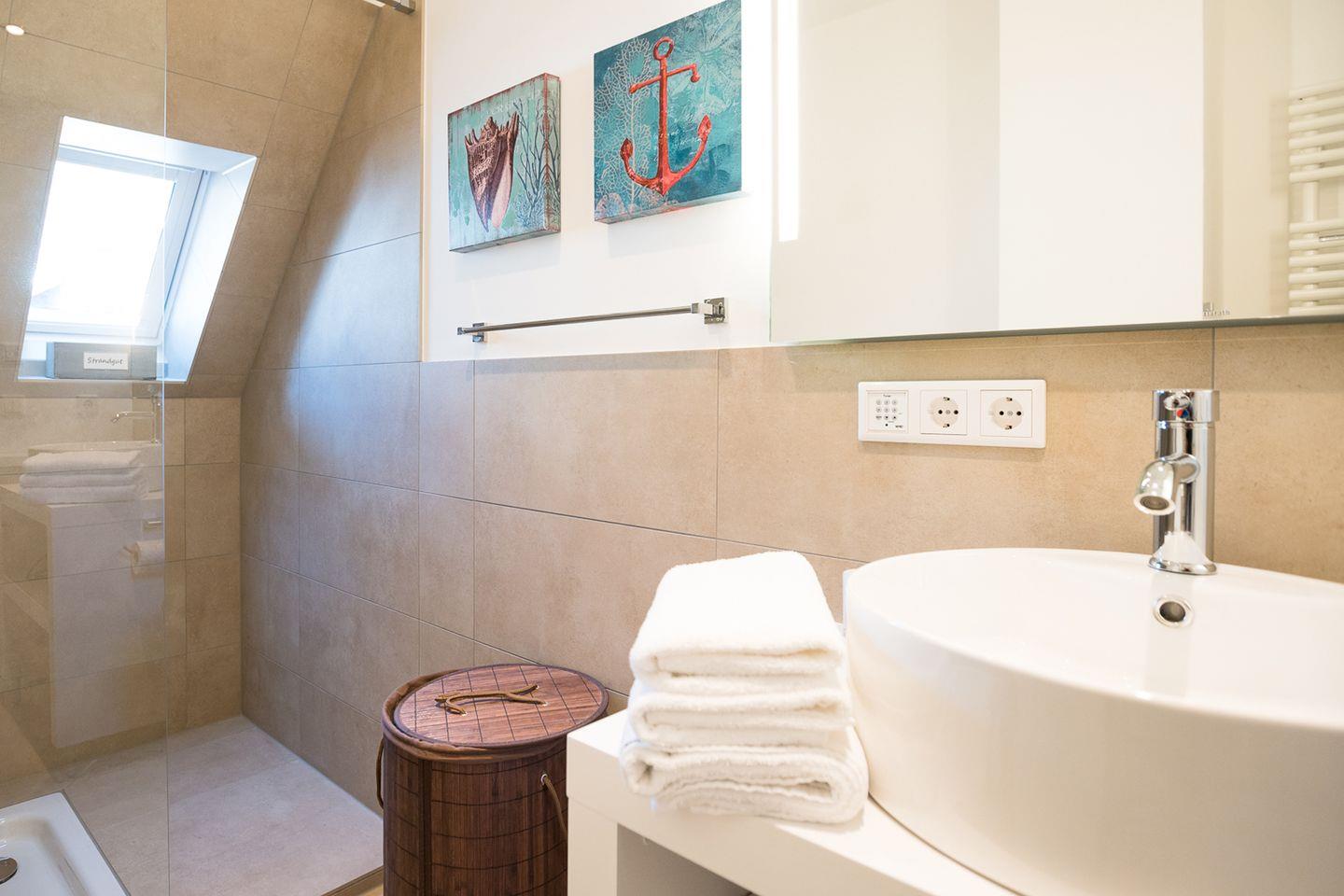 Die exquisit eingerichtete Obergeschoss-/Dachgeschoss-Wohnung mit Südbalkon bietet auf großzügigen 60 qm Platz für bis zu 4 Personen. Im 1. OG befindet sich ein Doppelschlafraum mit zwei Schlafsofas für Kinder sowie ein Duschbad/WC. Im Dachgeschoss gibt es einen weiteren Doppelschlafraum mit eigenem Duschbad/WC. Die elegante Küche fügt sich vorzüglich in den Gesamtstil ein, und die Erdtöne im Wohnraum schaffen eine behagliche Atmosphäre. Die Bäder sind im neuesten Design gestaltet.