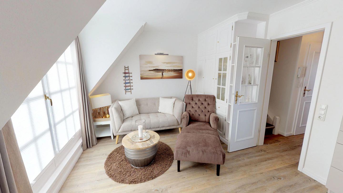 Diese bezaubernde Ferienwohnung erstreckt sich über großzügige 54 qm und verführt mit einem sonnenverwöhnten Südbalkon. Im Obergeschoss erwartet Sie ein behaglicher Wohnraum mit einer bestens ausgestatteten Küchenzeile und einer einladenden Essecke. Der separate Schlafraum bietet zwei Einzelbetten und ist mit einem modernen Dusch-/Badezimmer ausgestattet. Im Dachgeschoss befindet sich ein weiterer Schlafraum, der mit einem komfortablen Doppelbett für erholsame Nächte sorgt.