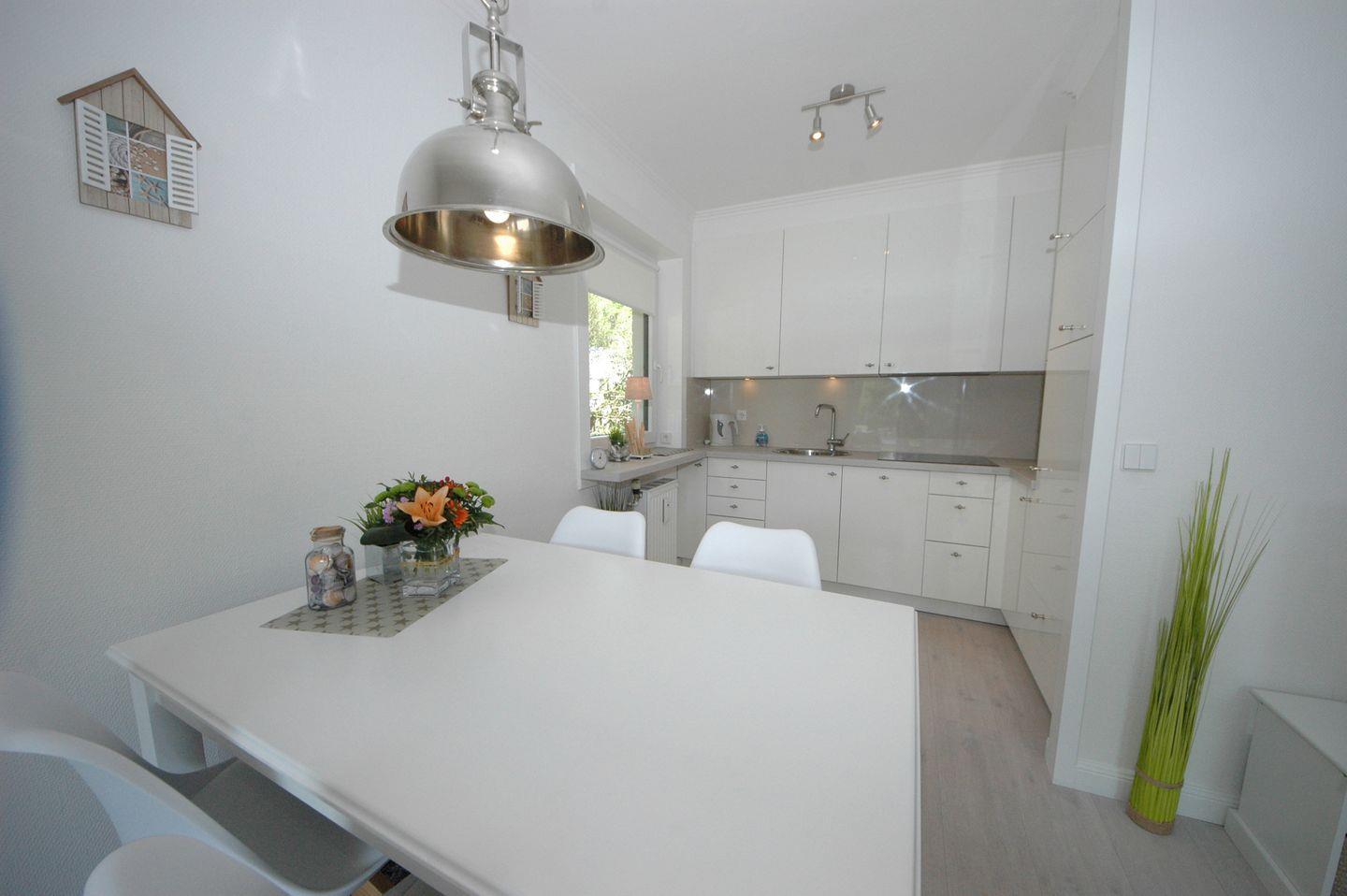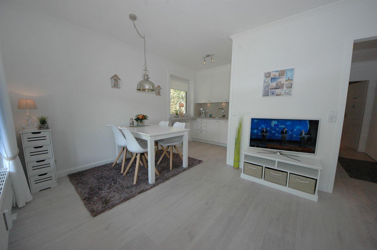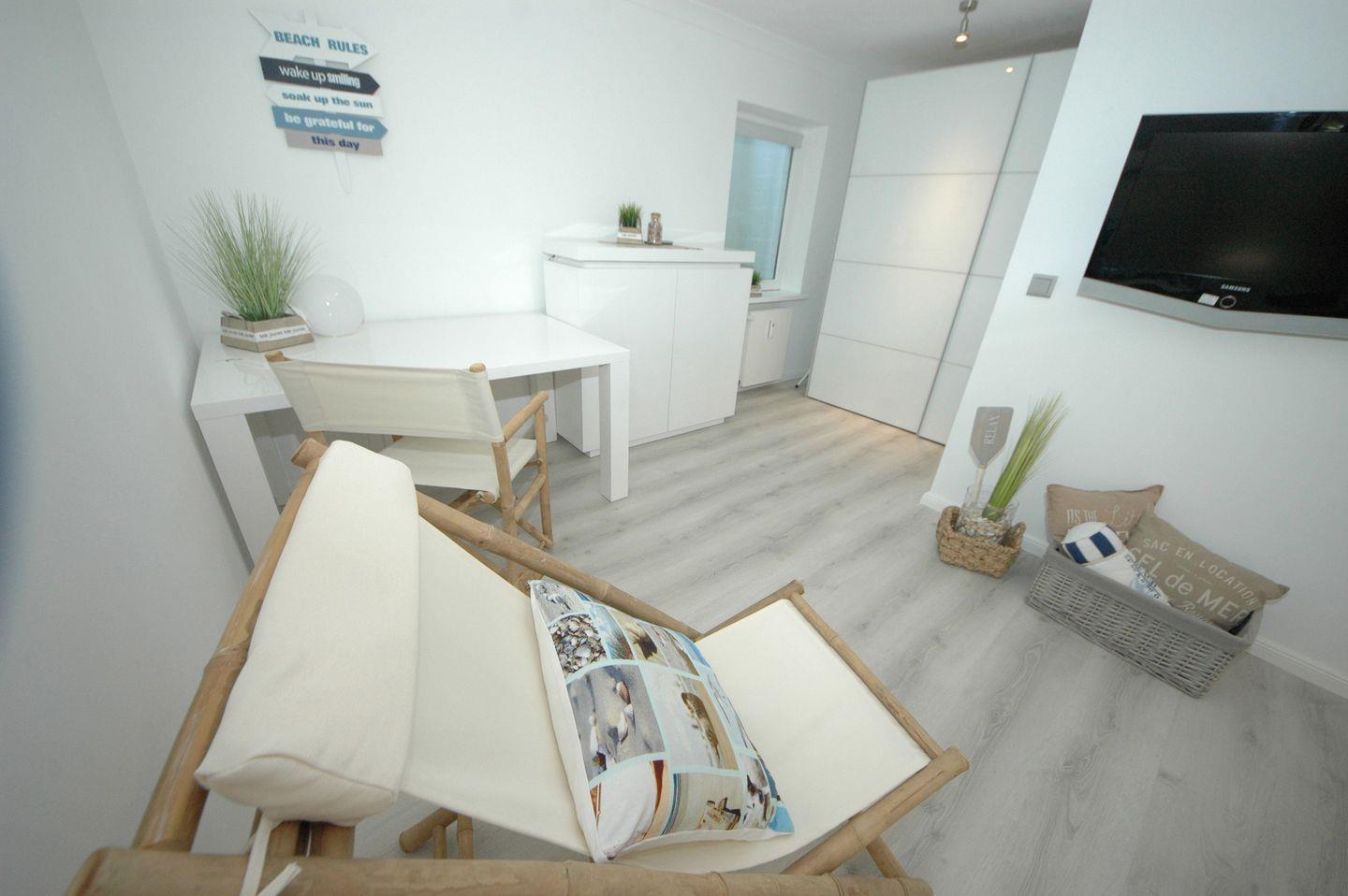 Die Wohnung beeindruckt mit einer sonnigen Südwest-Terrasse, ausgestattet mit einem gemütlichen Strandkorb und einem charmanten Garten – ein Ort mit Flair zum Entspannen. Betreten Sie eine luxuriöse und extravagante Atmosphäre, in der Sie alle modernen Annehmlichkeiten genießen können. Das Erdgeschoss umfasst einen großzügigen Wohnraum mit einer voll ausgestatteten Küchenzeile und einem einladenden Essplatz. Hier finden Sie auch einen Doppelschlafraum und ein ansprechendes Duschbad/WC.