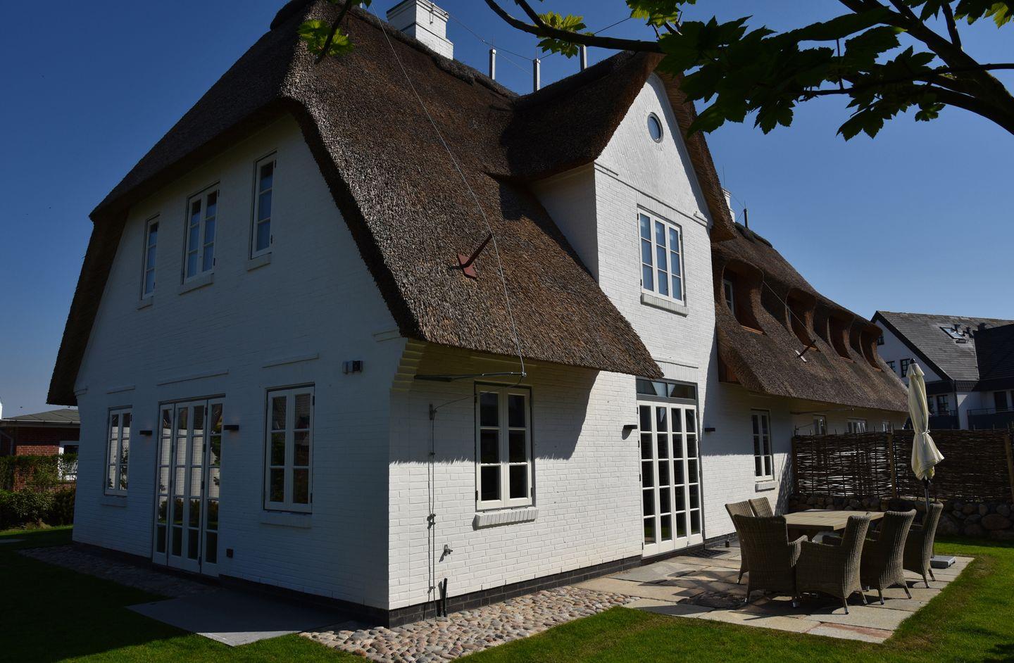 Diese außergewöhnliche Friesenhälfte unter Reet wurde im Jahr 2018 fertiggestellt und verspricht auf etwa 200 qm einen erlesenen und einzigartigen Luxus! Die hochwertige Ausstattung erstreckt sich von edlen Natursteinböden über Eichenvollholzdielen bis zu Parkett-Balkendecken und beinhaltet drei exklusive Natursteinbäder. Die moderne schwarze Designer-Einbauküche mit integriertem Weinkühlschrank bildet das Herzstück, während Sie Ihre Mahlzeiten in der urgemütlichen Essecke genießen. Die Küche ist durch eine exklusive Schmiedestahlkonstruktion vom Wohnbereich getrennt. Das behagliche Wohnzimmer lädt besonders an kühleren Tagen zum Verweilen vor dem offenen Kamin ein.