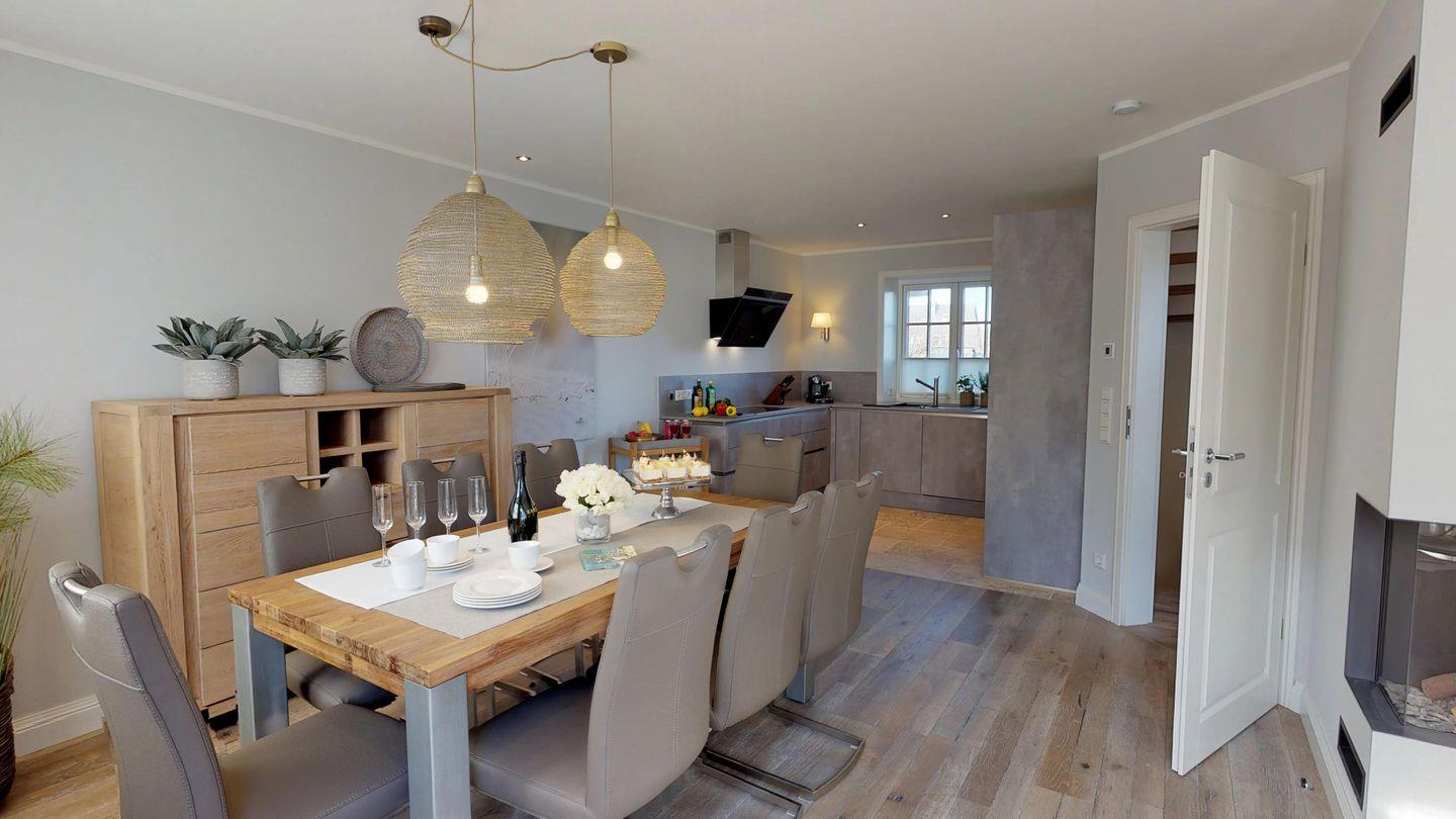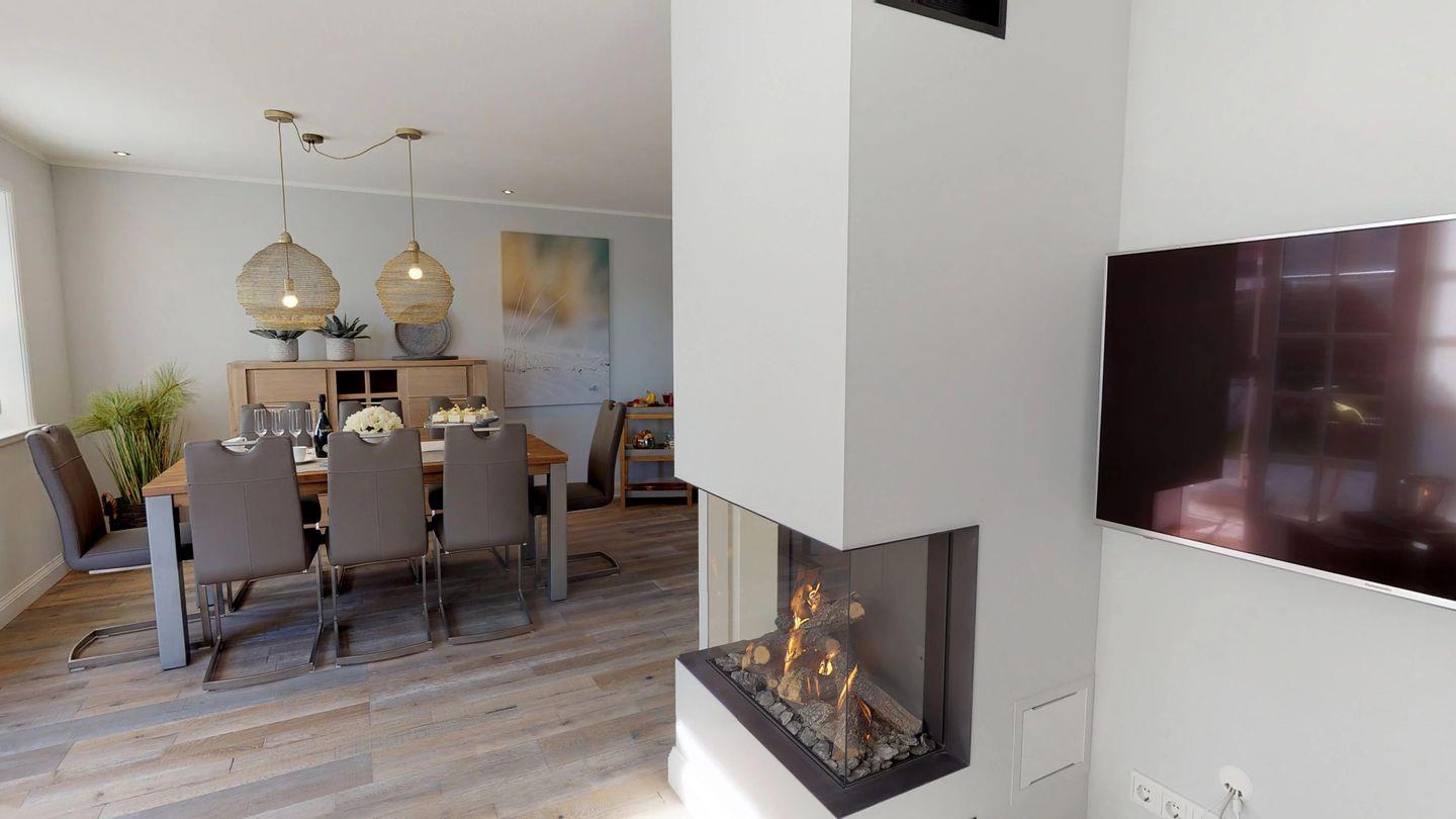 Im Erdgeschoss erwartet Sie eine hochwertige Design-Einbauküche mit großzügigem Essbereich, perfekt für kulinarische Genüsse. Der angrenzende Wohnbereich lädt mit einem behaglichen Gaskamin und einer gemütlichen Wohnlandschaft zum Entspannen ein.