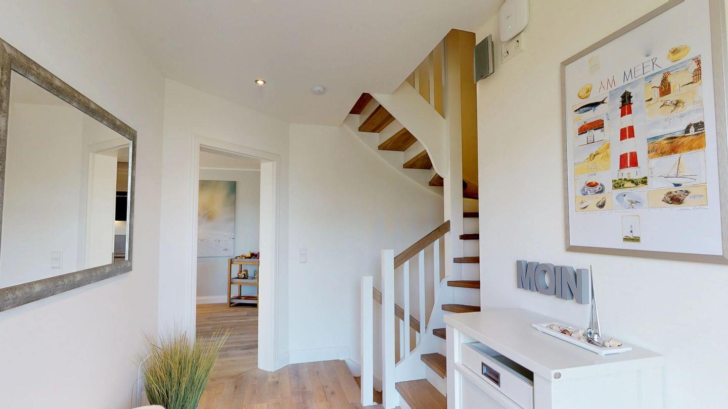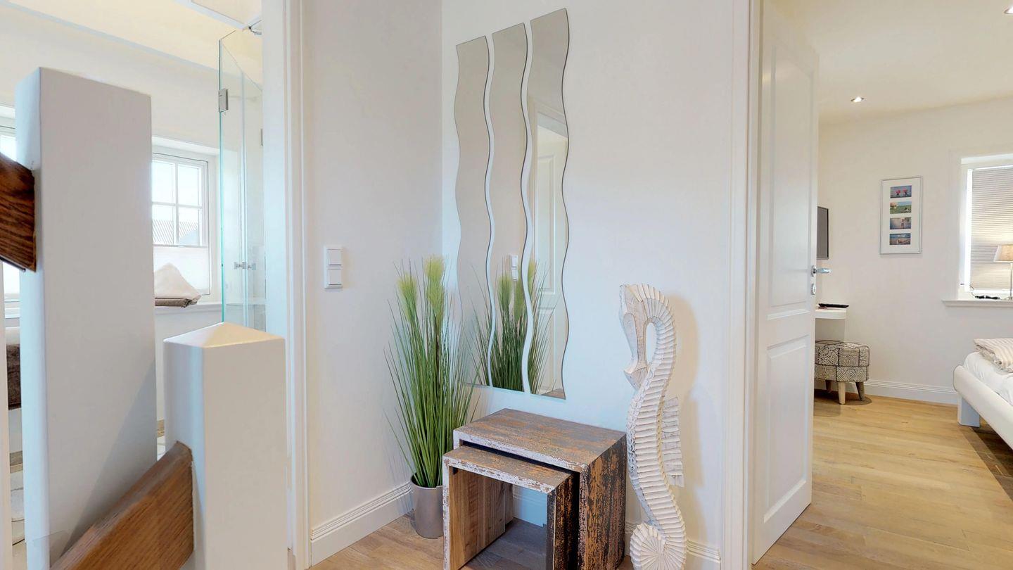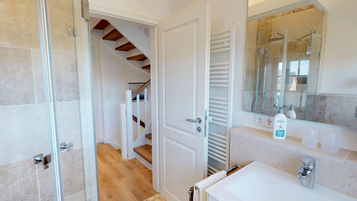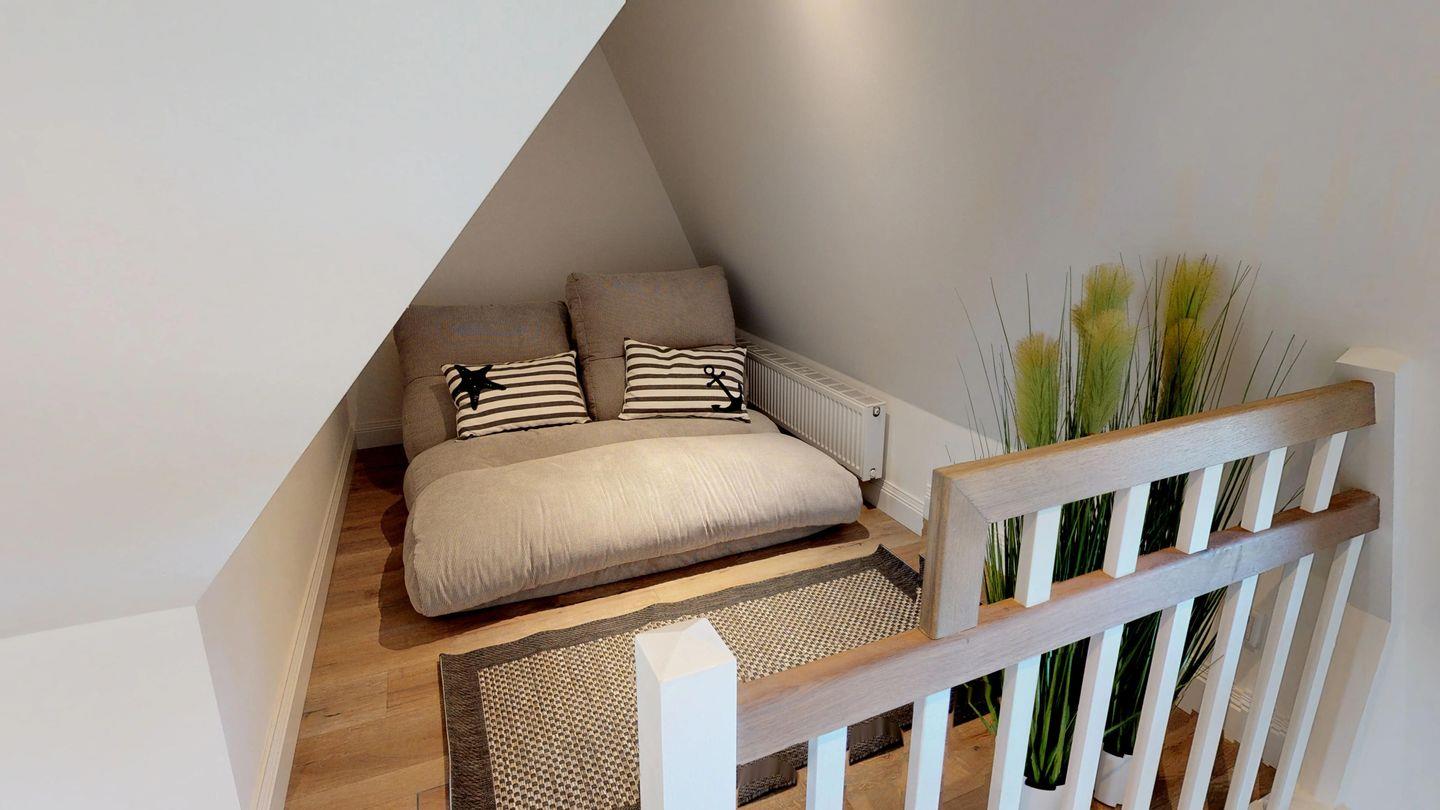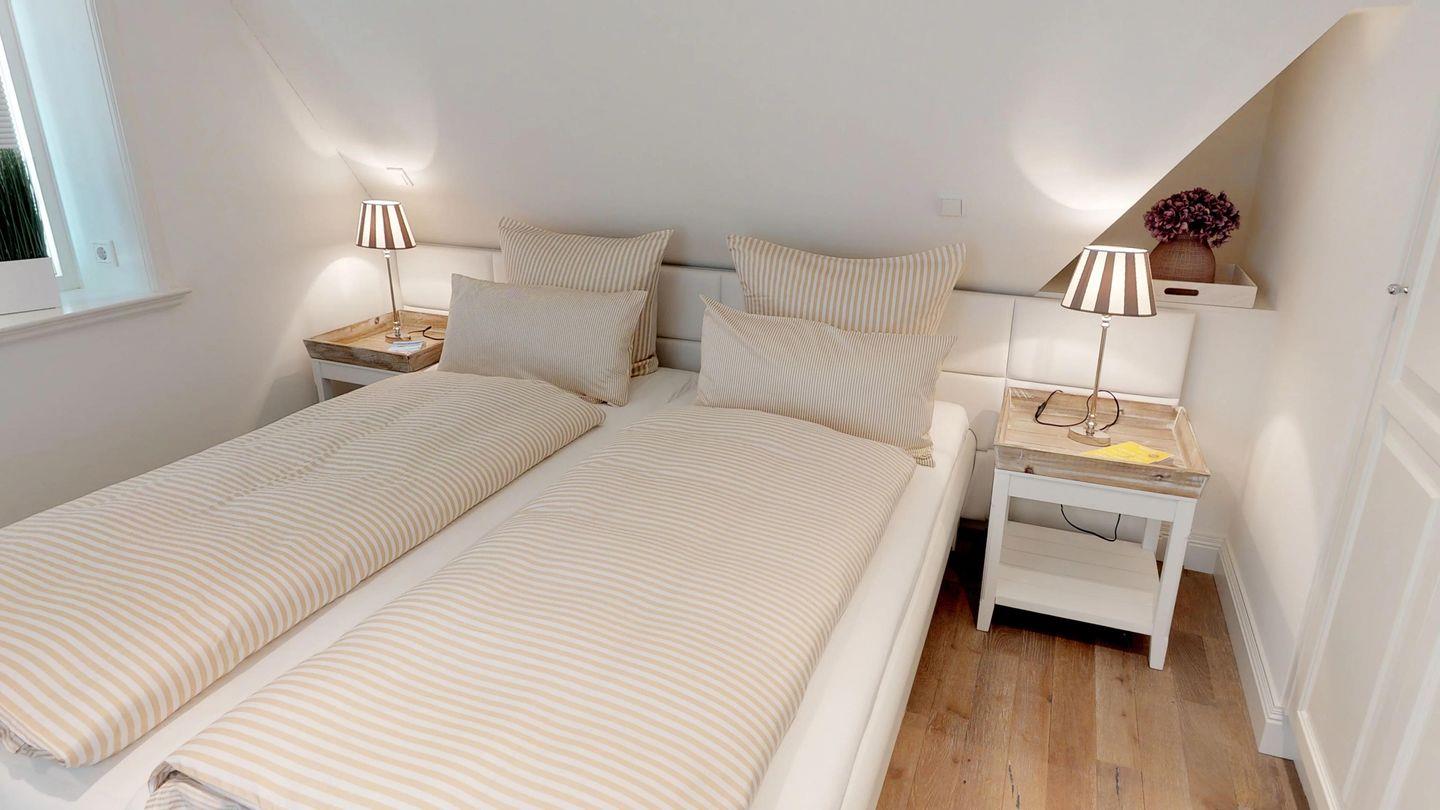 Im Obergeschoss erwarten Sie zwei geschmackvoll gestaltete Schlafräume und zwei moderne Duschbäder, eines davon mit Badewanne. Ein Doppelbett mit Überlänge von 220 cm im Schlafzimmer sorgt für entspannten Schlafkomfort, selbst für