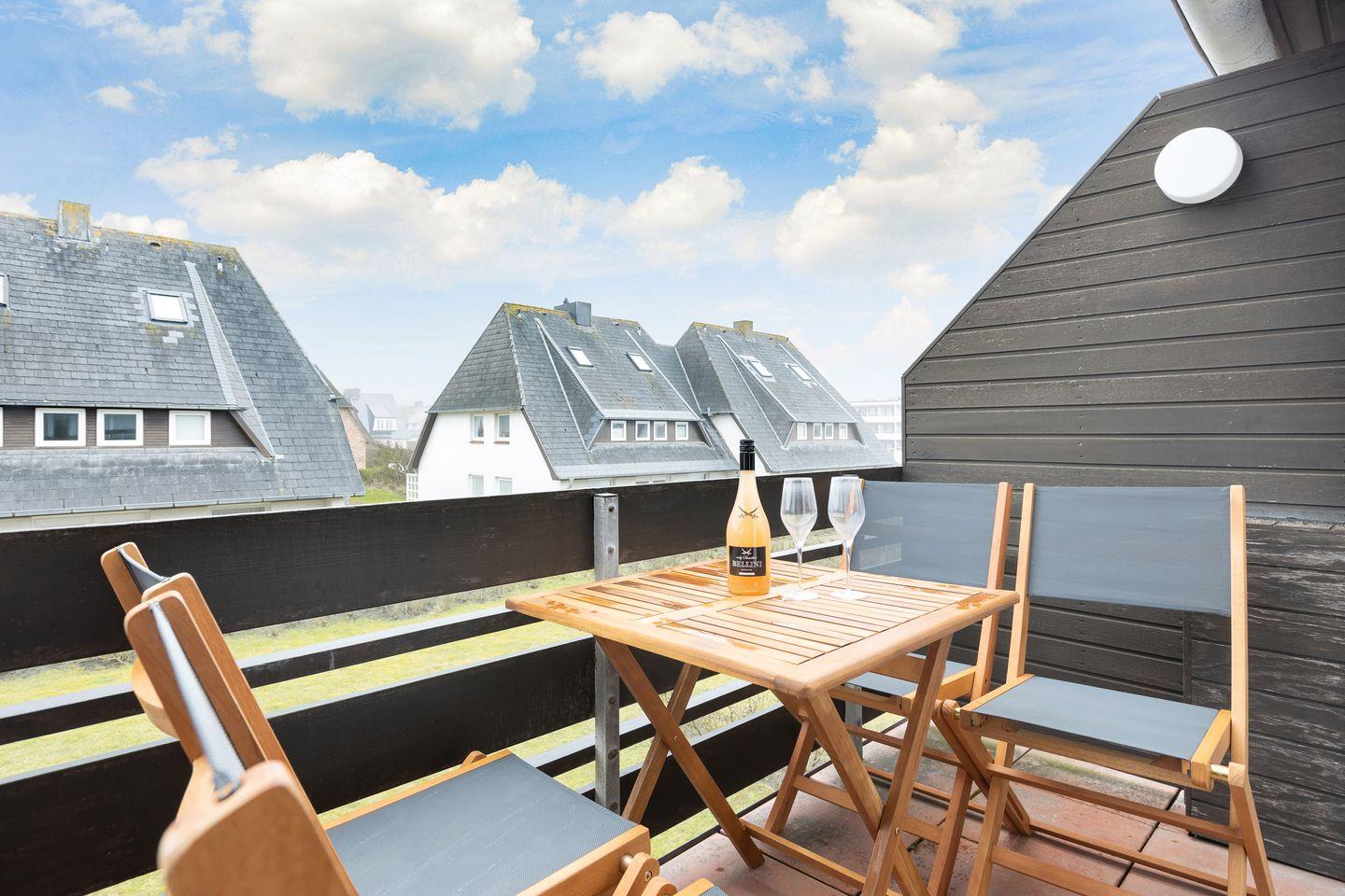 Die ca. 65 qm große Wohnung erstreckt sich über das 1. OG und das Dachgeschoss und bietet eine moderne und gemütliche Atmosphäre. Im 1. OG erwartet Sie ein großzügiger Wohn-/Essbereich mit einer vollausgestatteten Küche, die keine Wünsche offen lässt. Hier können Sie kulinarische Köstlichkeiten zubereiten und sie anschließend am Esstisch genießen. Das angrenzende Duschbad sorgt für zusätzlichen Komfort. Der Südwest-Balkon lädt dazu ein, die frische Meeresluft und die Sonne zu genießen.