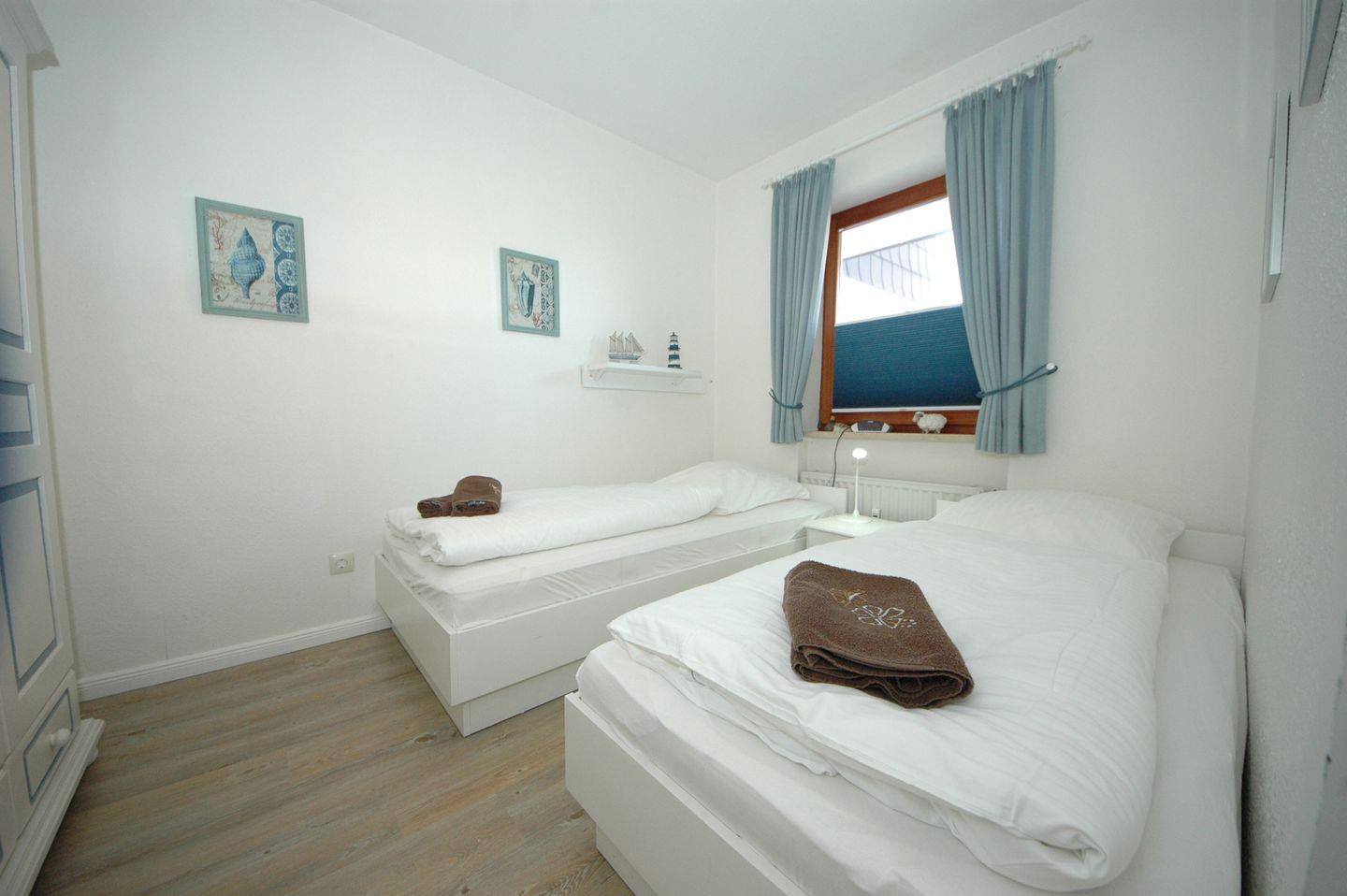 Das Schlafzimmer verfügt über zwei getrennte Betten, die eine erholsame Nachtruhe garantieren. Das frisch renovierte Duschbad bietet modernen Komfort und ist der ideale Ort, um sich nach einem erlebnisreichen Tag zu erfrischen. Ein separates WC sorgt für zusätzliche Bequemlichkeit.